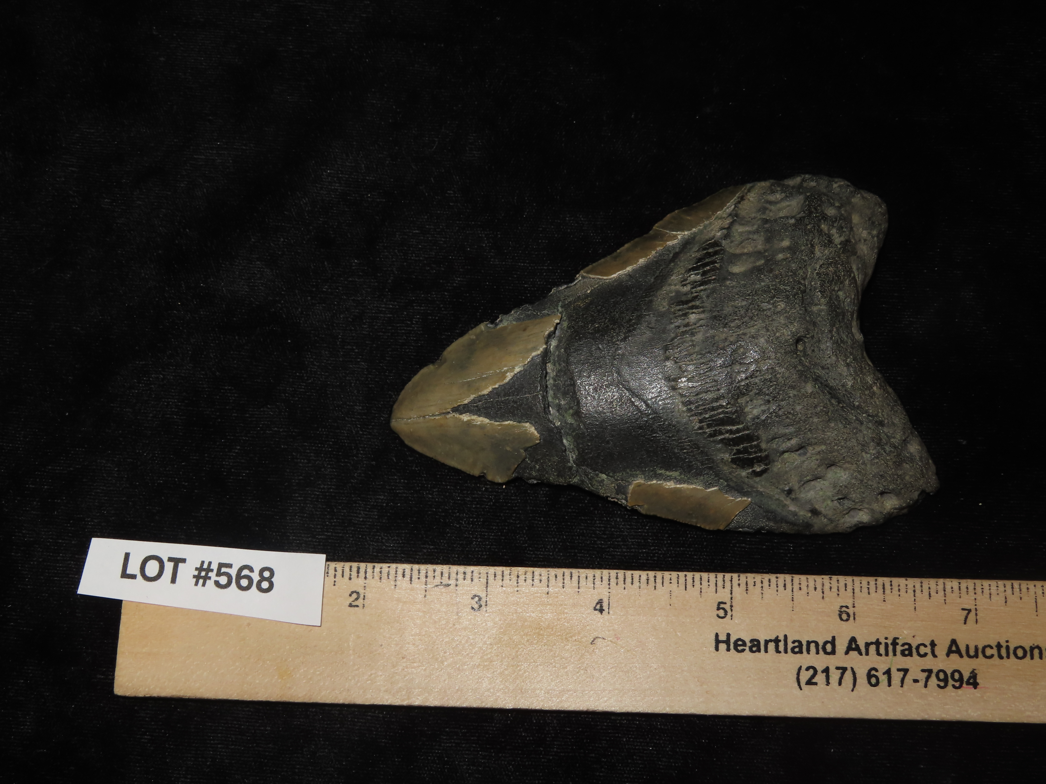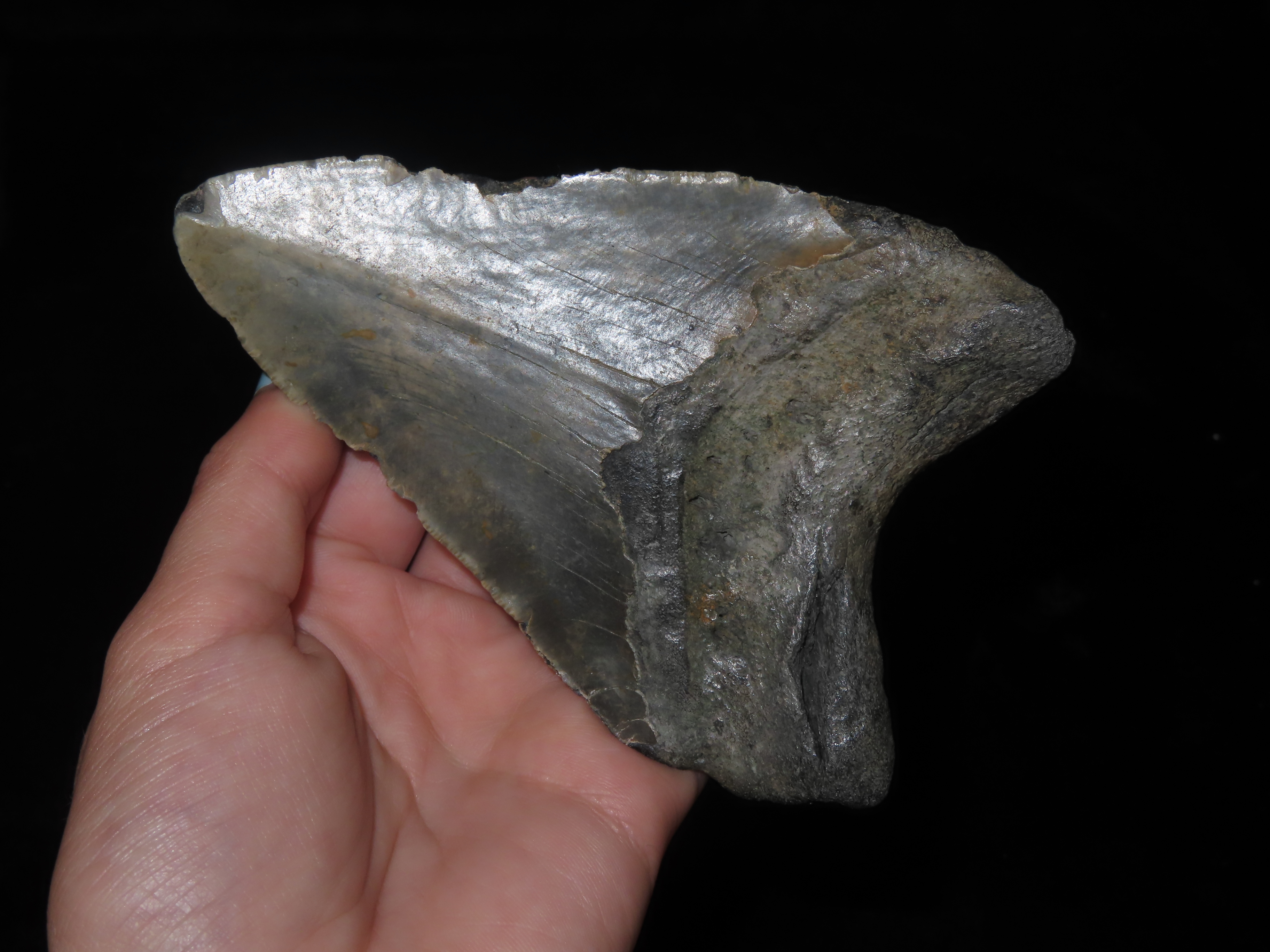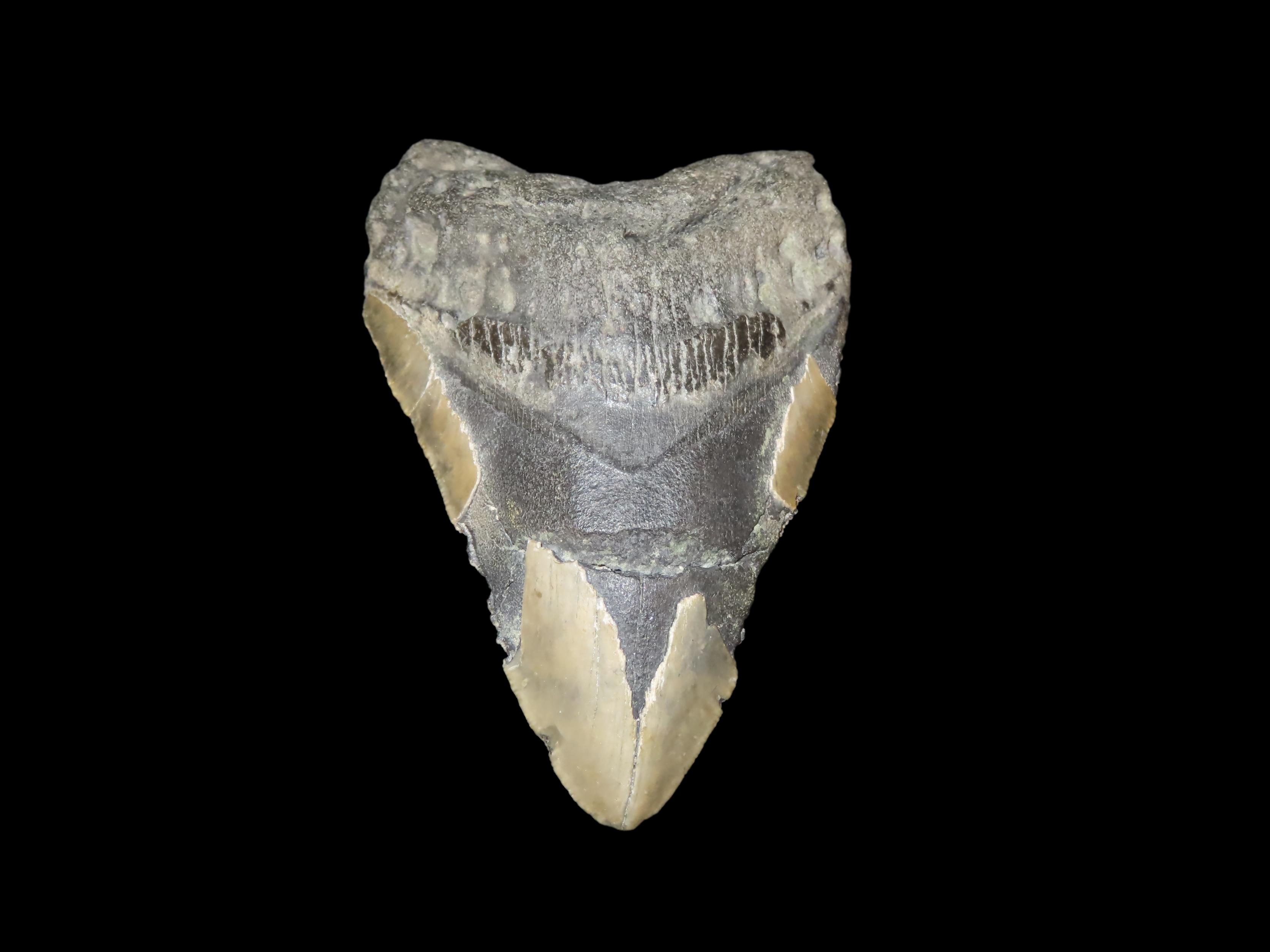 MASSIVE 4 3/4″ Megalodon Shark Tooth, 2.5-23 Million Year Old Fossil found off the coast of the Carolinas. No Repair, No Resto, No Polishing. Great Example!