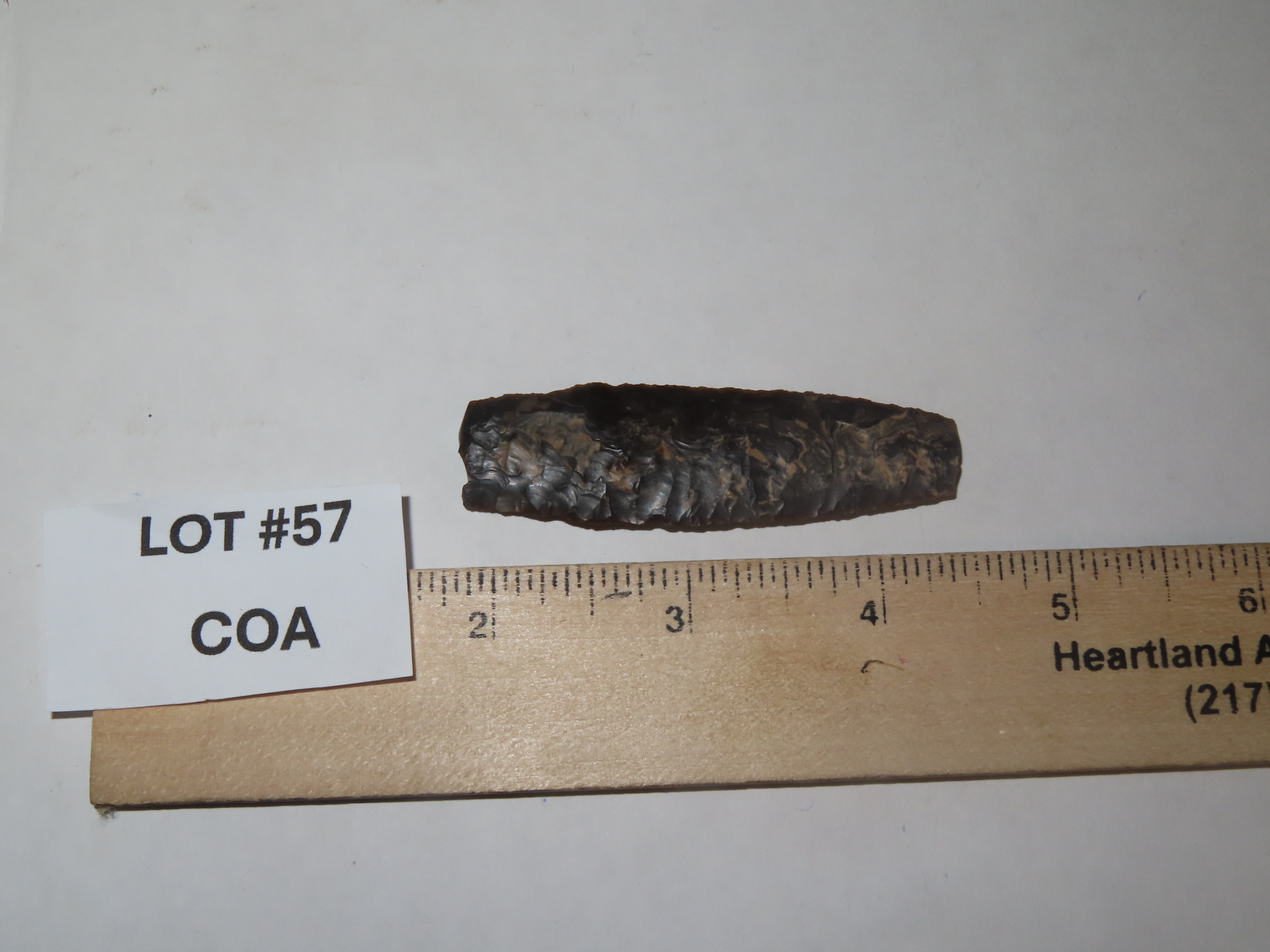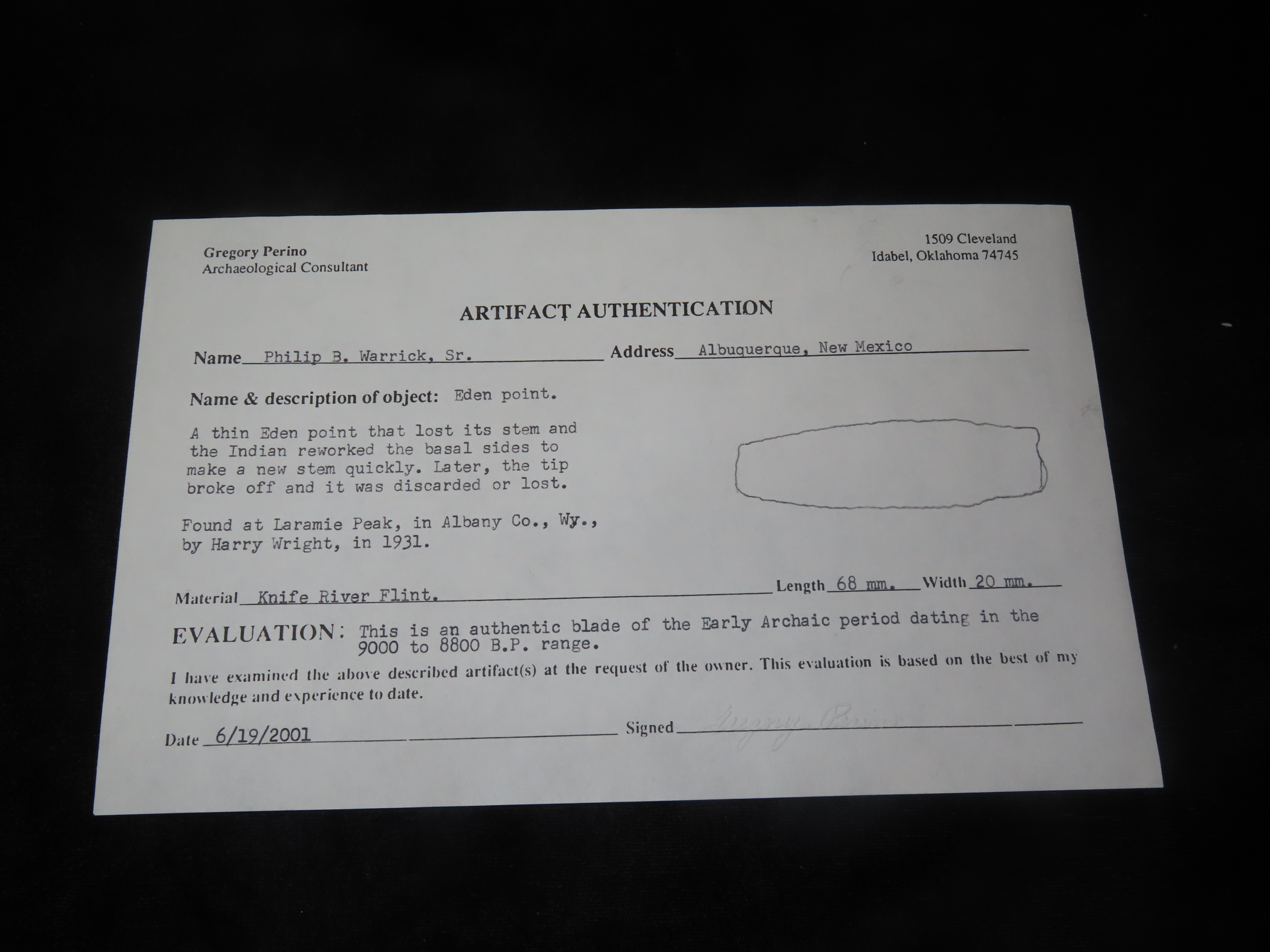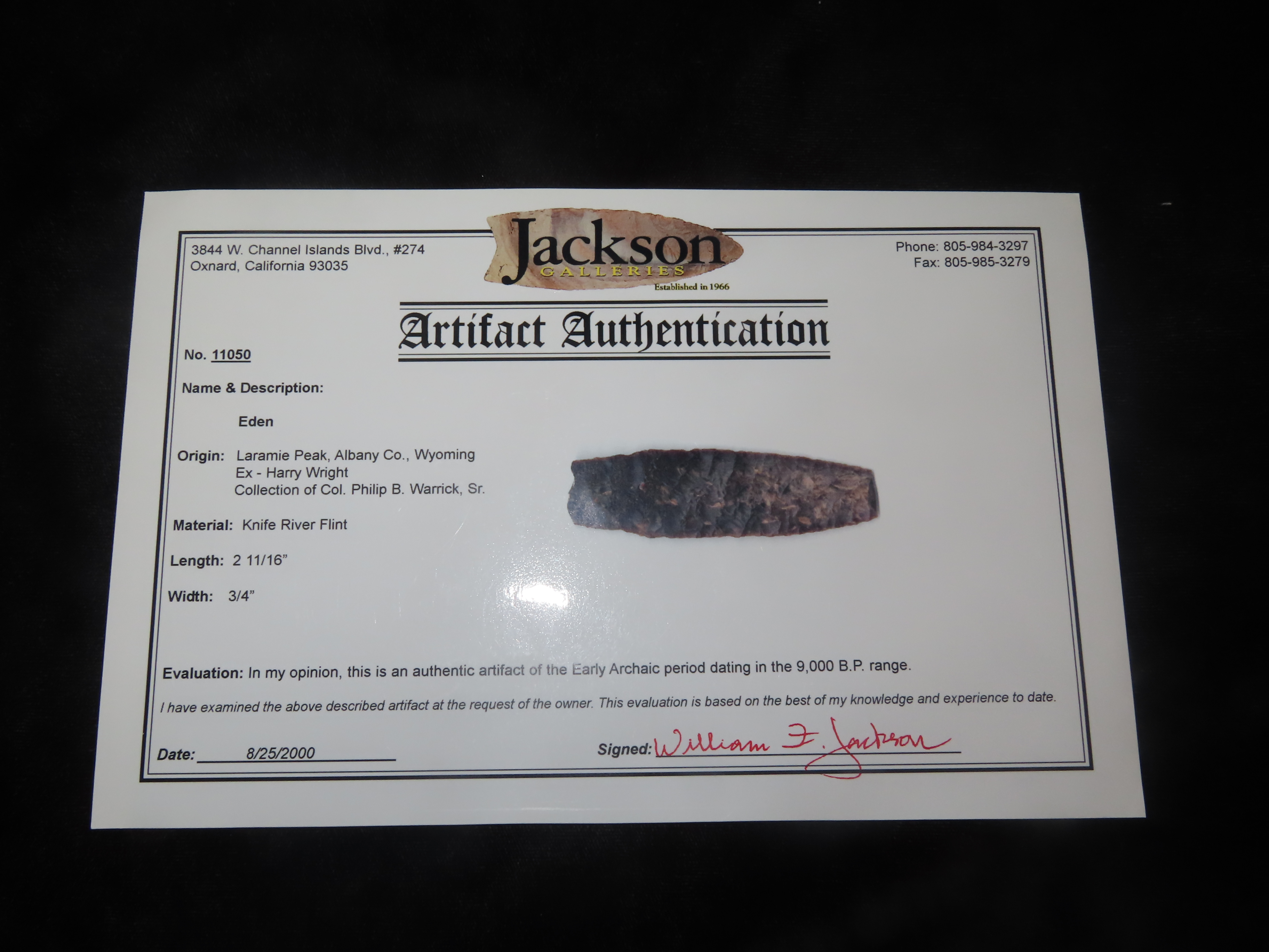 2 11/16″ Knife River Flint Eden, Perino & Jackson COA, Found by Harry Wright in 1931 at Laramie Peak, Albany Co. Wyoming. Ex Col. Philip B. Warrick Sr Collection of Albuquerque New Mexico. Wafer thin and Expertly Flaked Example.