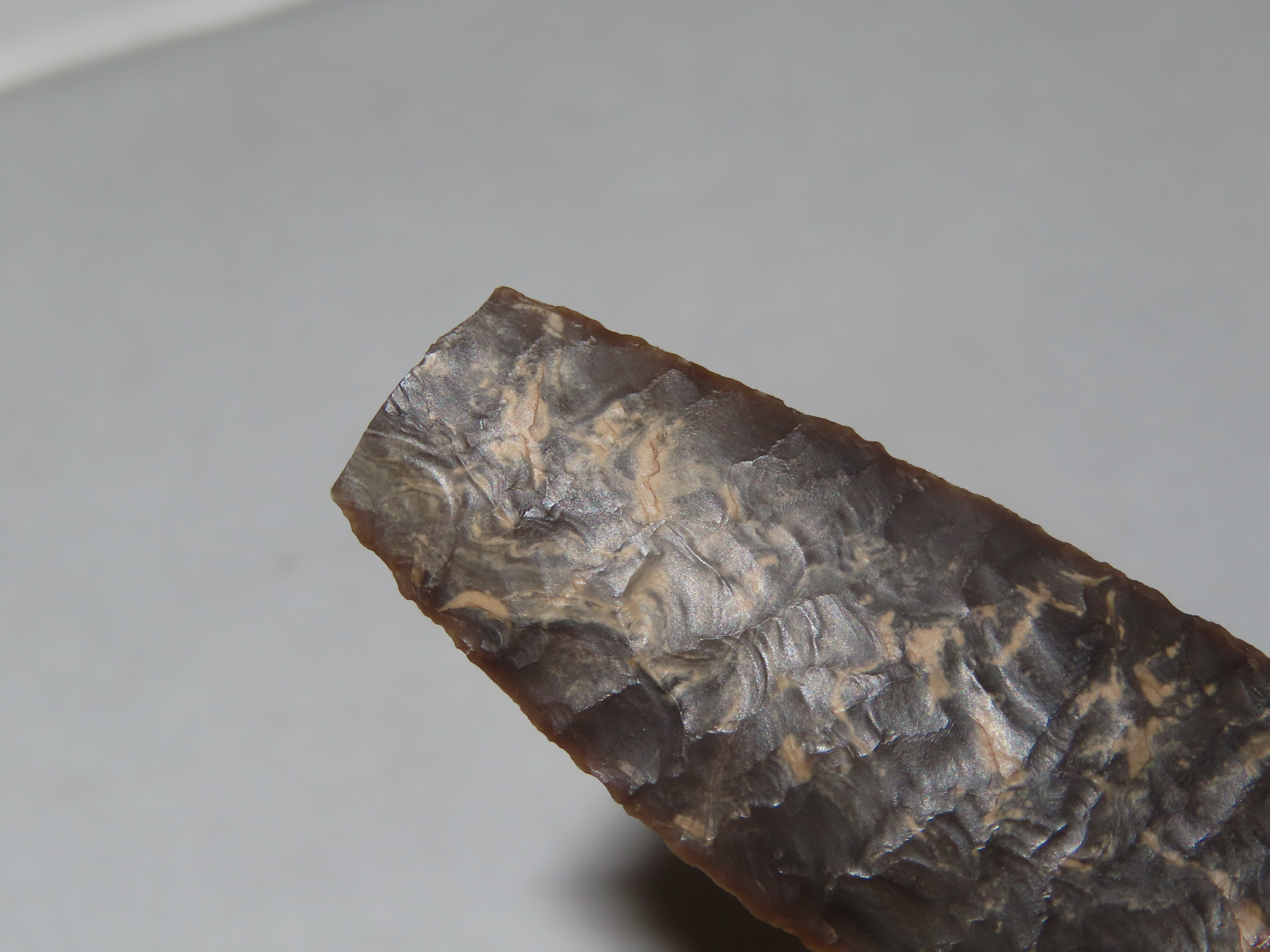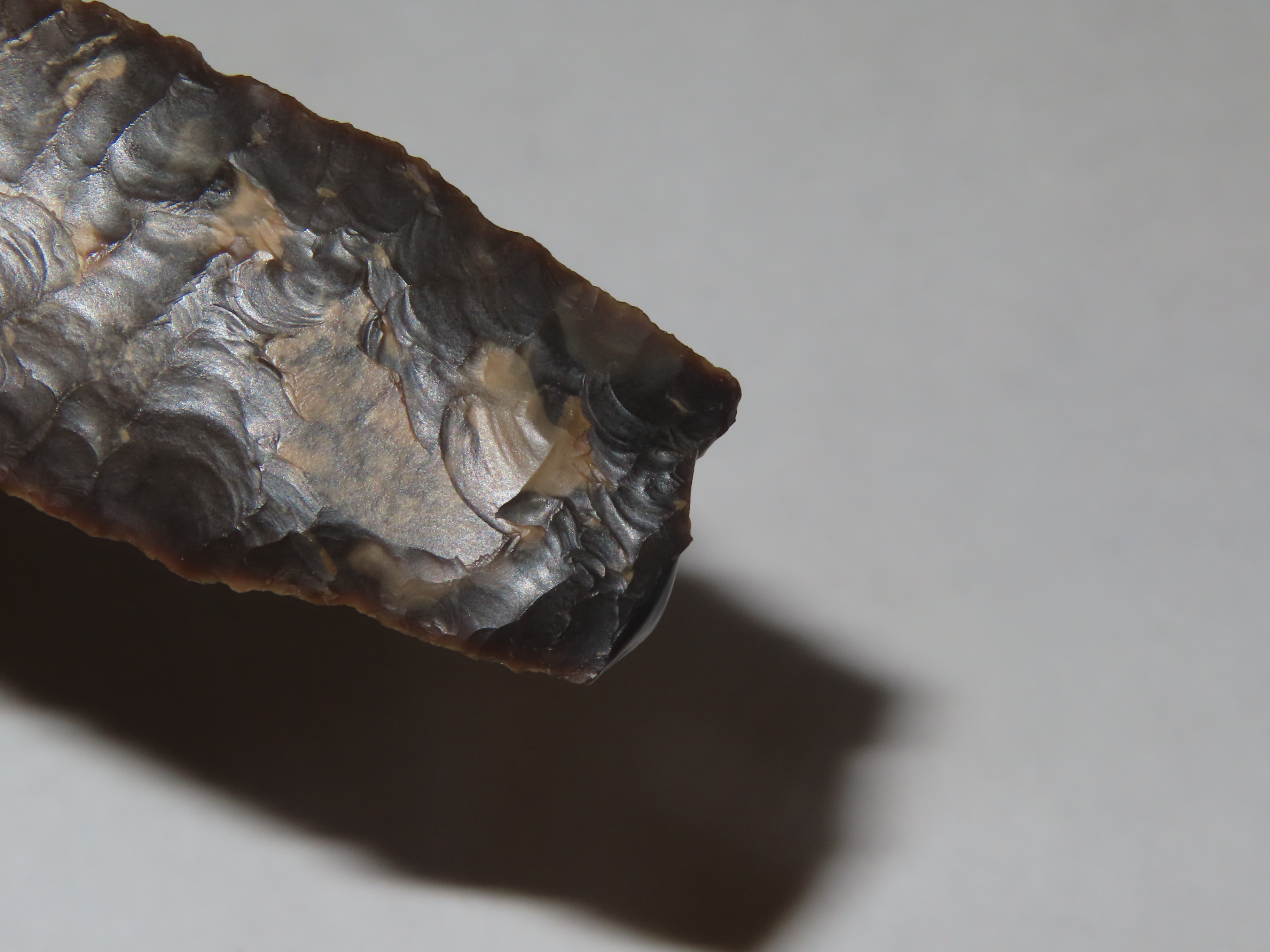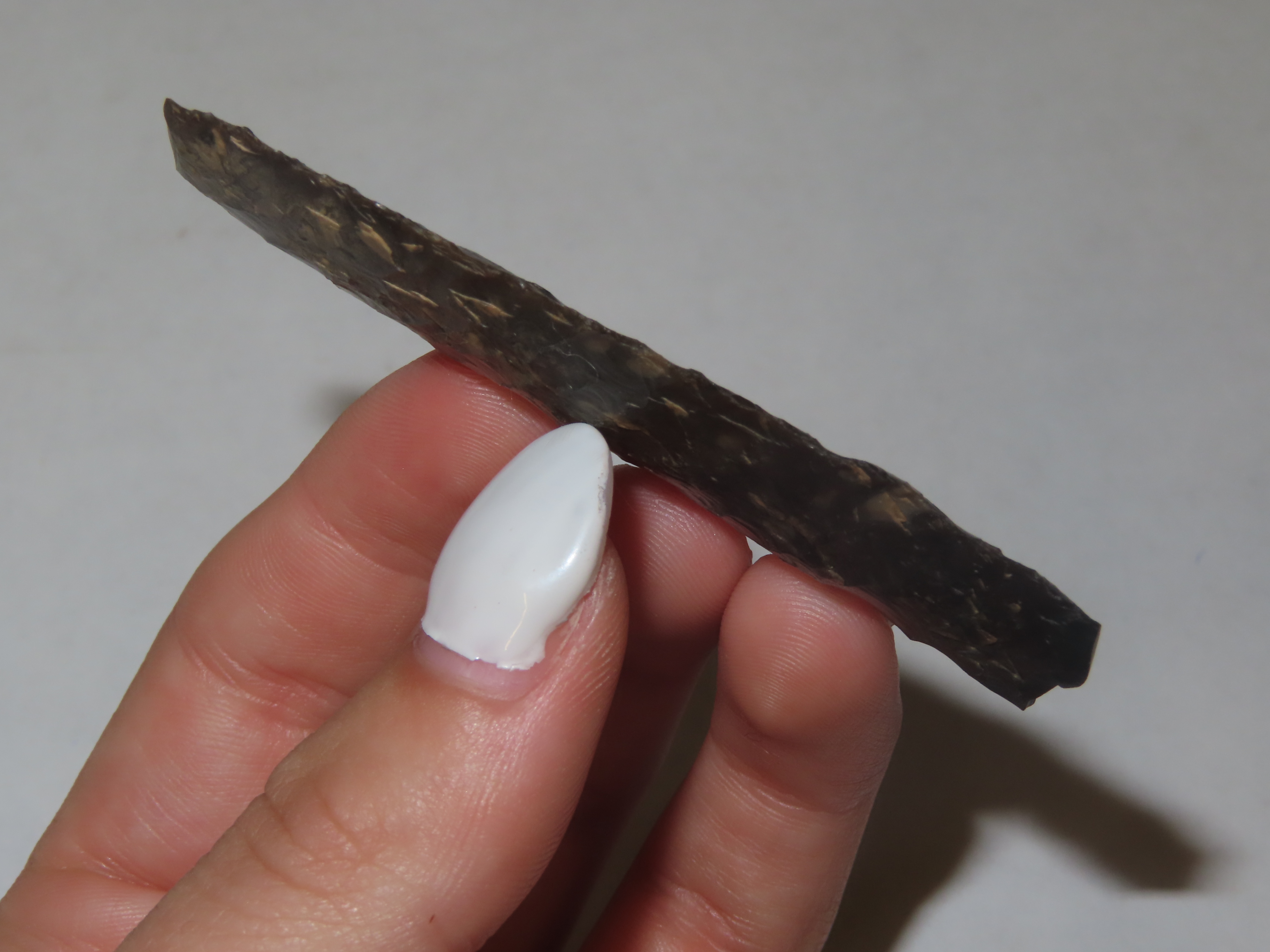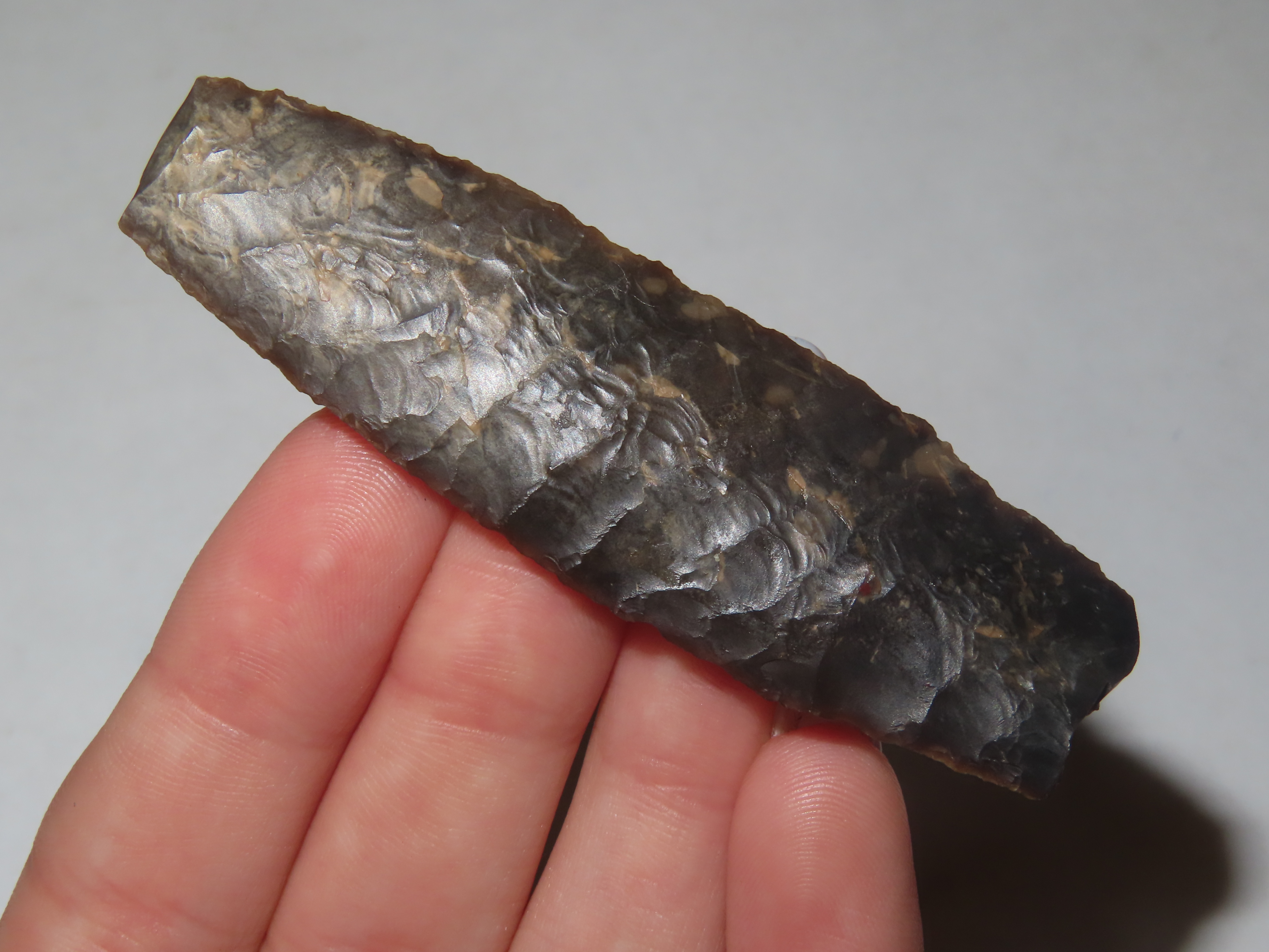 2 11/16″ Knife River Flint Eden, Perino & Jackson COA, Found by Harry Wright in 1931 at Laramie Peak, Albany Co. Wyoming. Ex Col. Philip B. Warrick Sr Collection of Albuquerque New Mexico. Wafer thin and Expertly Flaked Example.