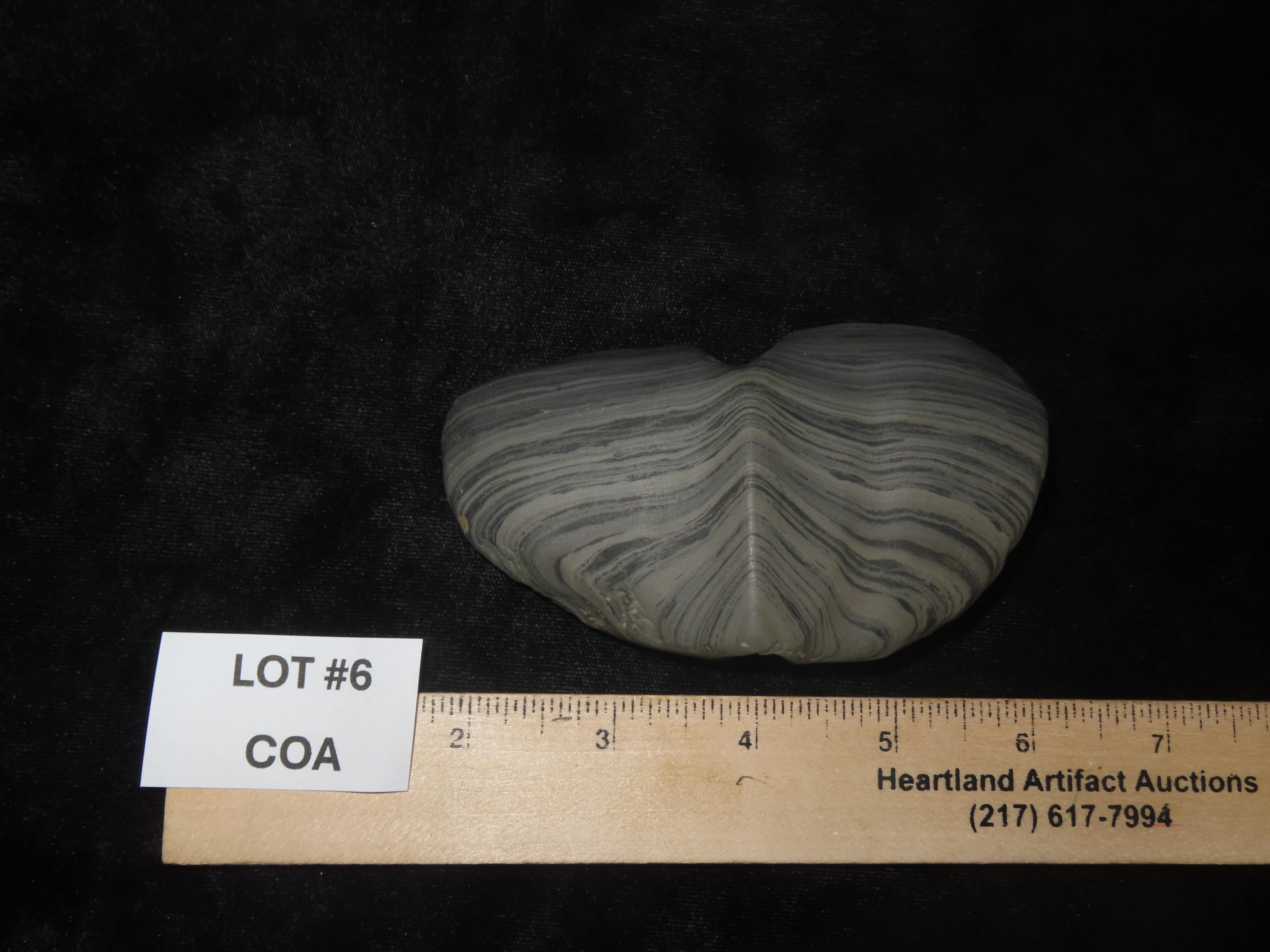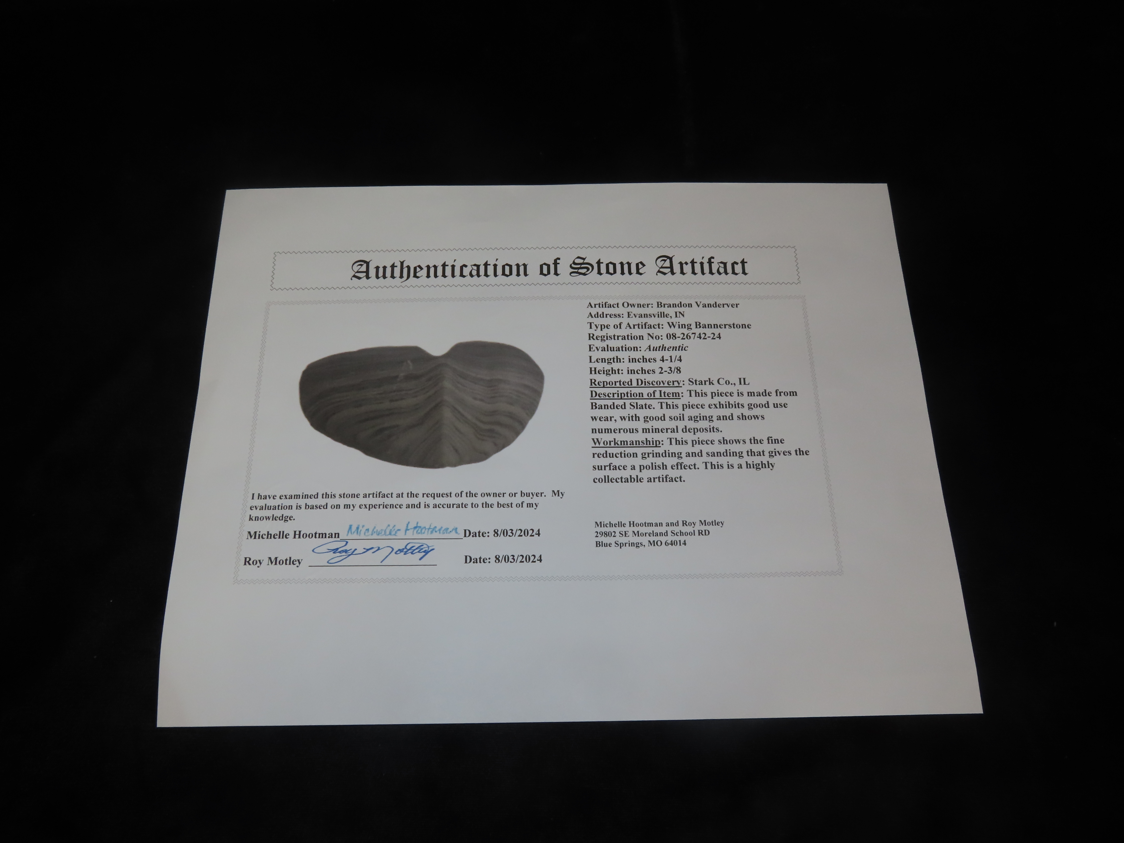Amazing 4 1/4″ Wing Bannerstone, Stark County Illinois, Motley COA. Beautiful Vivid Banding, Excellent Polish. Great Example of the type!