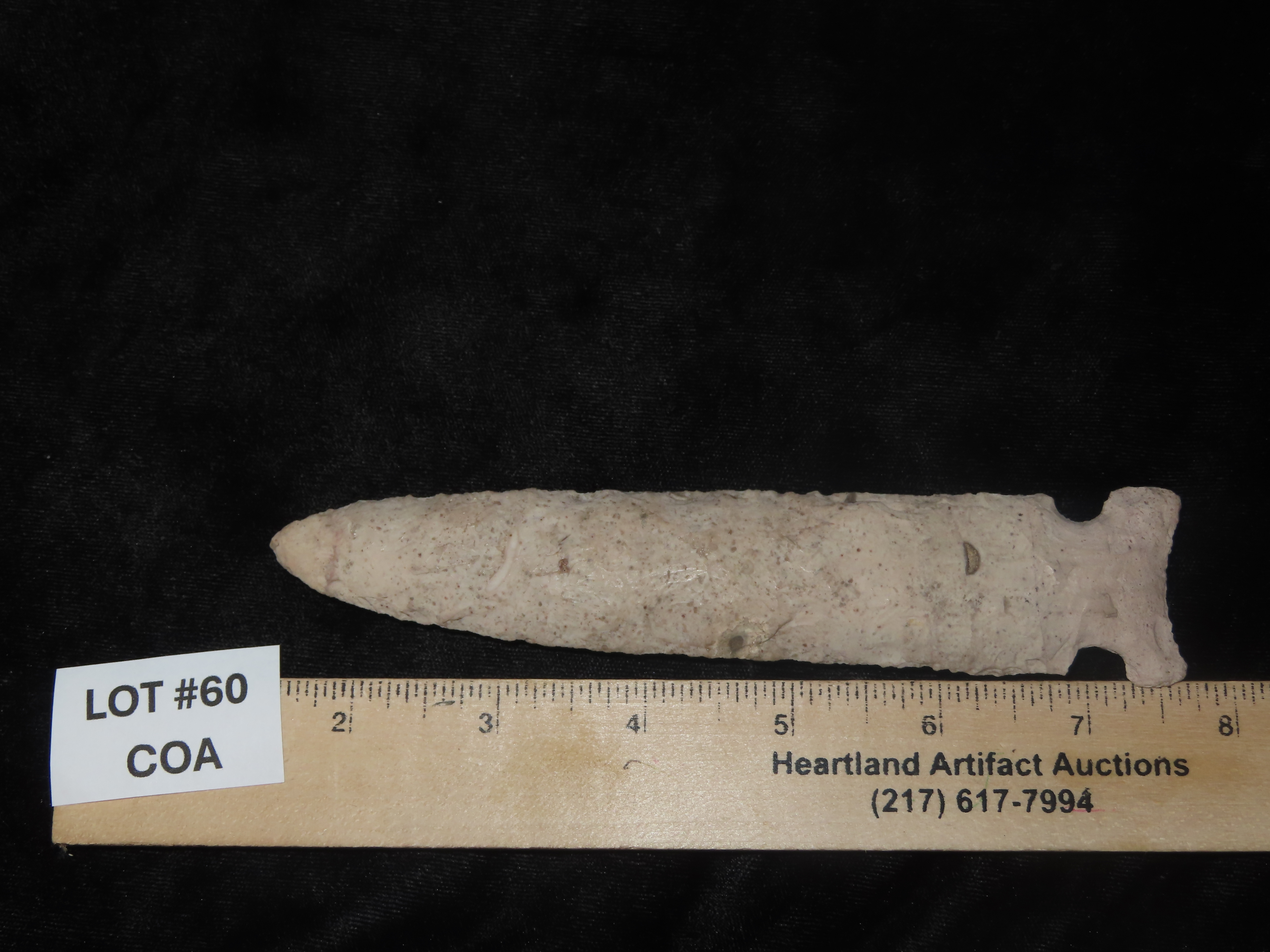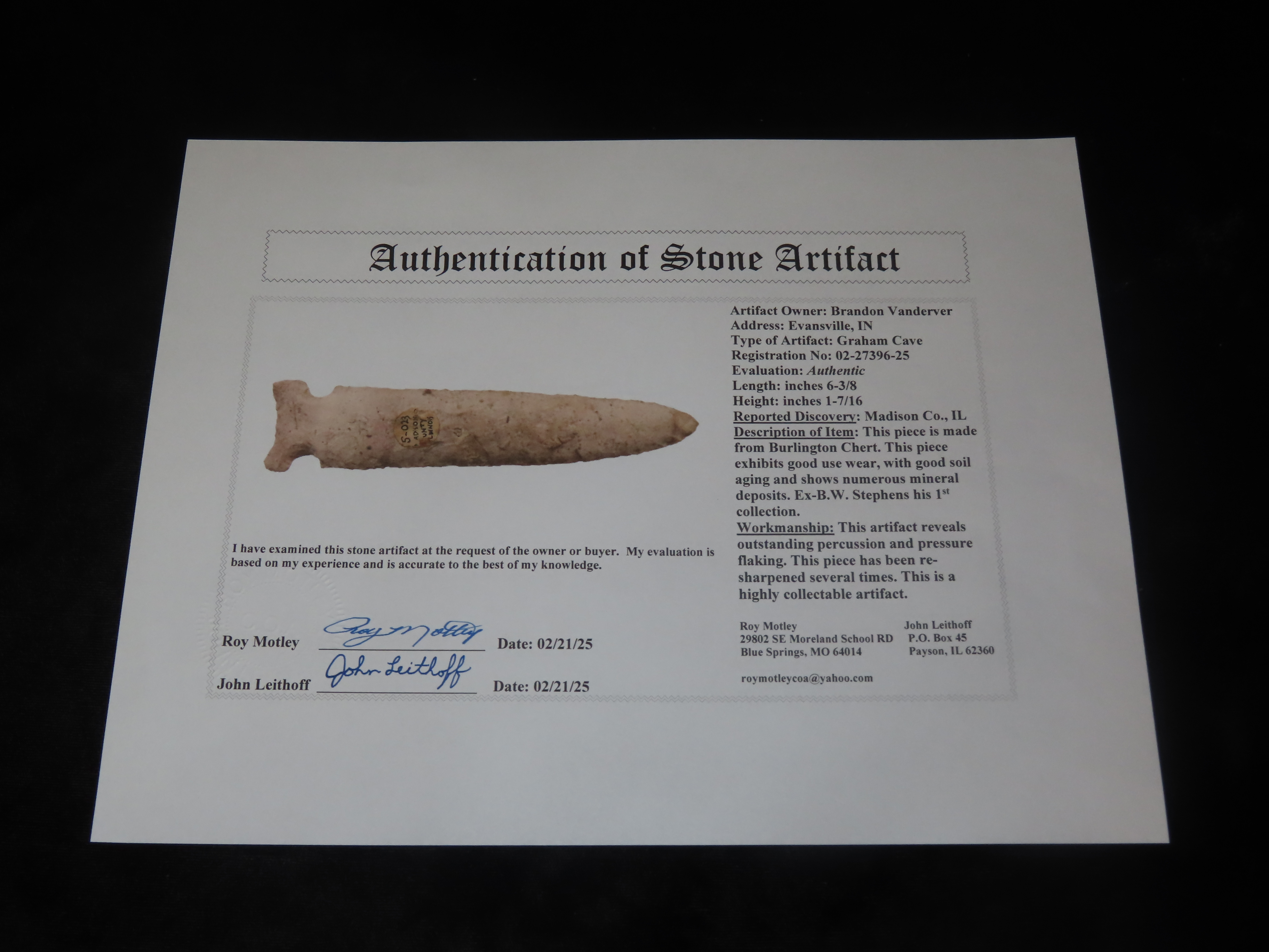 Outstanding 6 3/8″ Graham Cave, Madison Co. Illinois. Dickey & Motley COA’s. Ex B.W. Stephens 1st Collection purchased on 4-6-1928 fro “Ellis”, later sold to Tom Moxley, then onto Mitch Lewis, Perry Hanson, Brandon Vanderver. This is the first time to ever be sold Publicly. Collector Grade Example with Super History!