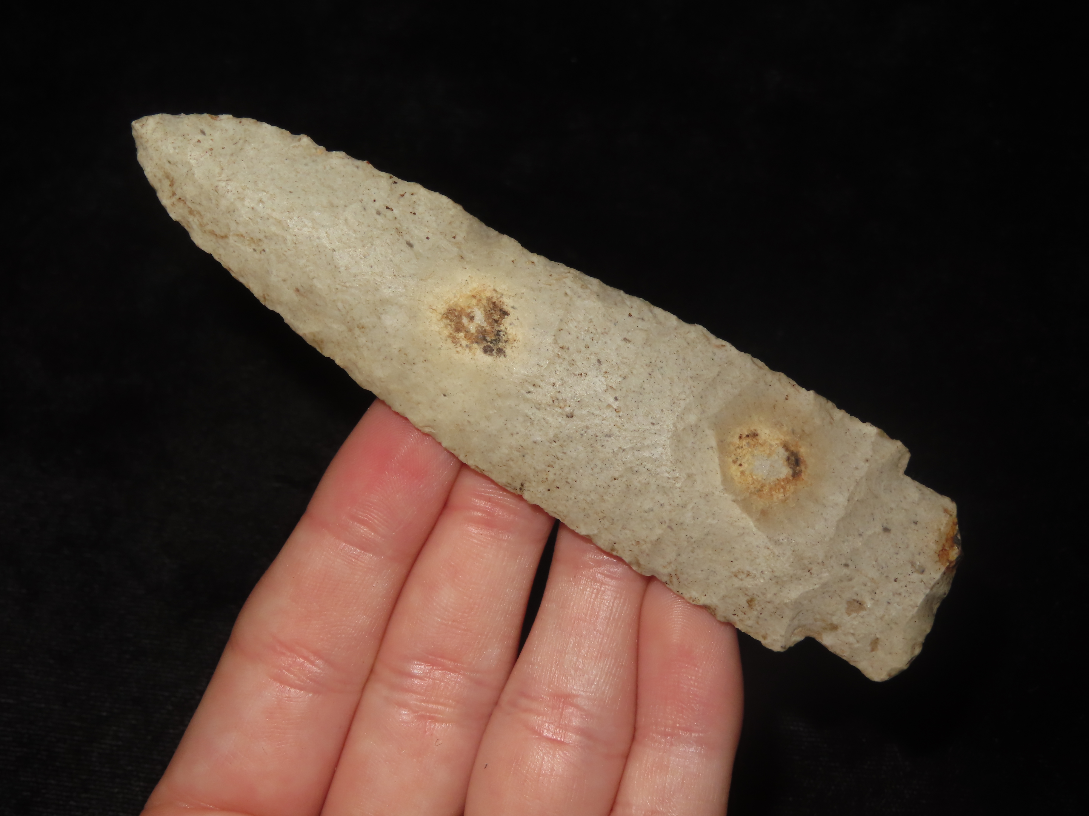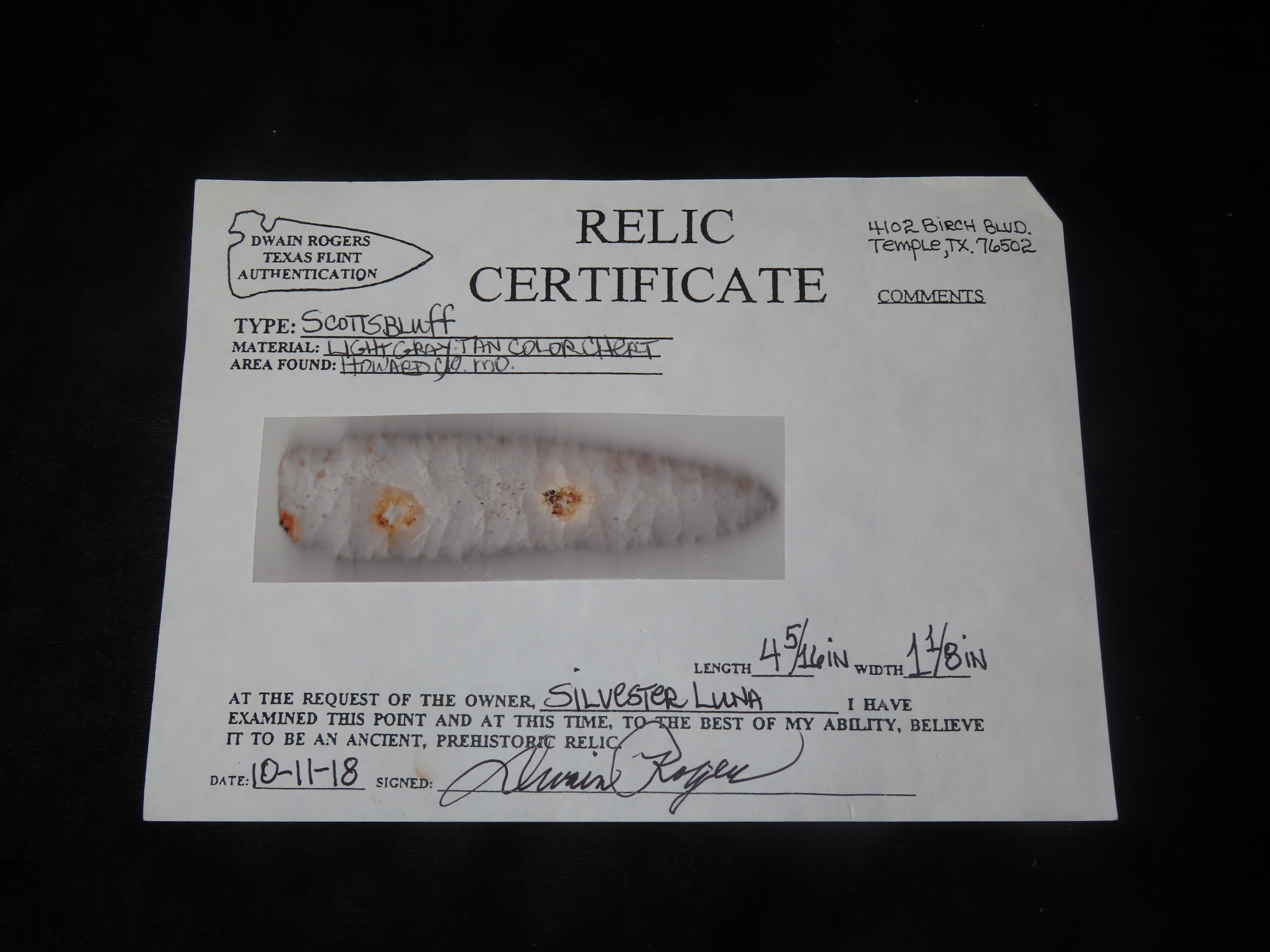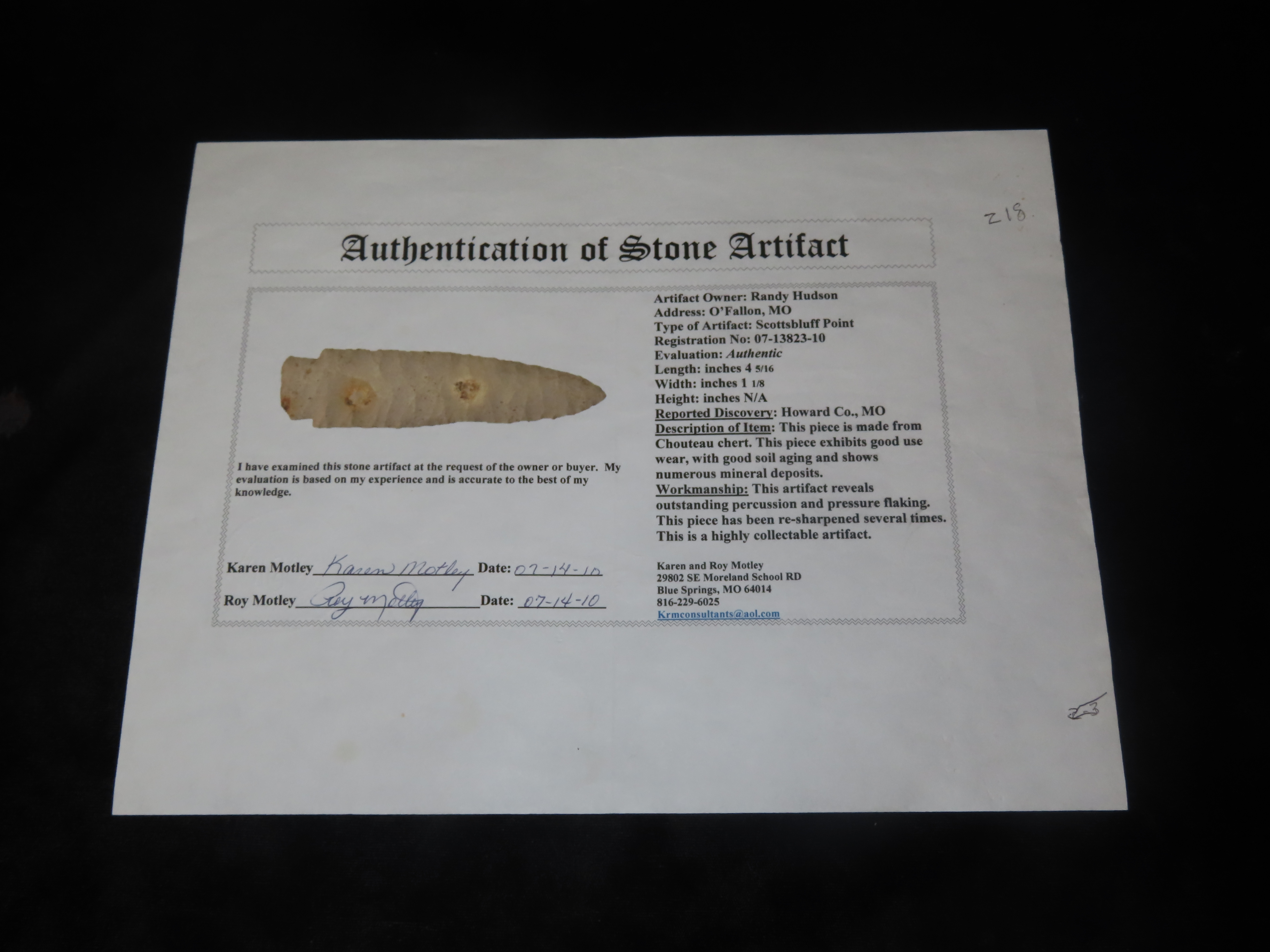 4 5/16″ Scottsbluff, Howard Co. Missouri, Rogers & Motely COA’s, Nice Large Example with Wonderful Classic Flaking, Ex Sly Luna Collection, Ex Randy Hudson. Great Classic Example!