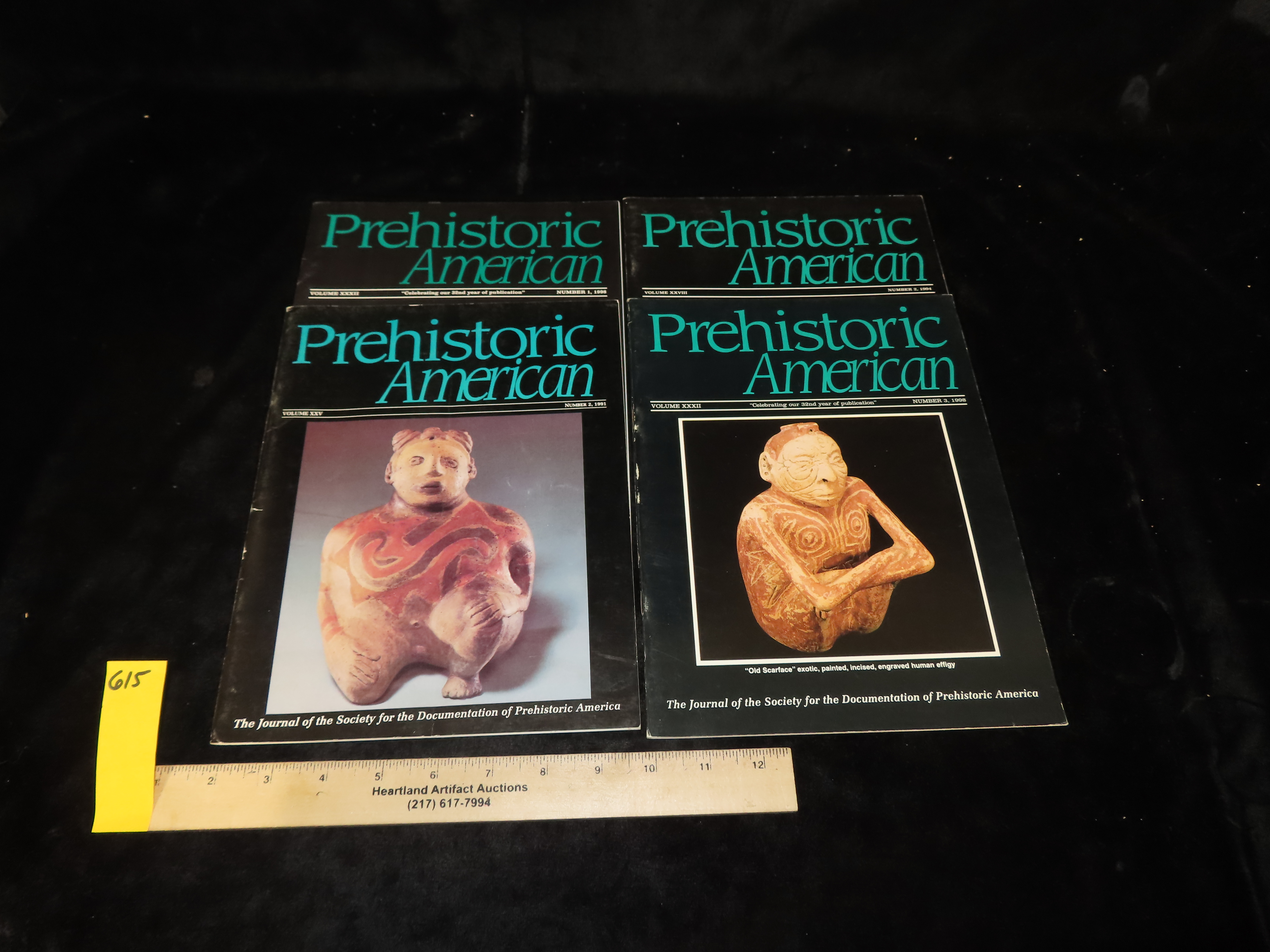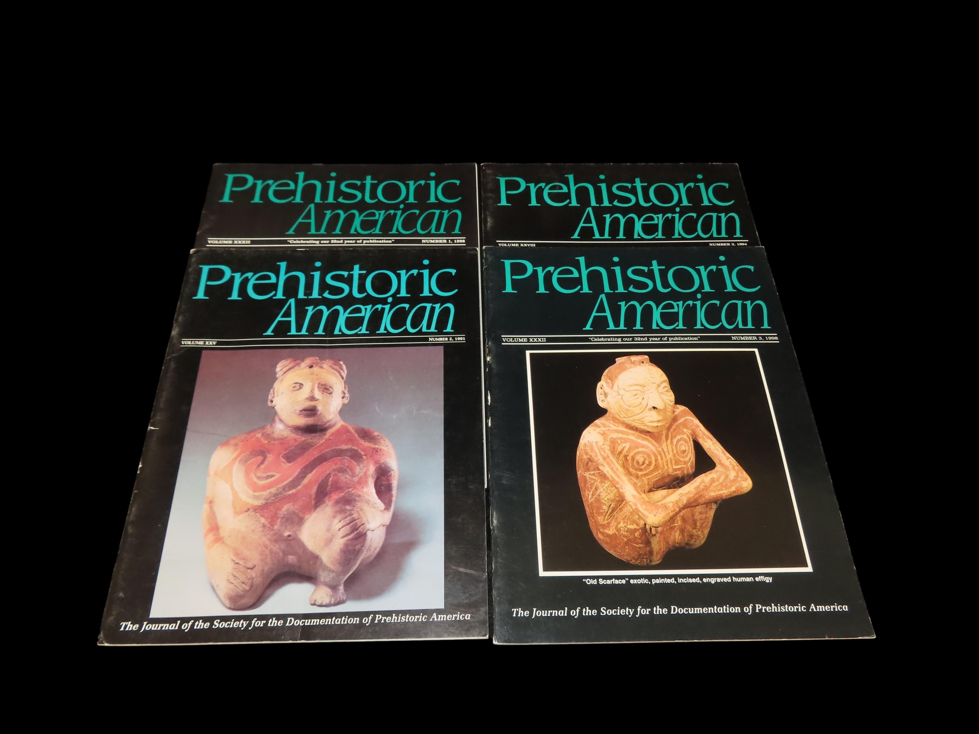 LOT OF 4 PREHISTORIC AMERICAN JOURNALS FROM THE 1990’S, TONS OF GREAT PICTURES AND ARTICLES, CLOVIS, BANNERSTONE, AXE, DOVETAIL, POTTERY