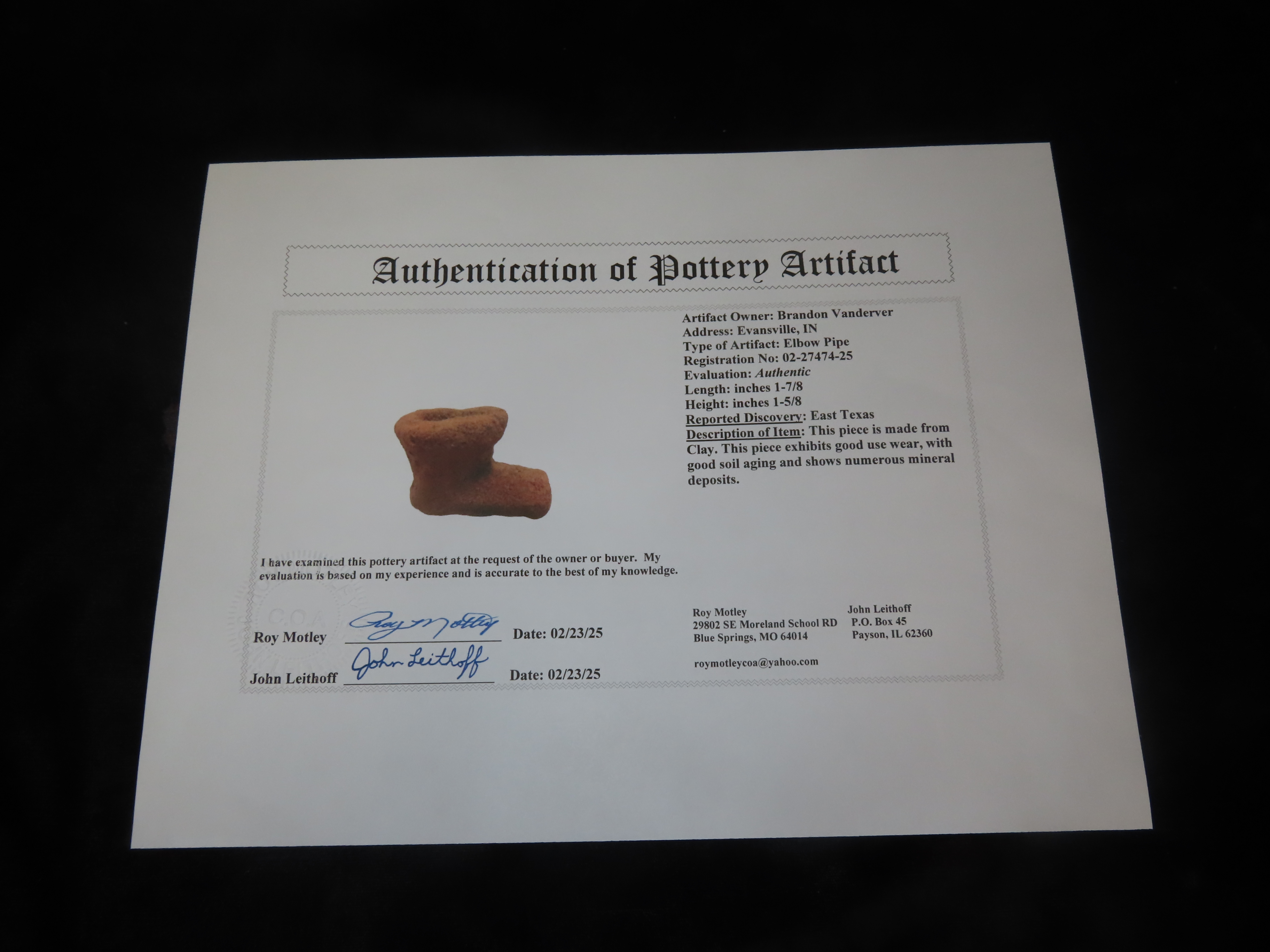 1 7/8″ Elbow Pipe from East Texas, Motley COA. Nice old Example, Well Shaped and No Brainer Patina