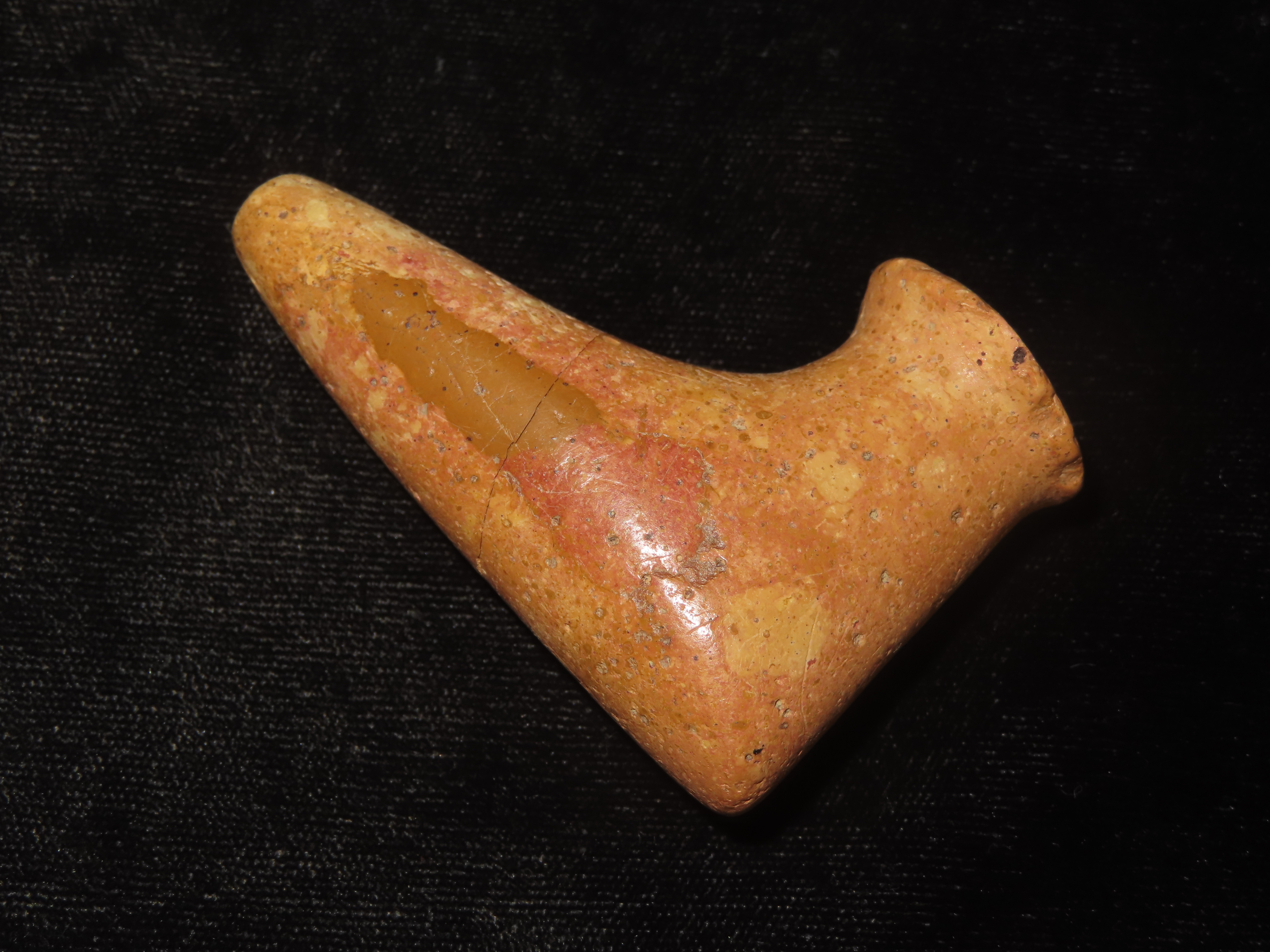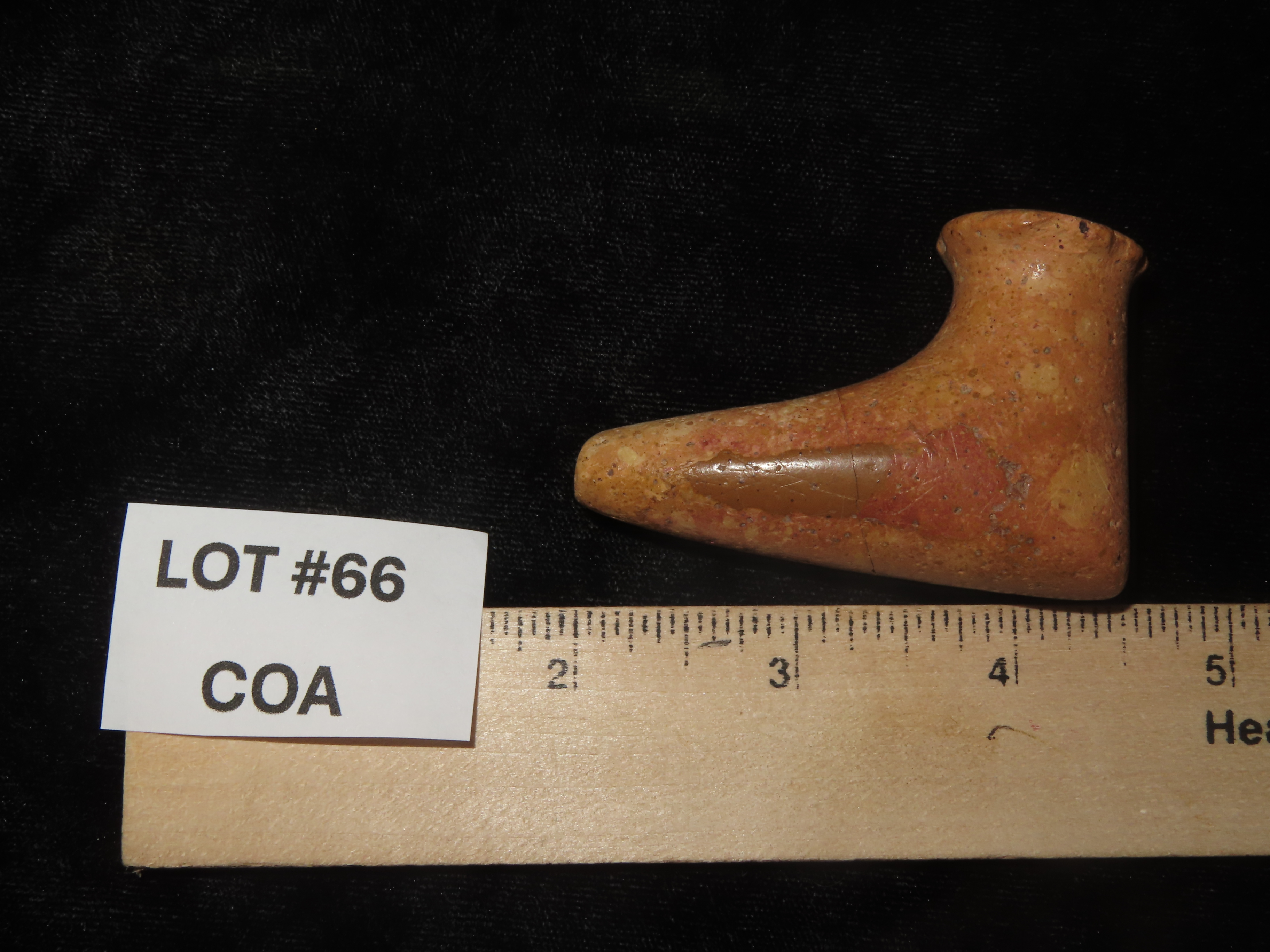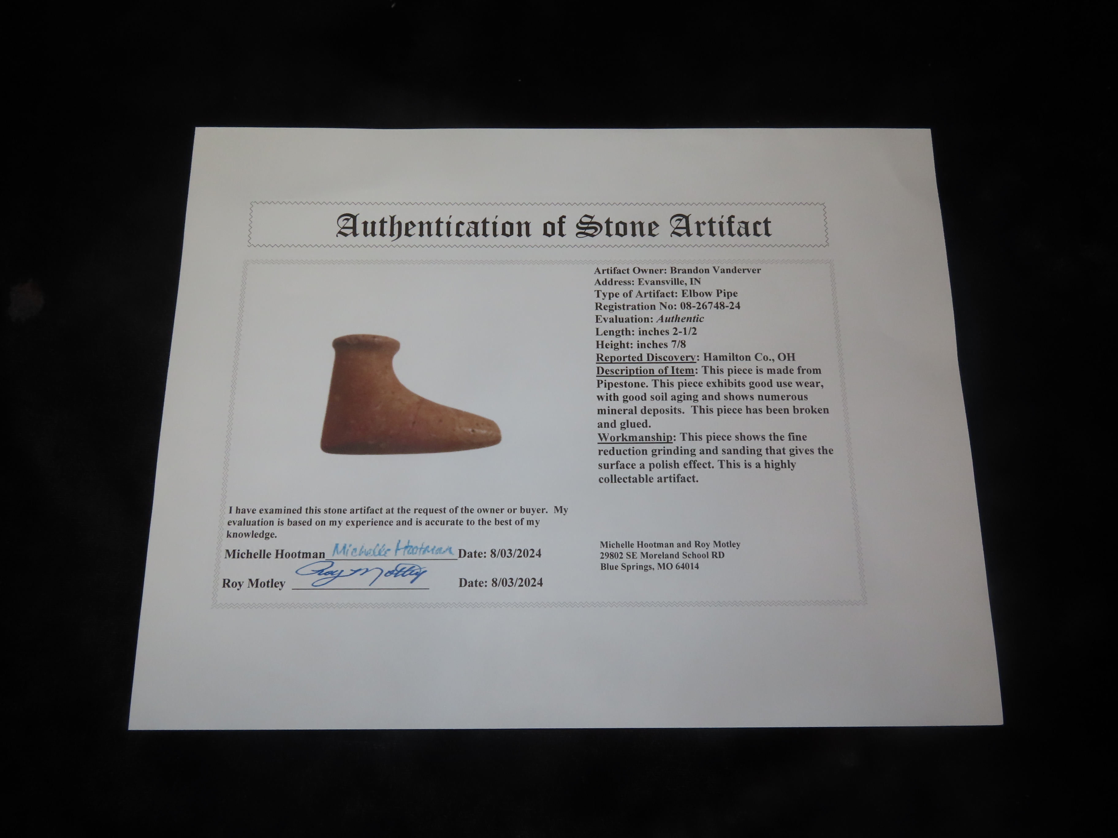 2 1/2″ Elbow Pipe, Hamilton Co. Ohio, Pipestone, Motley COA. Great Old Example with Amazing Polish and Use Wear. This piece has been Broken & Glued on the Stem, Very Tight Fit with No Filler.