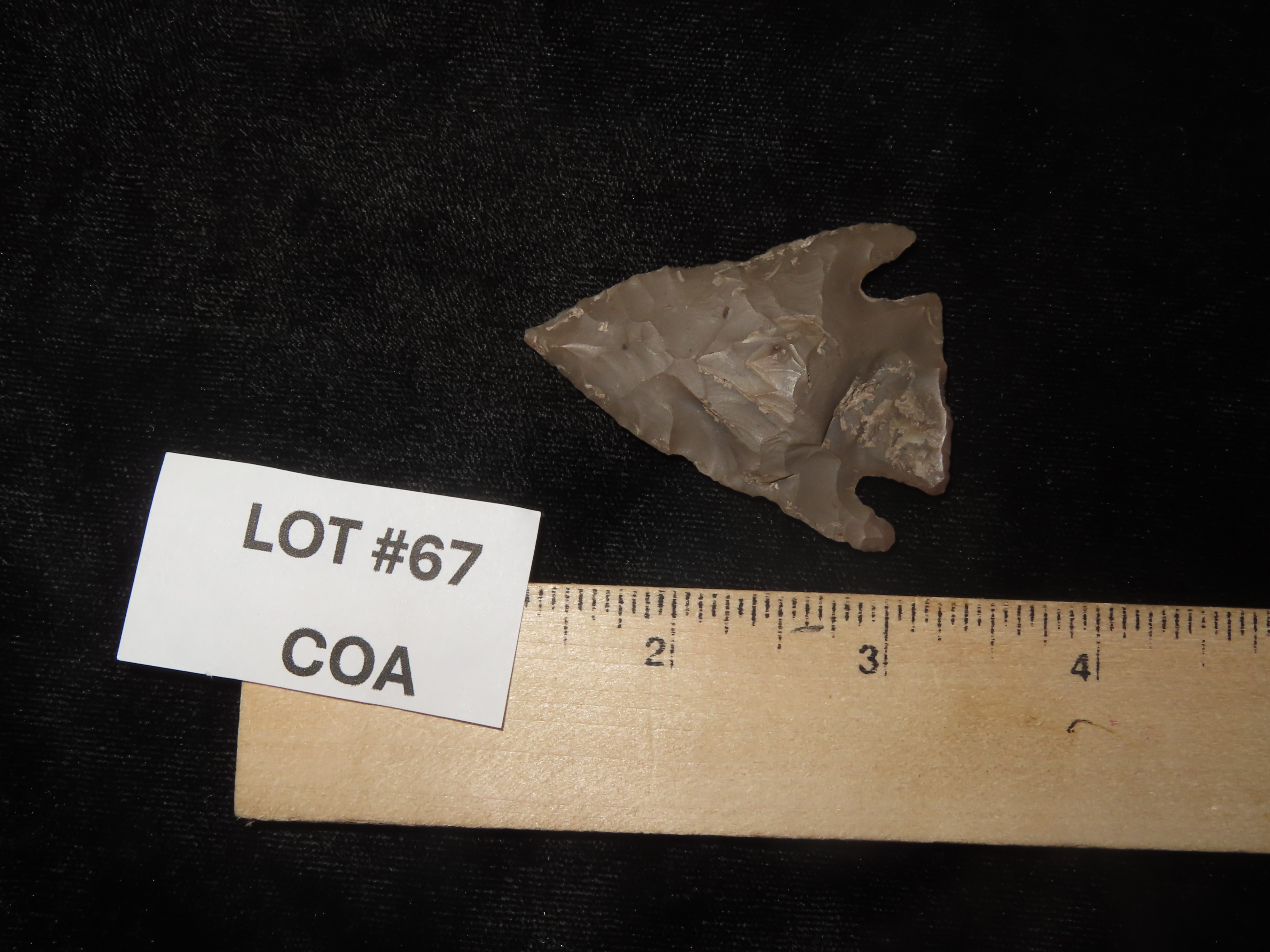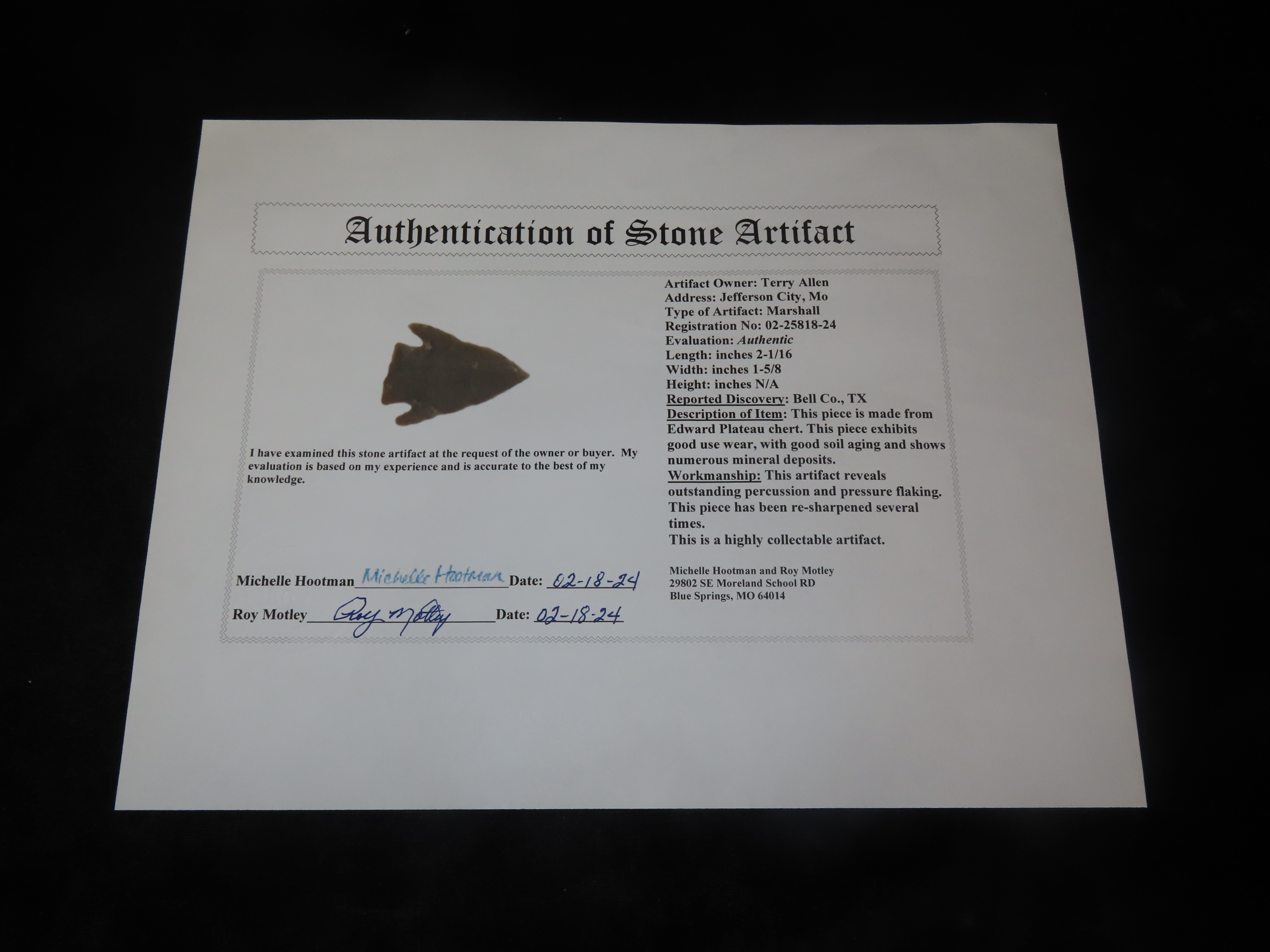 Amazing Translucent Marshall, 2 1/16″, Bell Co. Texas, Motley COA. Wafer thin & Very Well Flaked, Indian Arrowhead, Artifact