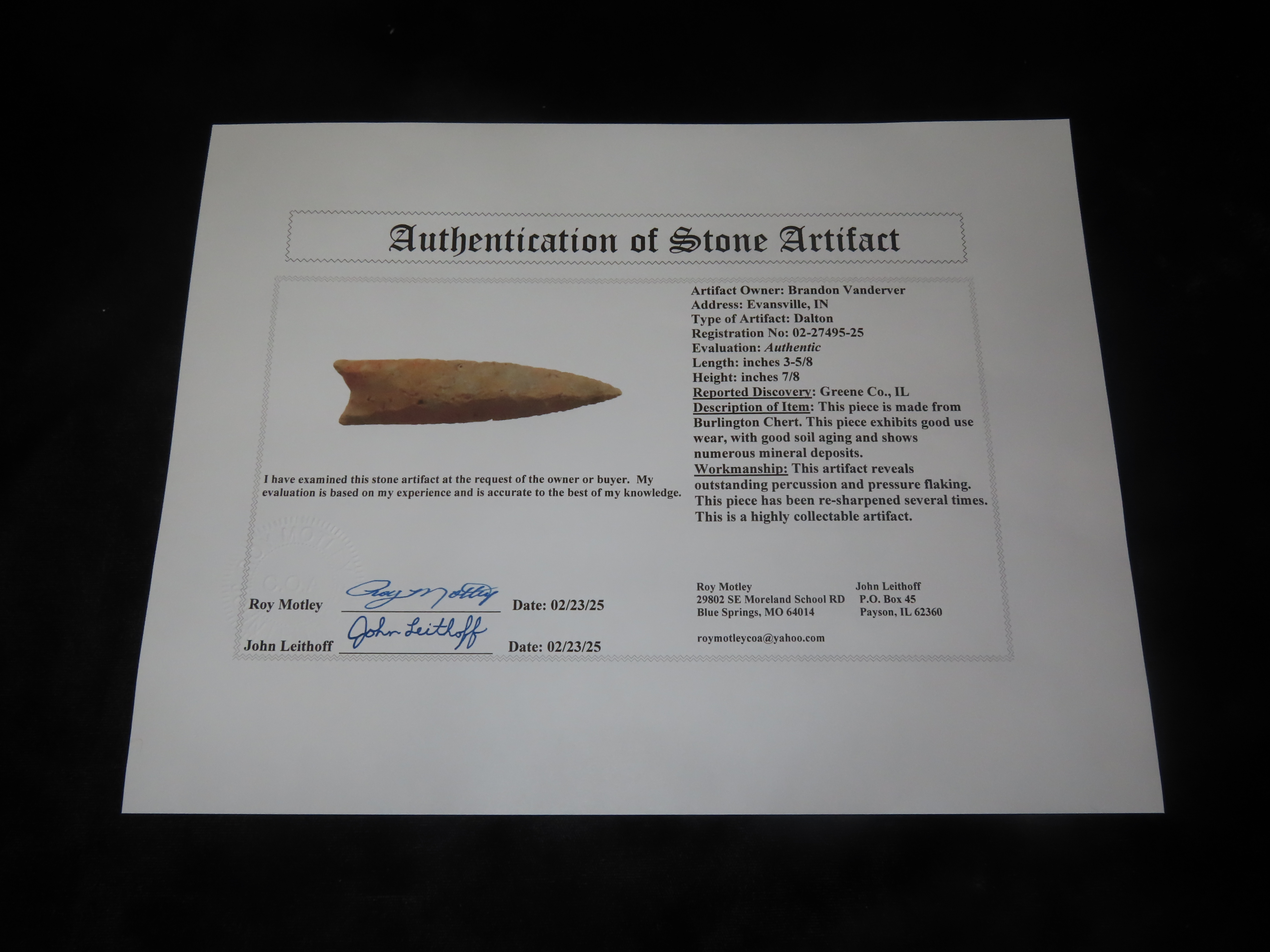Incredible 3 5/8″ Dalton, Greene Co. Illinois, Motley COA, Impeccable Flaking and Great Color.