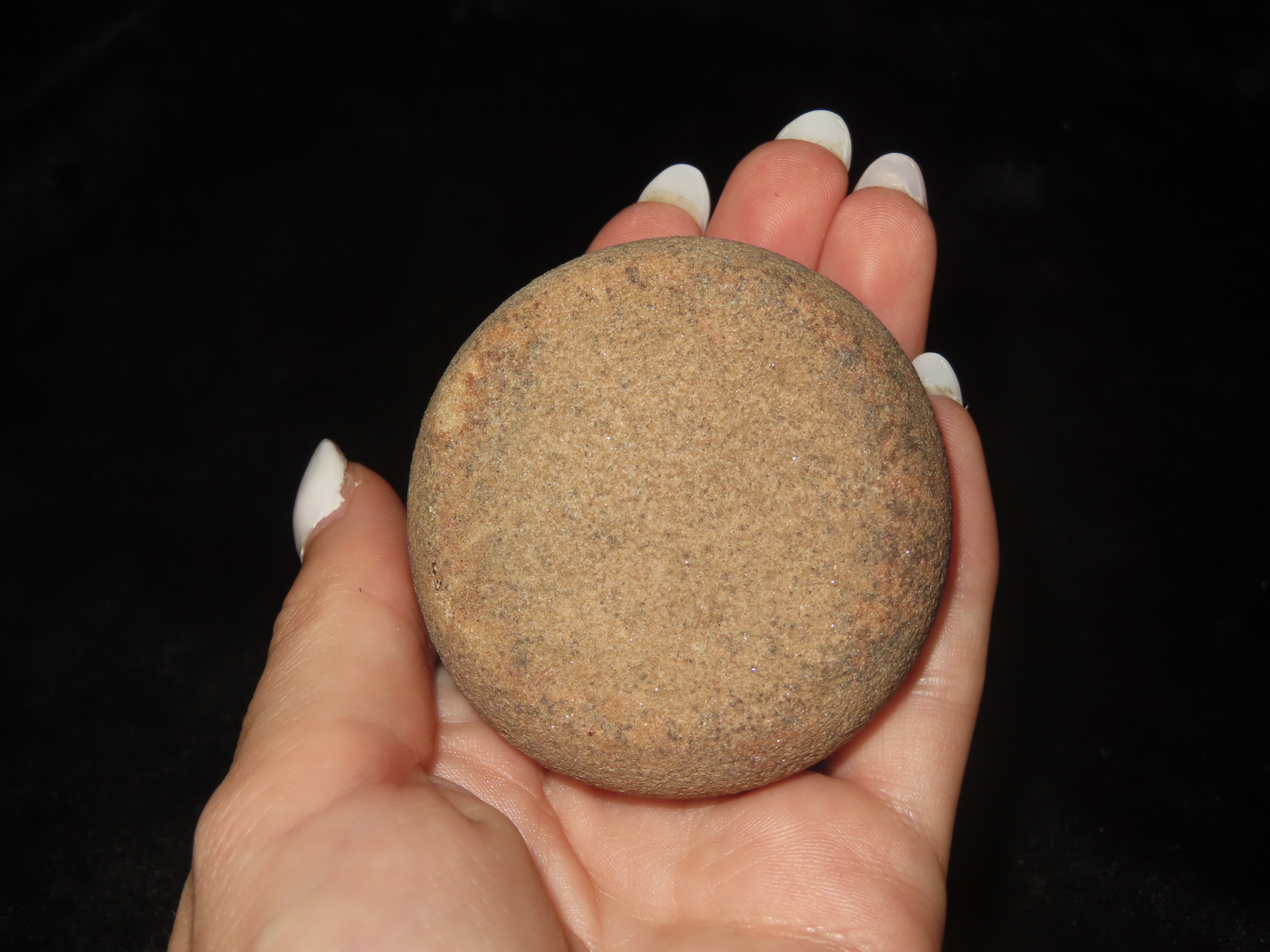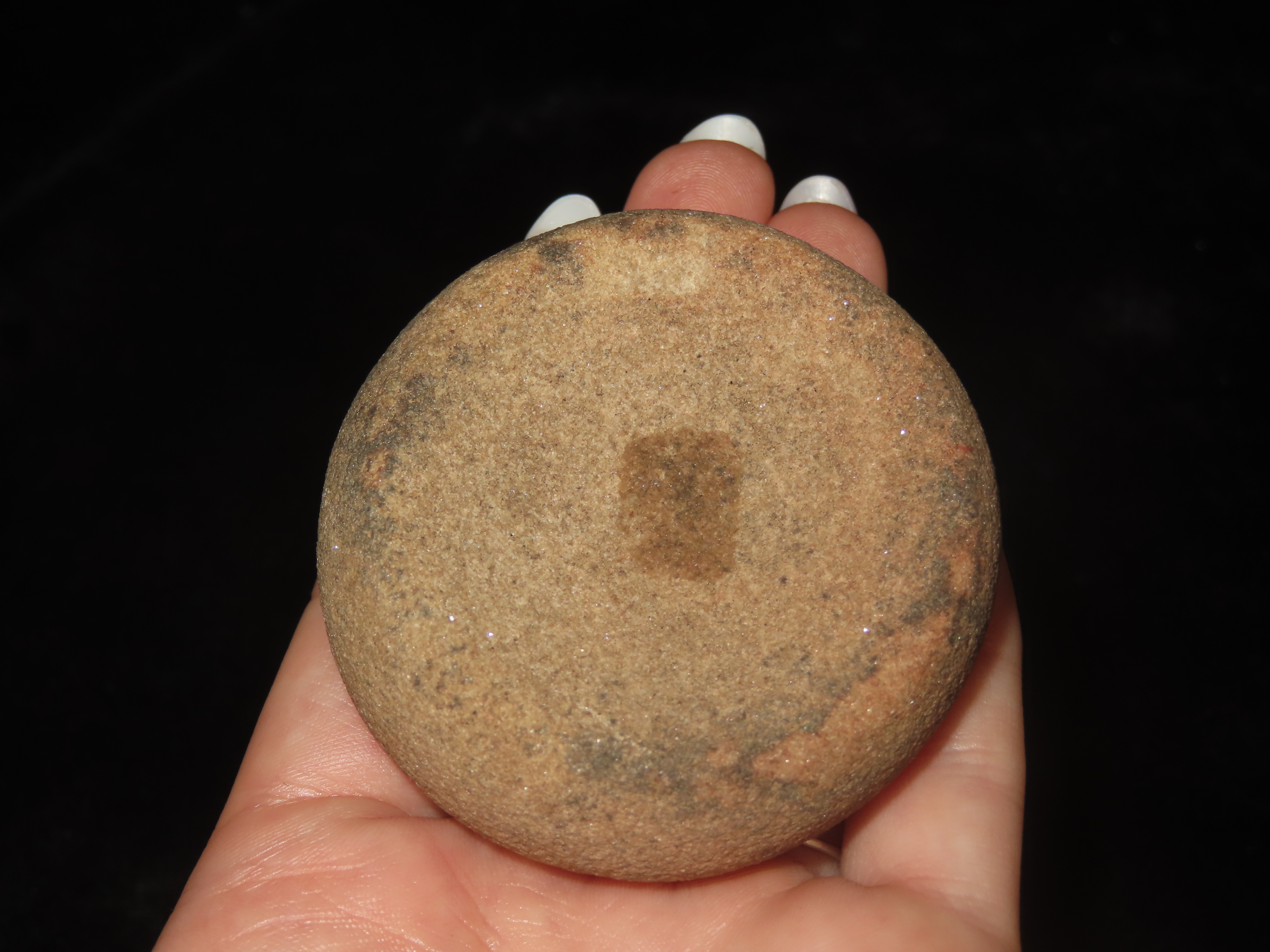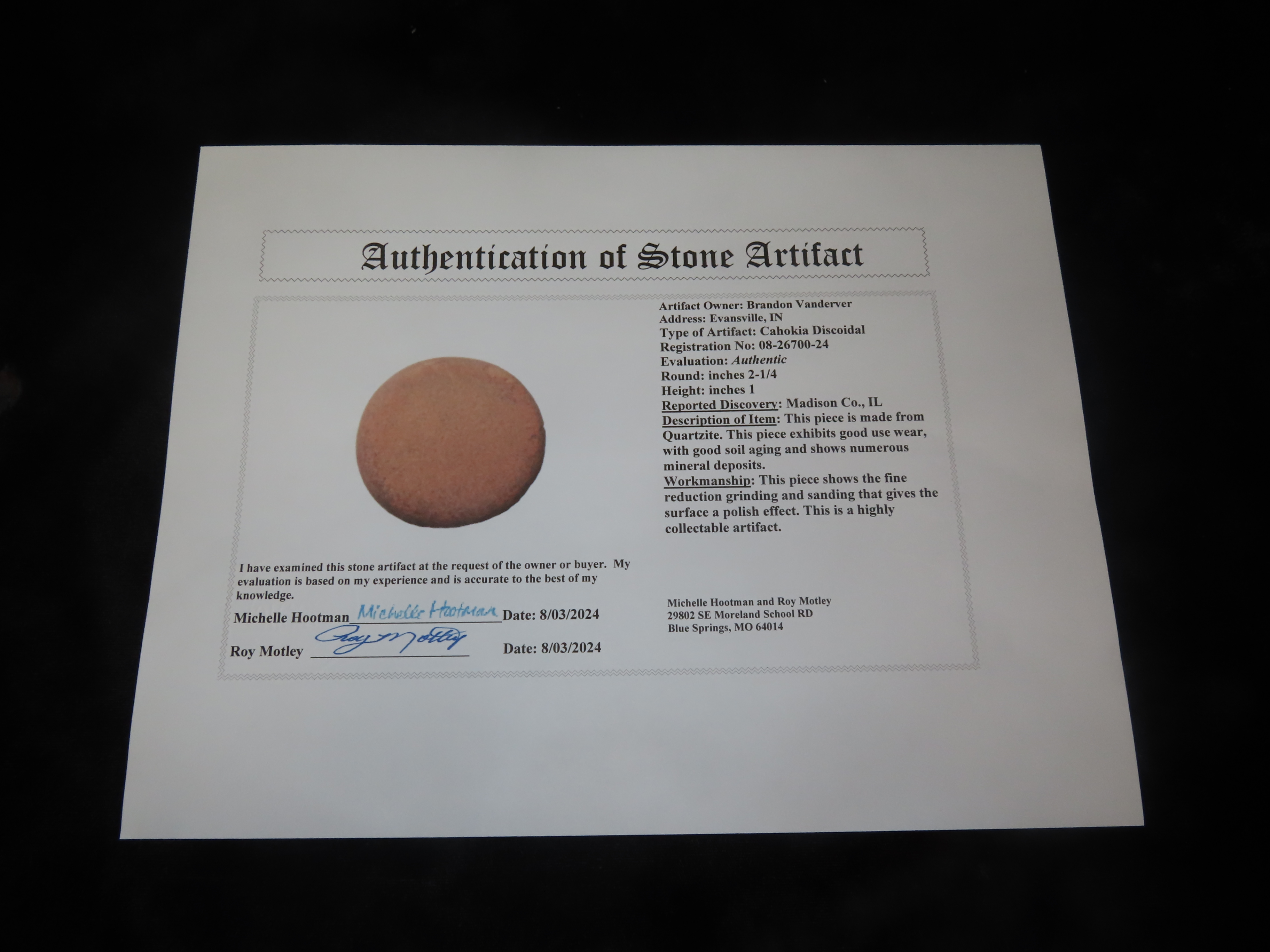 2 1/4" Cahokia Discoidal, Madison Co. Illinois, Motley COA/ Nice Double Cupped Example with Great Smooth Polish, Made out of a Pink & Tan Quartzite Material