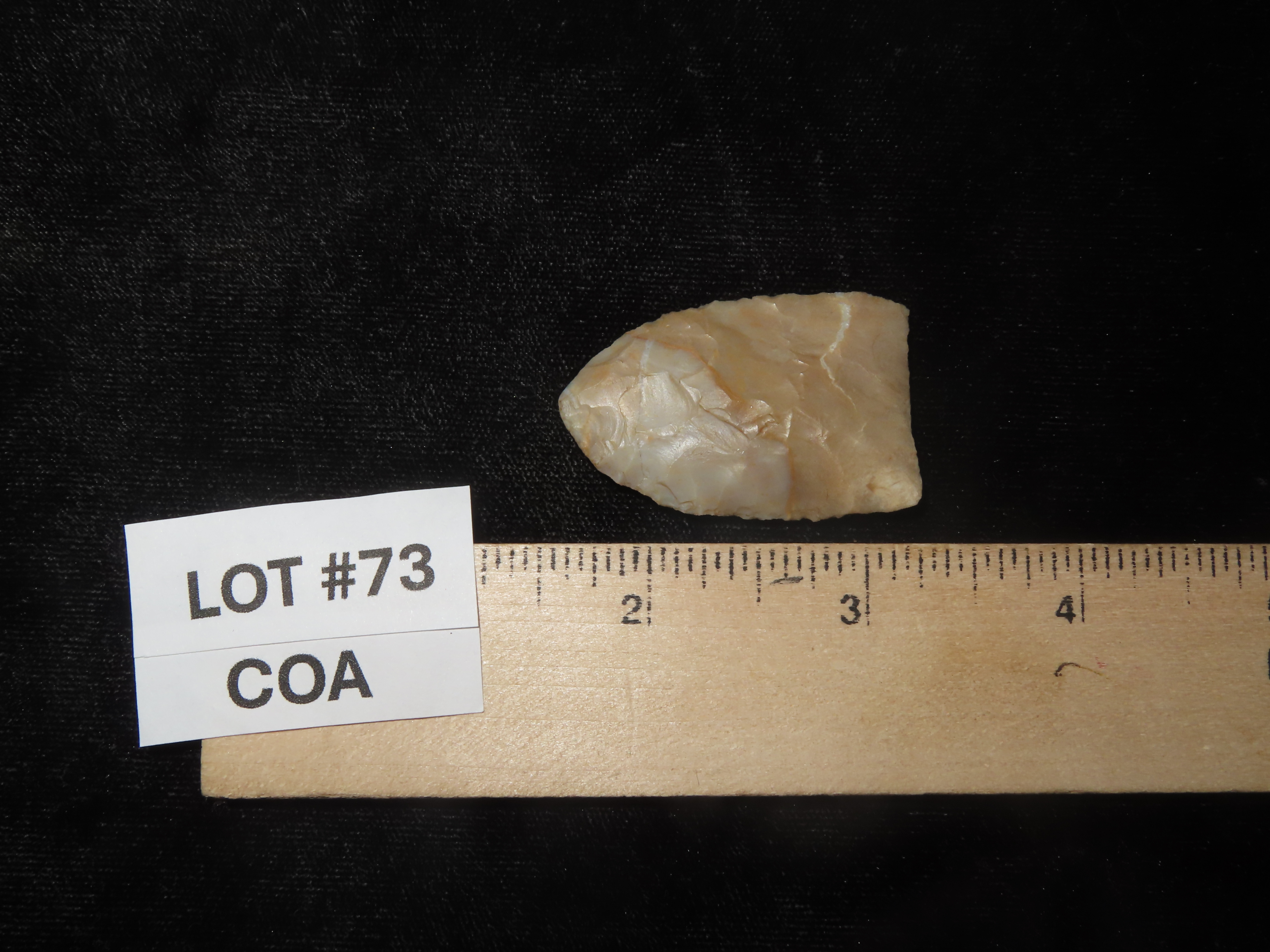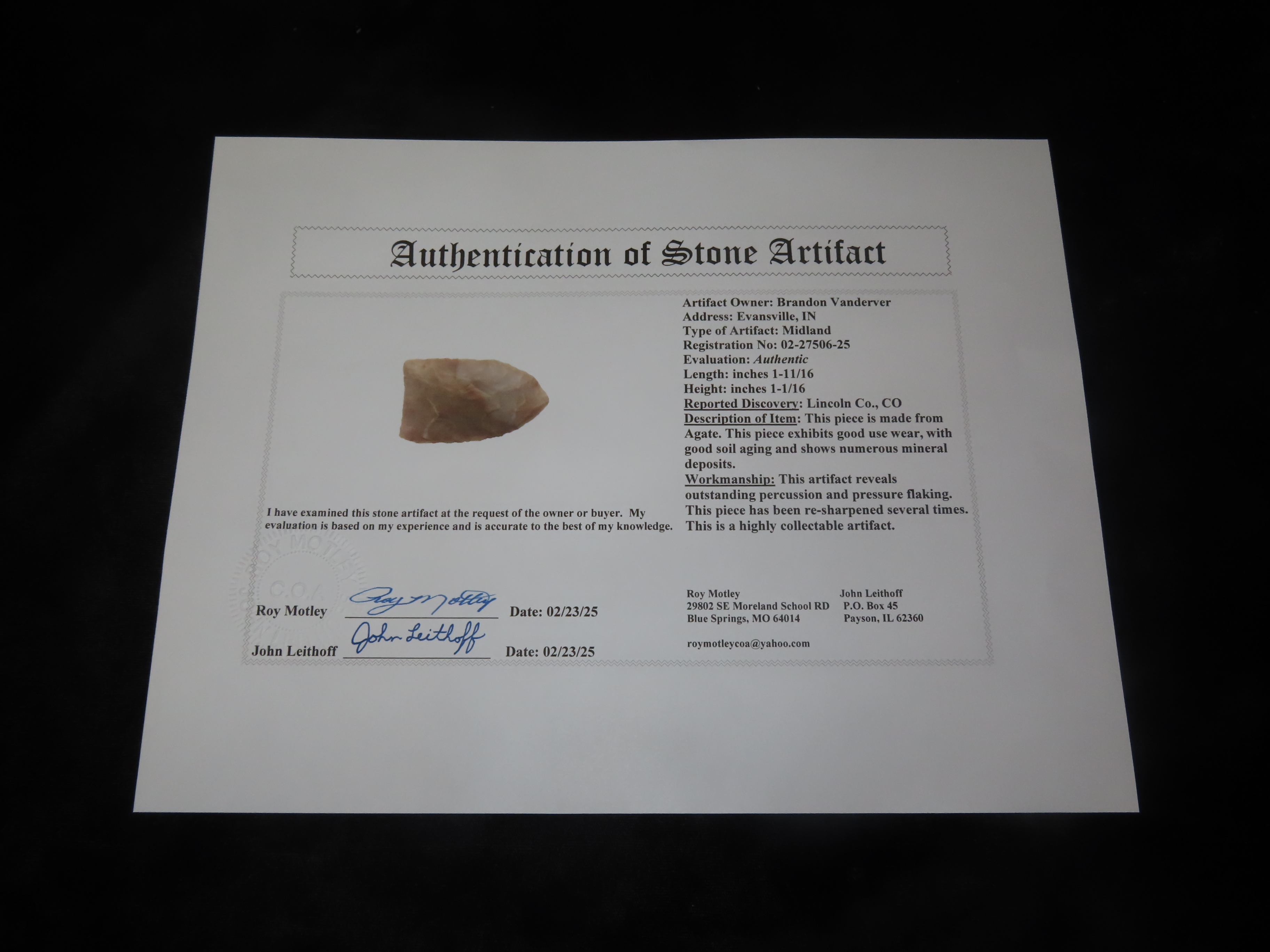 1 11/16″ Midland, Lincoln Co. Colorado, Motely COA. Nicely Flaked Transclucent Example. Great Early Paleo Lance