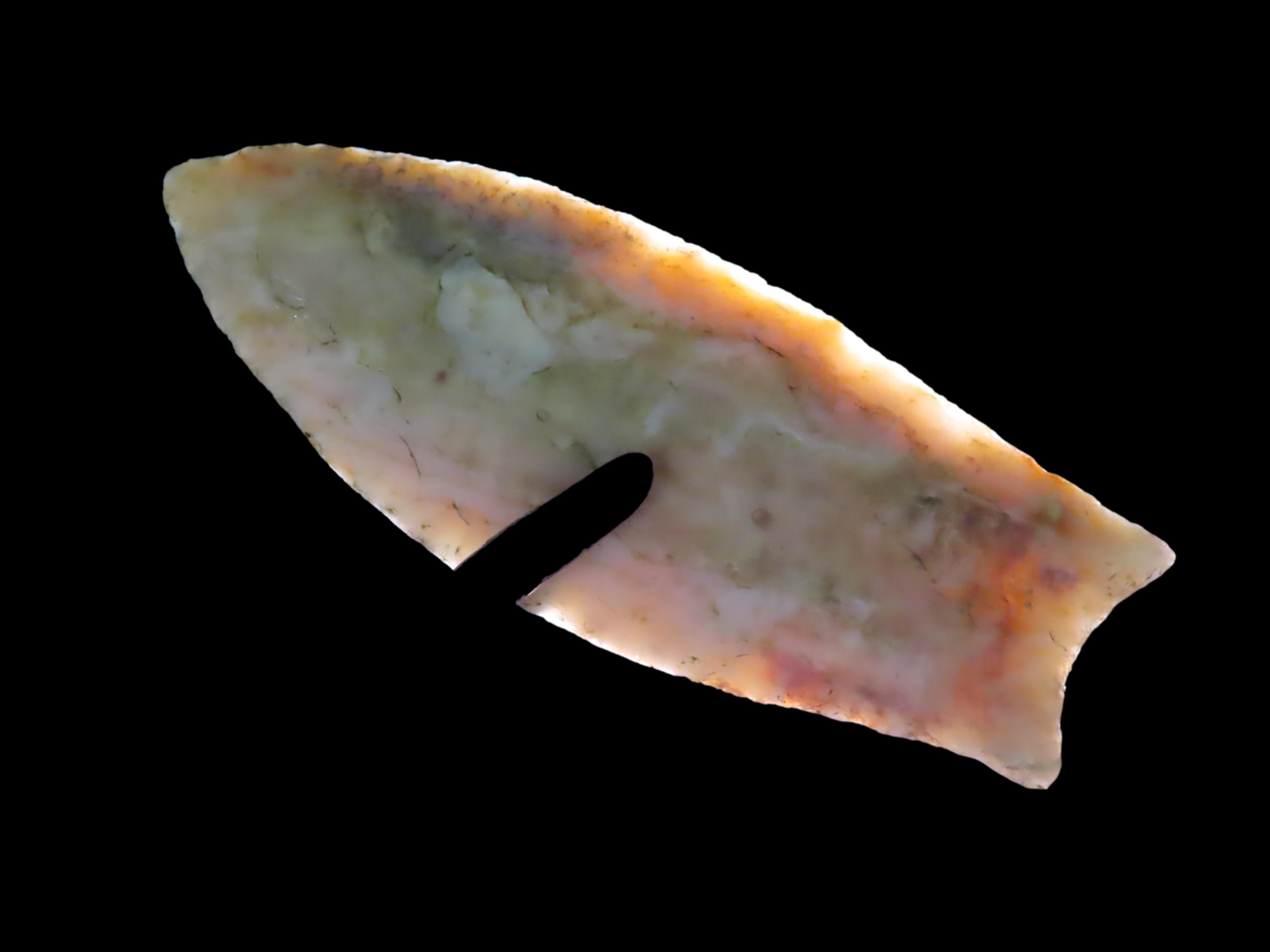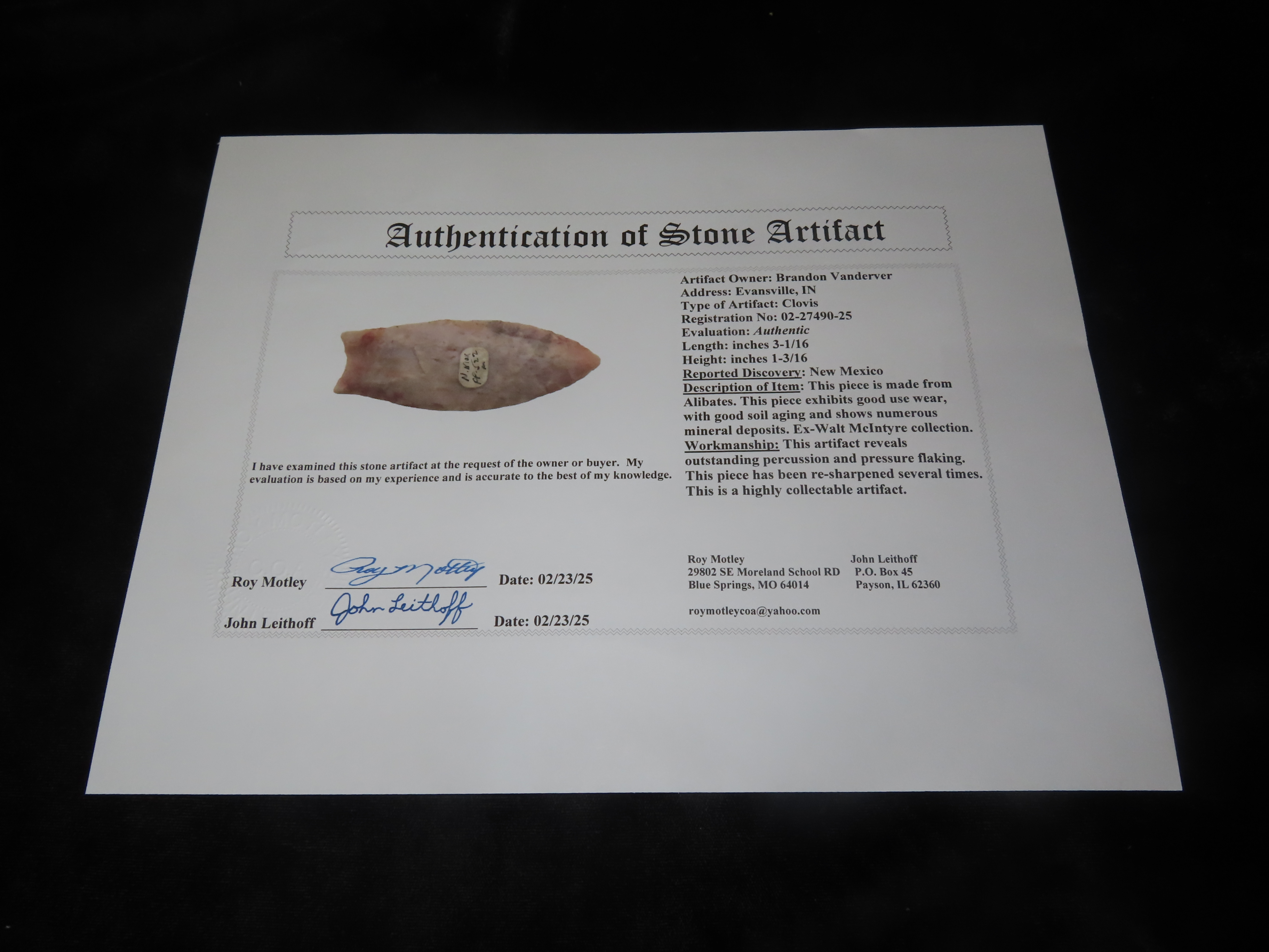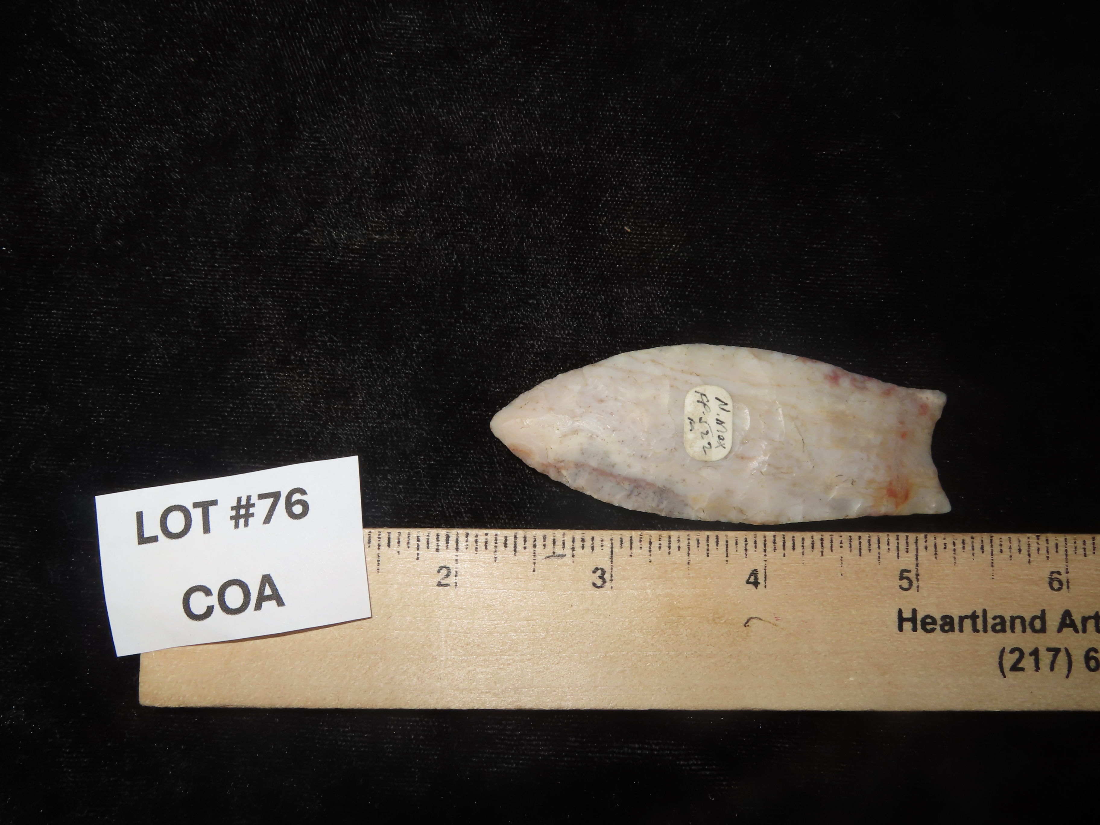 3 1/16″ Alibates Clovis, New Mexico, Motley COA, Very Colorful & Highly Translucent, Well flaked Example, Ex Walt McIntyre Collection. Fluted on Both Sides. Has some Glue on One Side from Being glued in a Frame at one time.