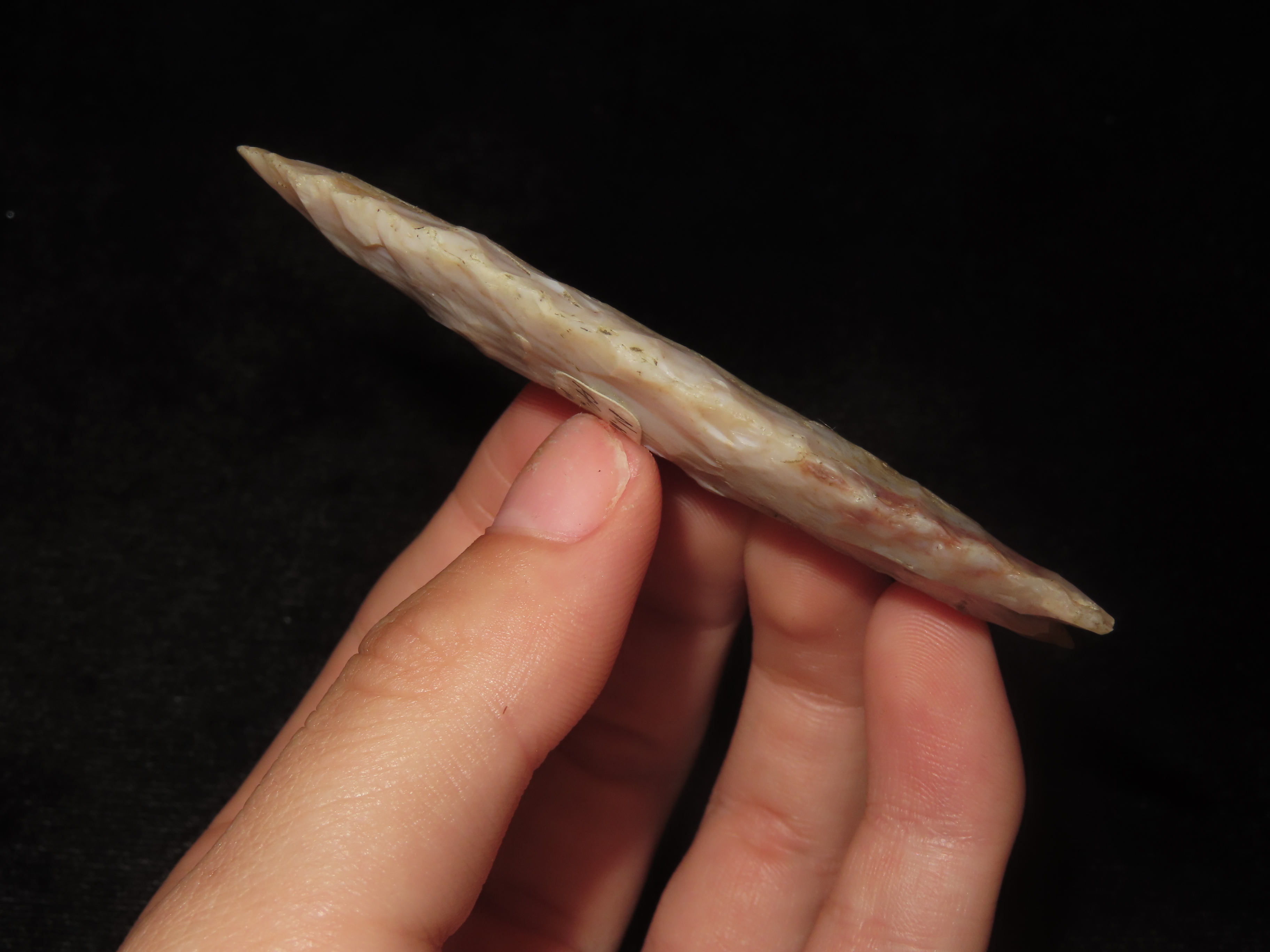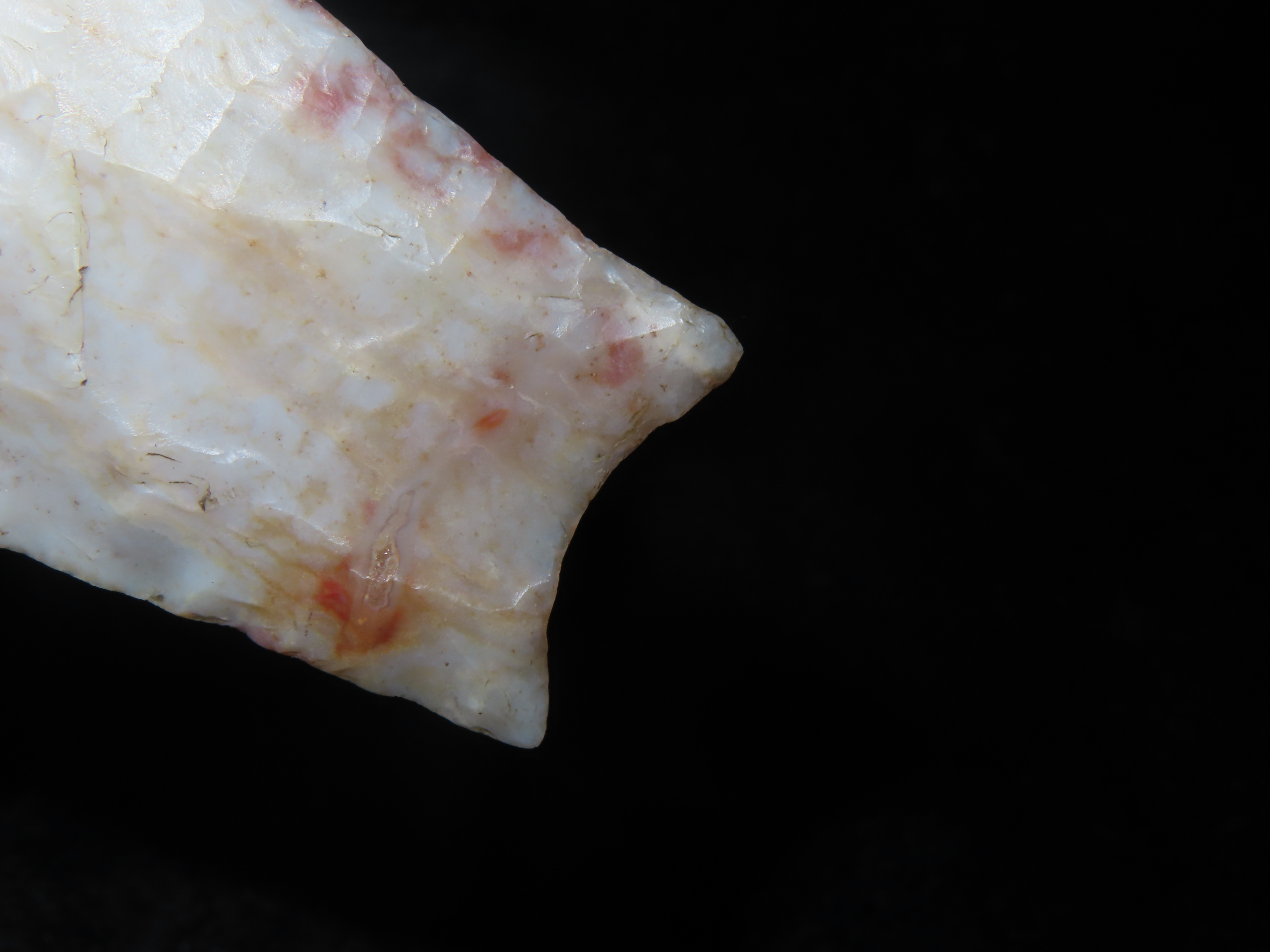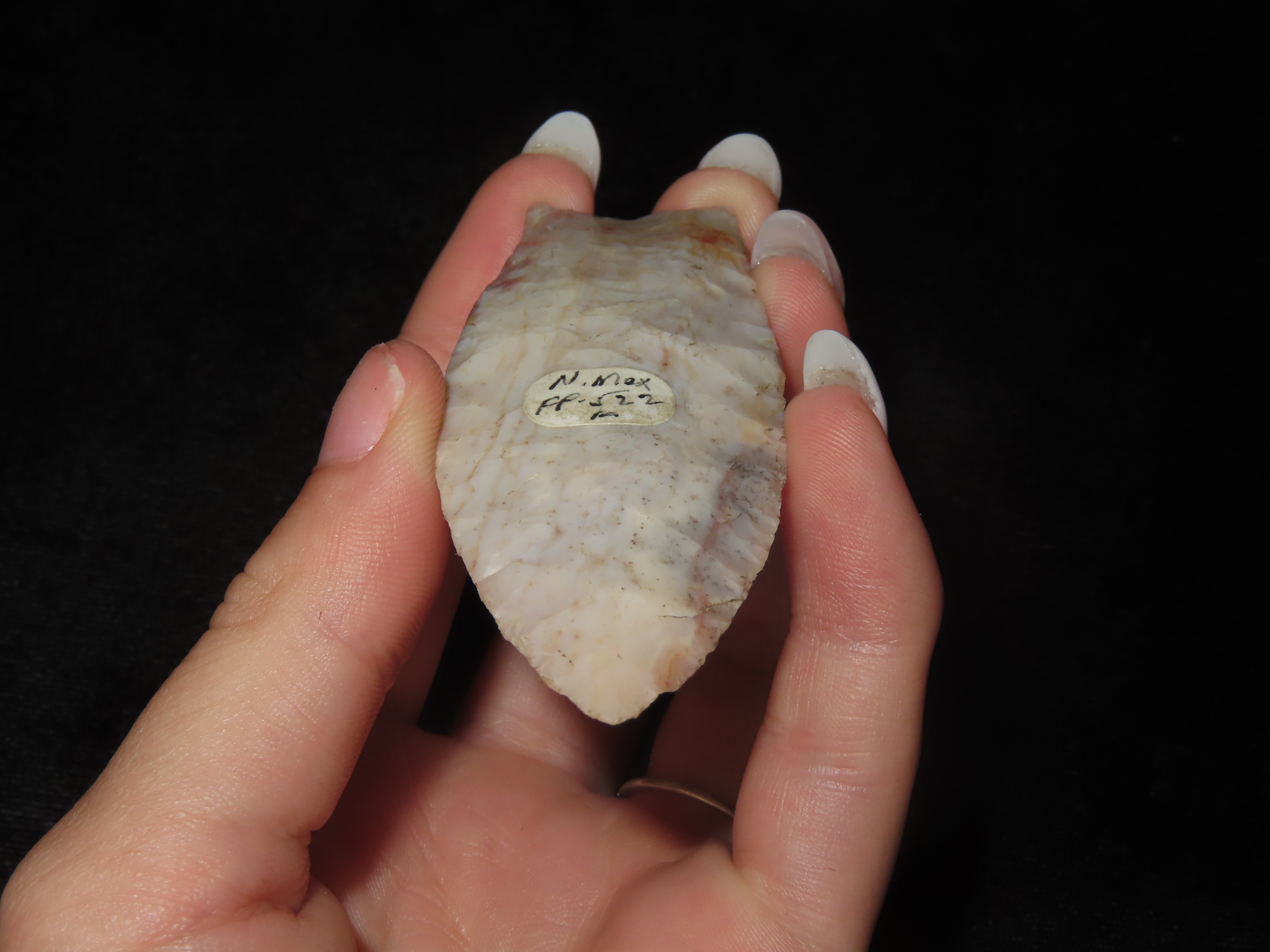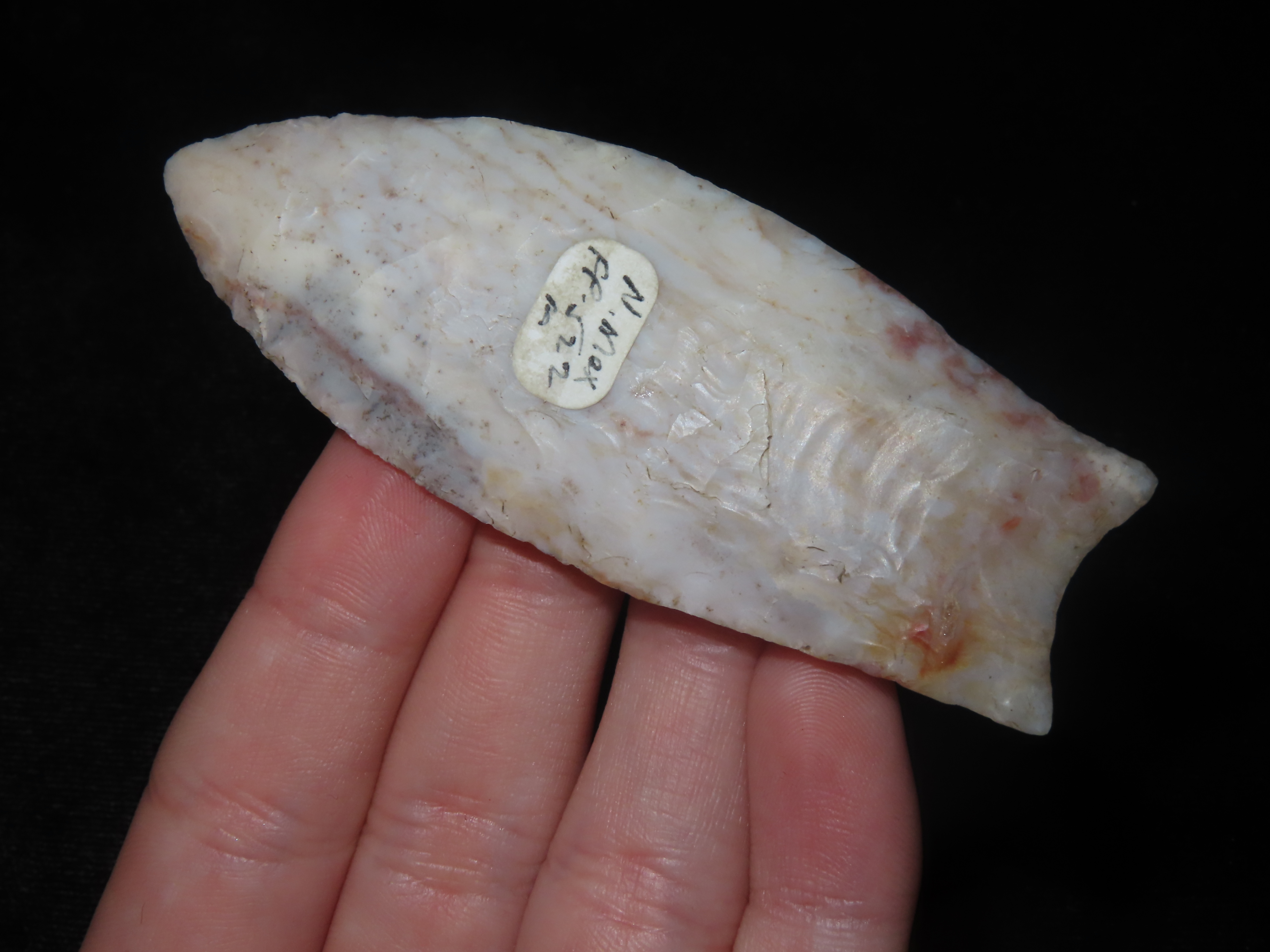 3 1/16″ Alibates Clovis, New Mexico, Motley COA, Very Colorful & Highly Translucent, Well flaked Example, Ex Walt McIntyre Collection. Fluted on Both Sides. Has some Glue on One Side from Being glued in a Frame at one time.