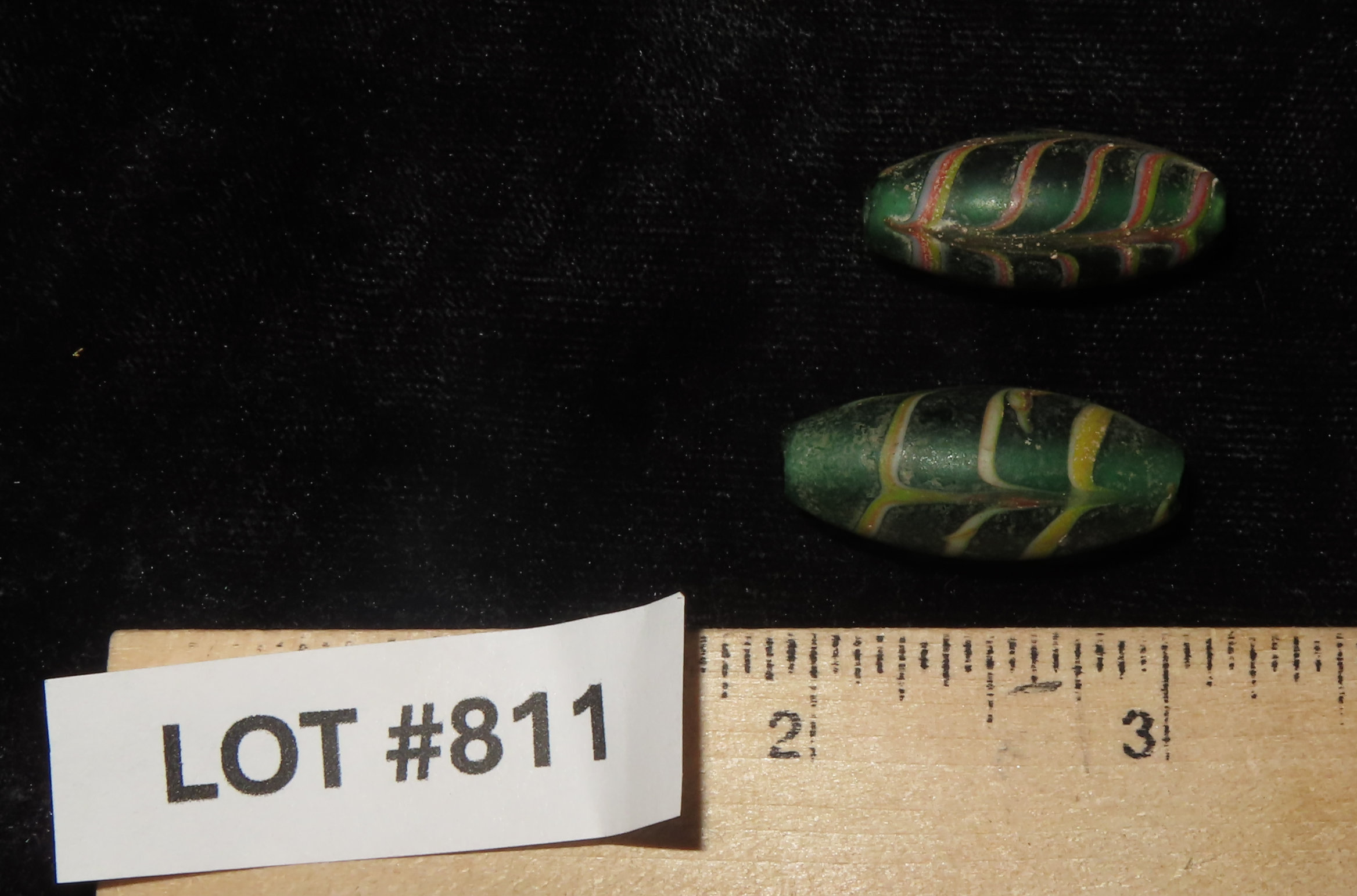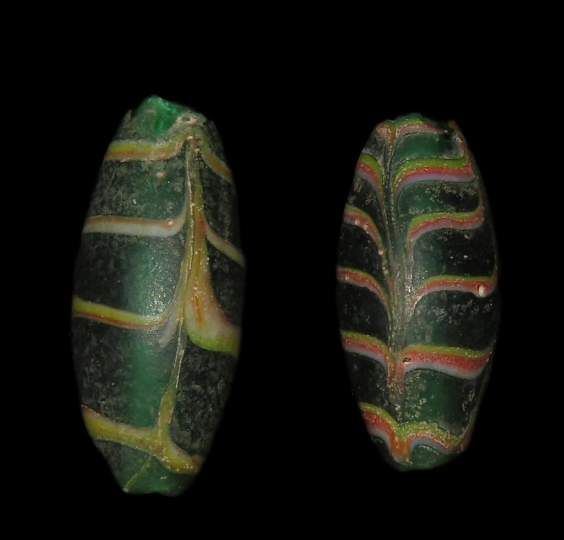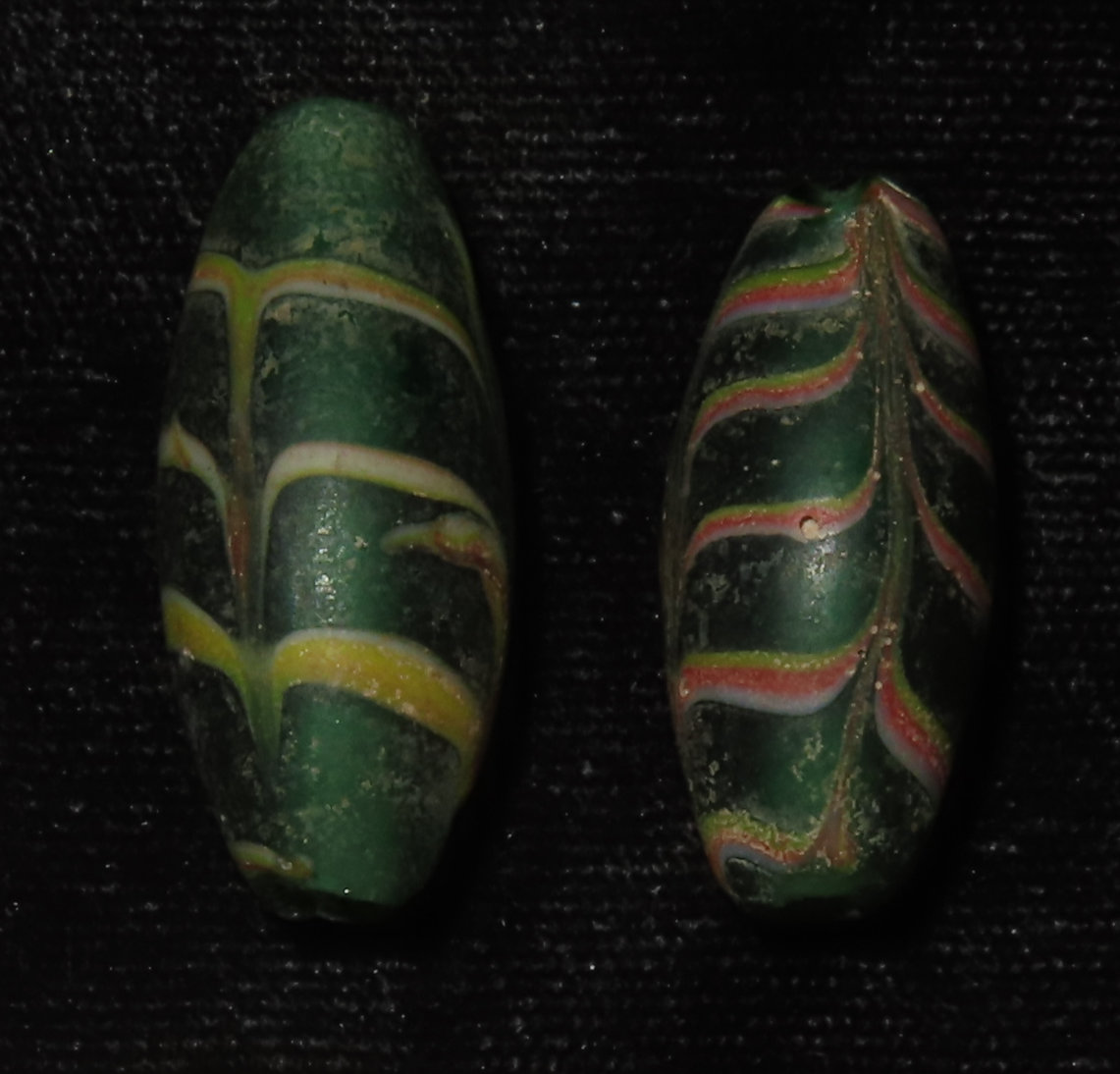 Nice Pair of Green Venetian Feather Beads, Colorful Early Glass Trade Beads