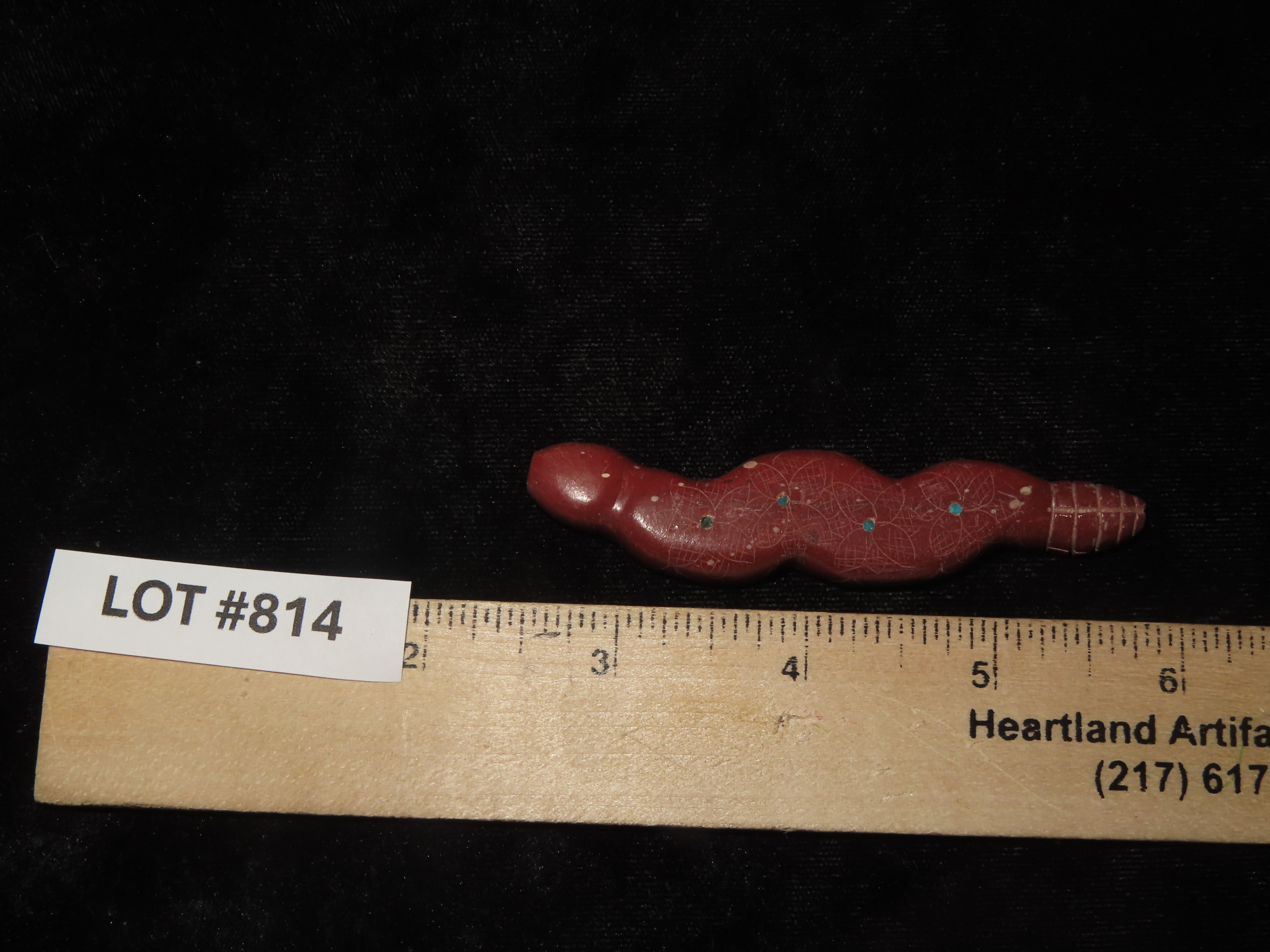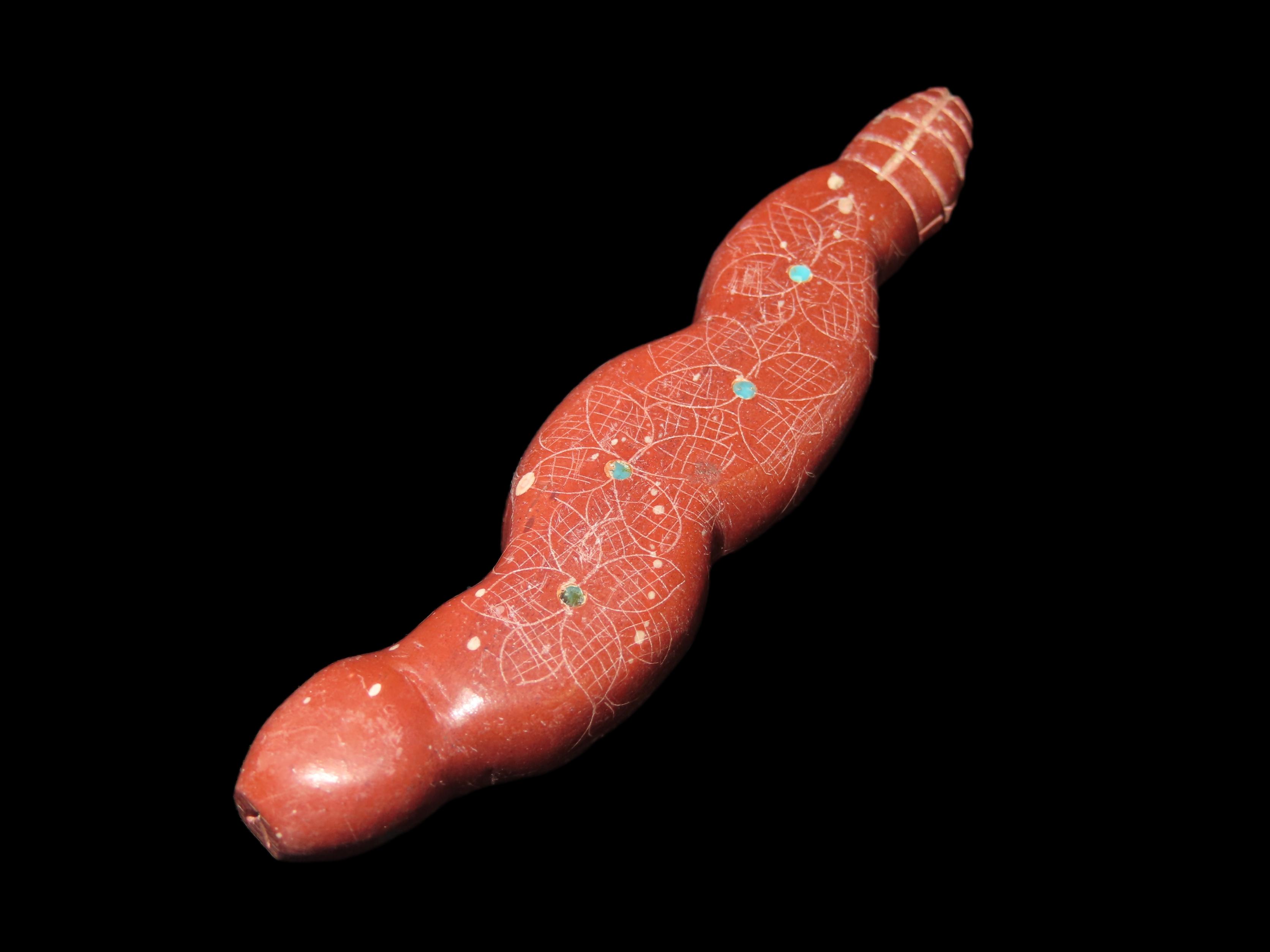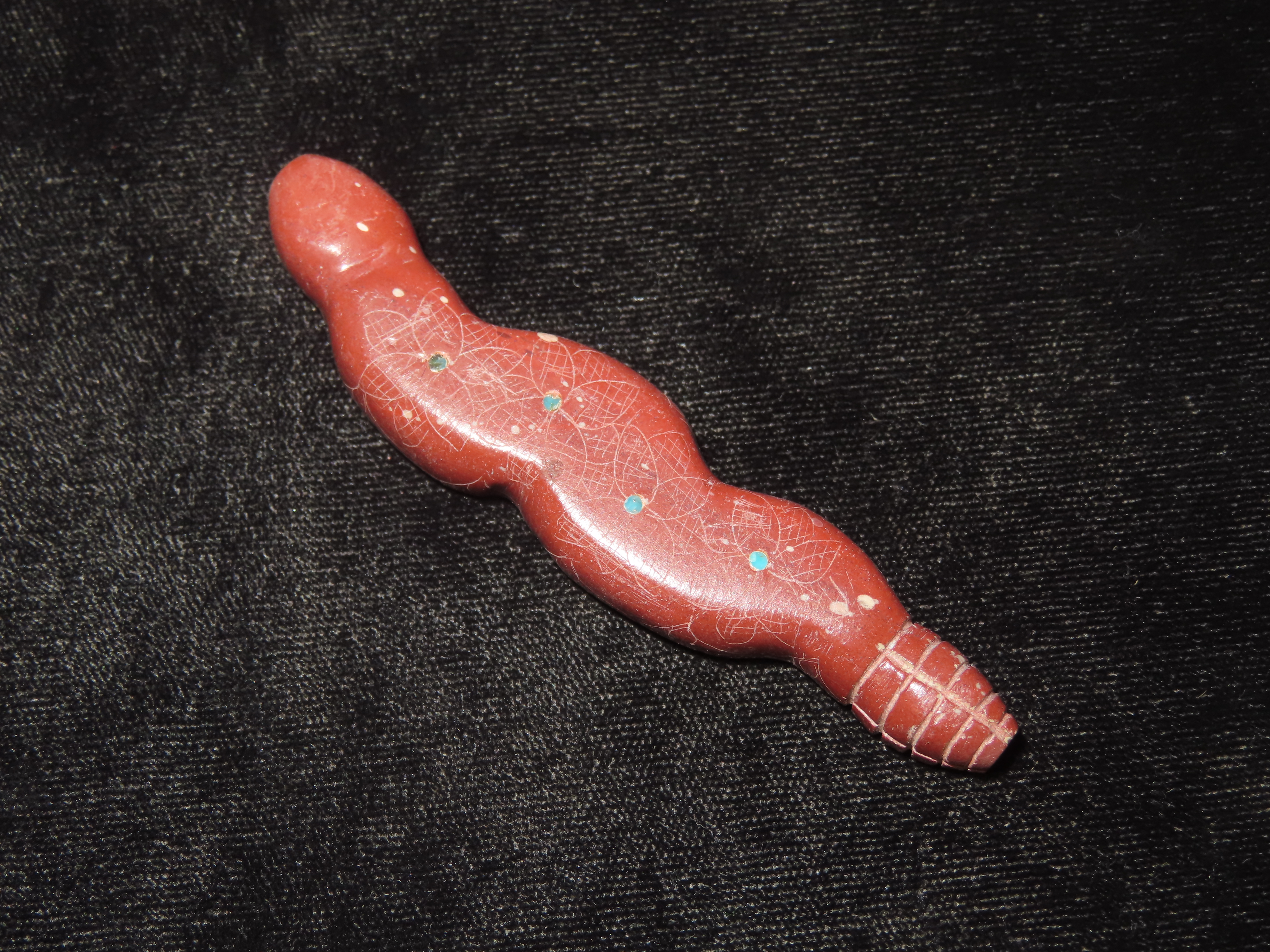 Zuni Fetish, Catlinite Rattlesnake with Turquoise Inlays as Eyes & Decoration Along the Body. Engraved Tail & Etched Design along sides. Great Unique Example.