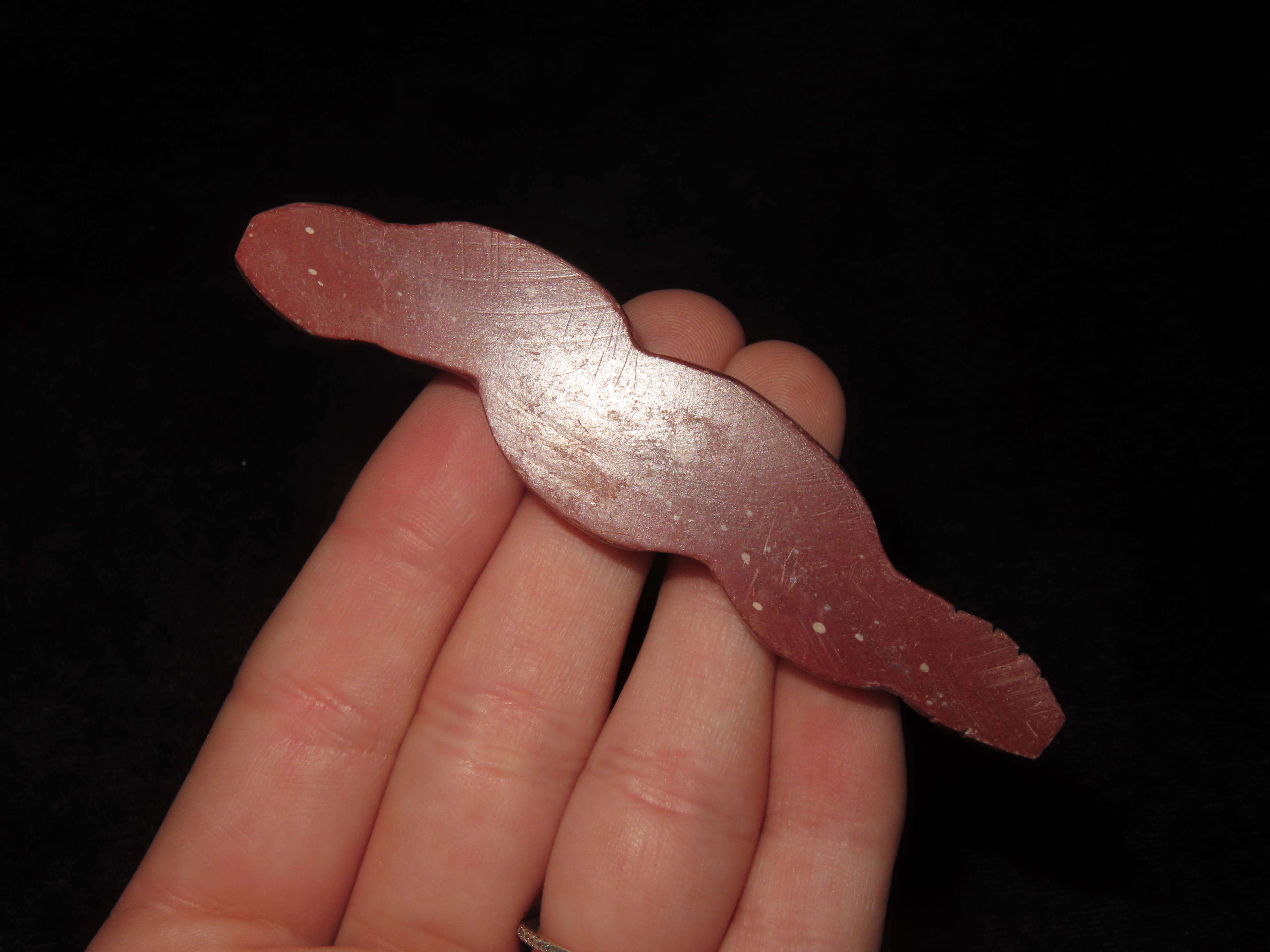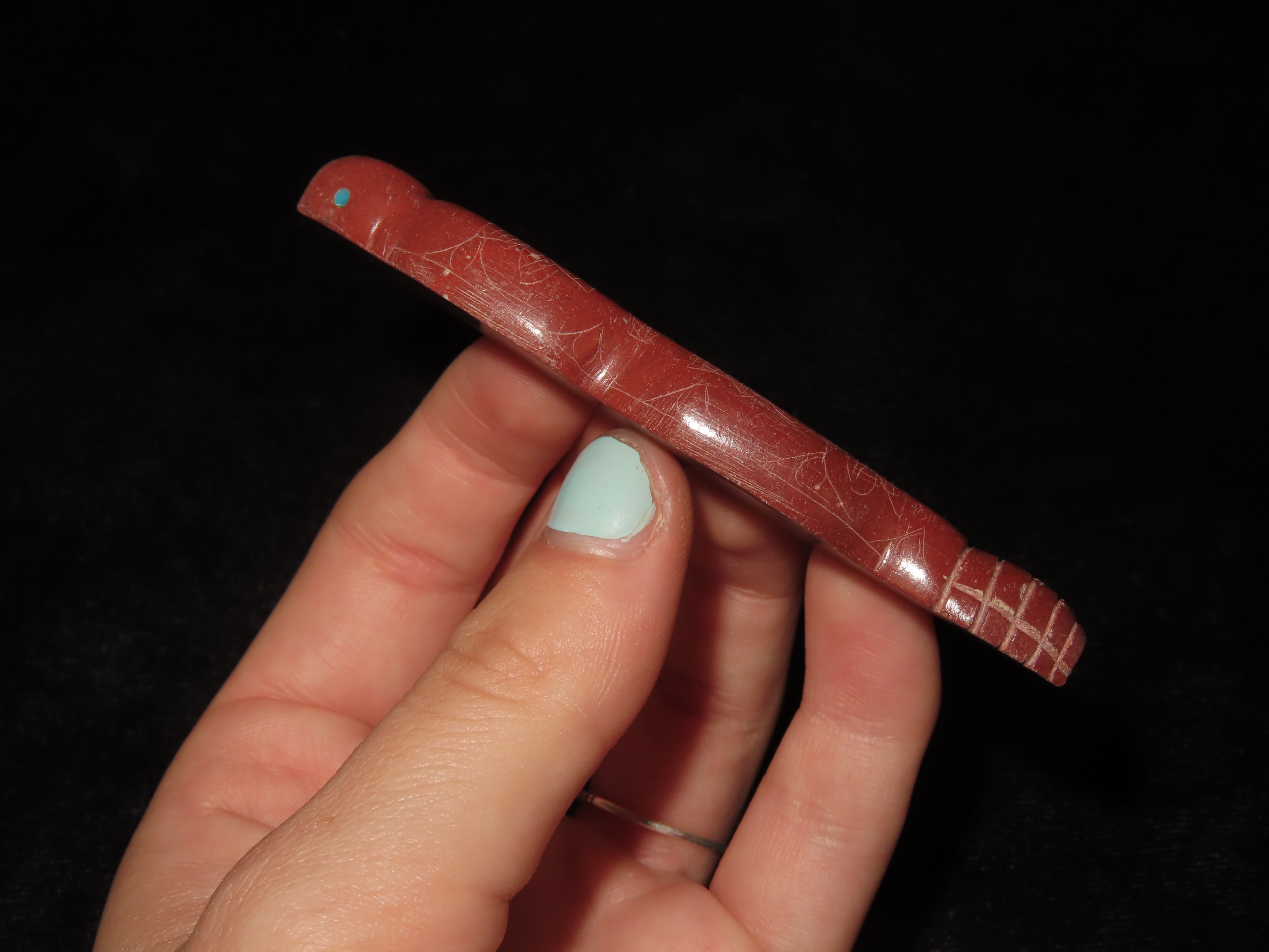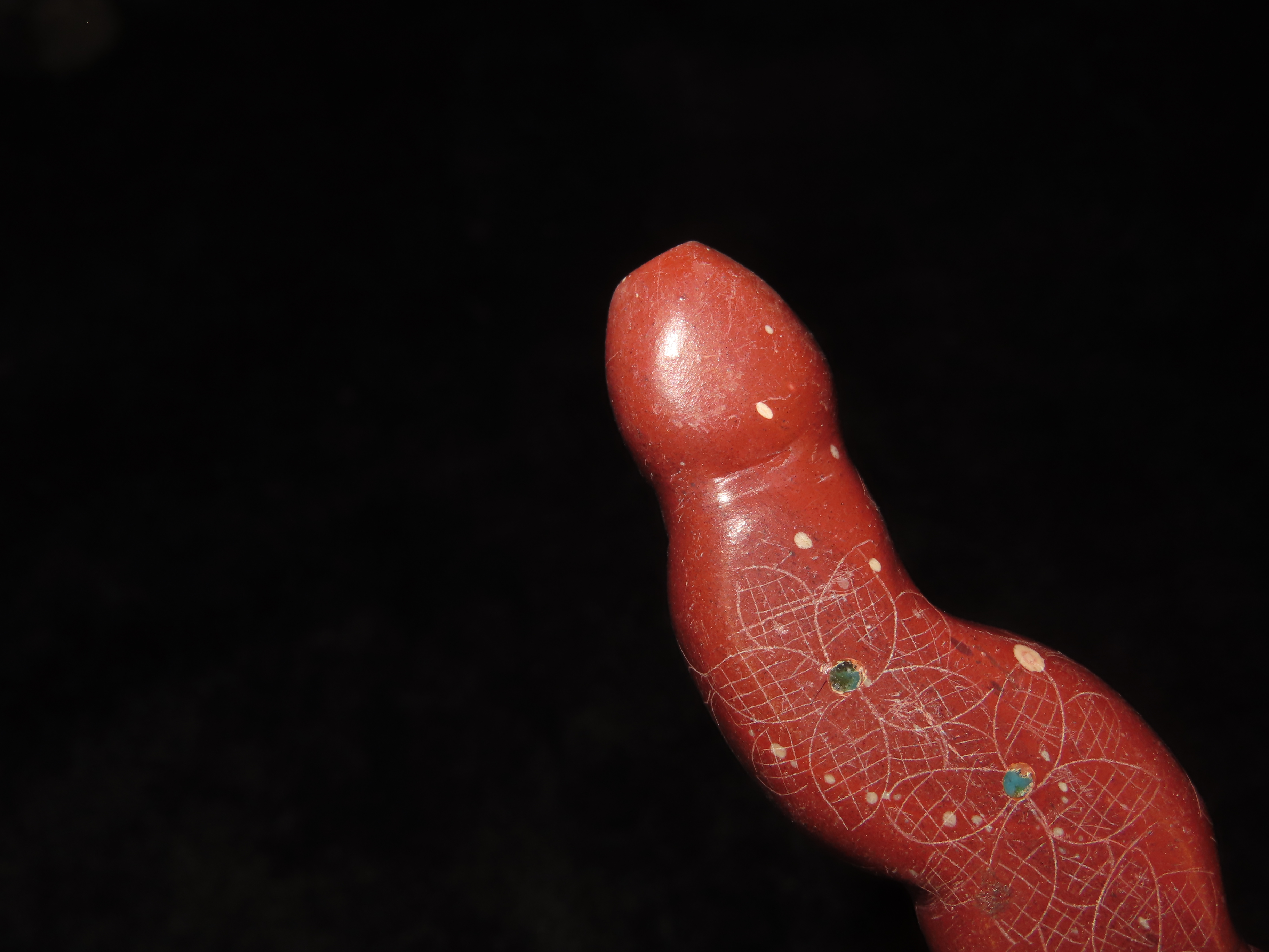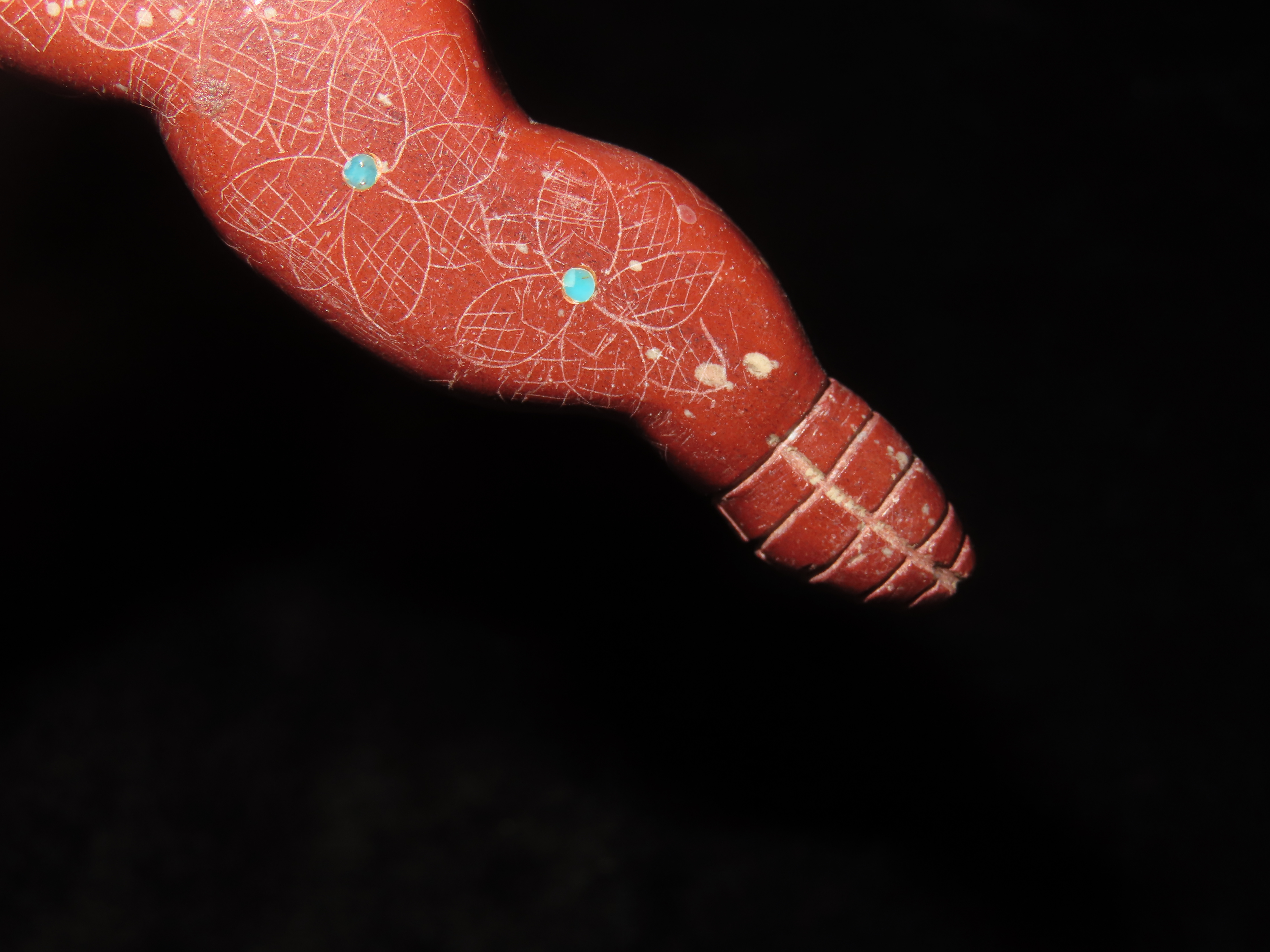 Zuni Fetish, Catlinite Rattlesnake with Turquoise Inlays as Eyes & Decoration Along the Body. Engraved Tail & Etched Design along sides. Great Unique Example.