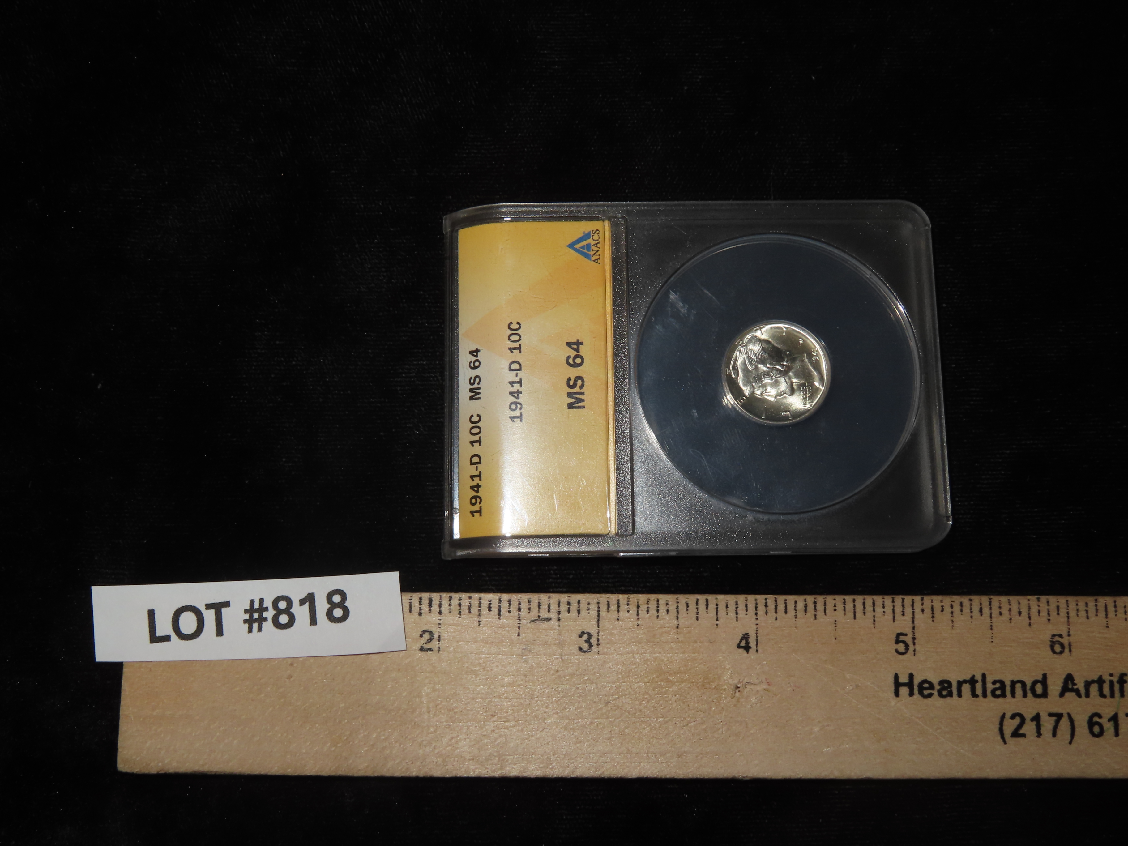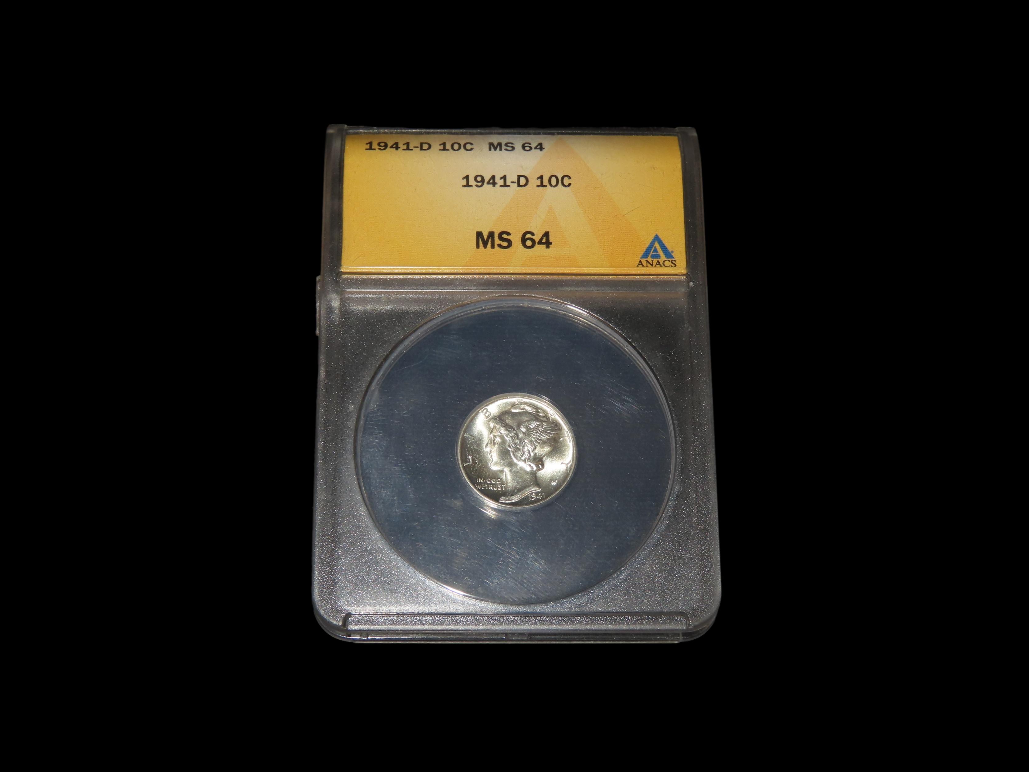 HIGH GRADE 1941-D Mercury Dime, MS-64, ANACS Slabbed & Graded, Amazing Brilliant Uncirculated Condition, Early U.S. Silver Coin.