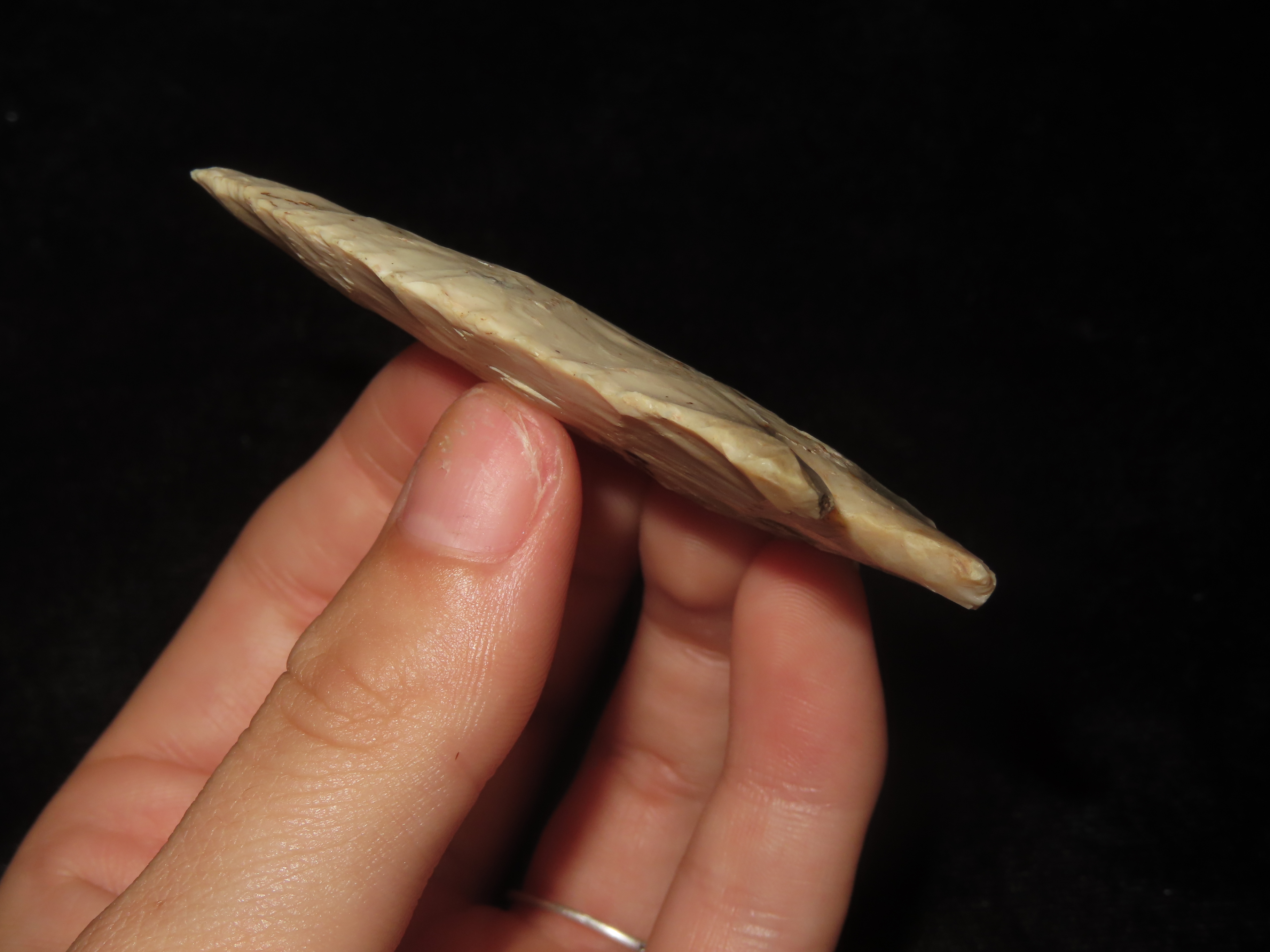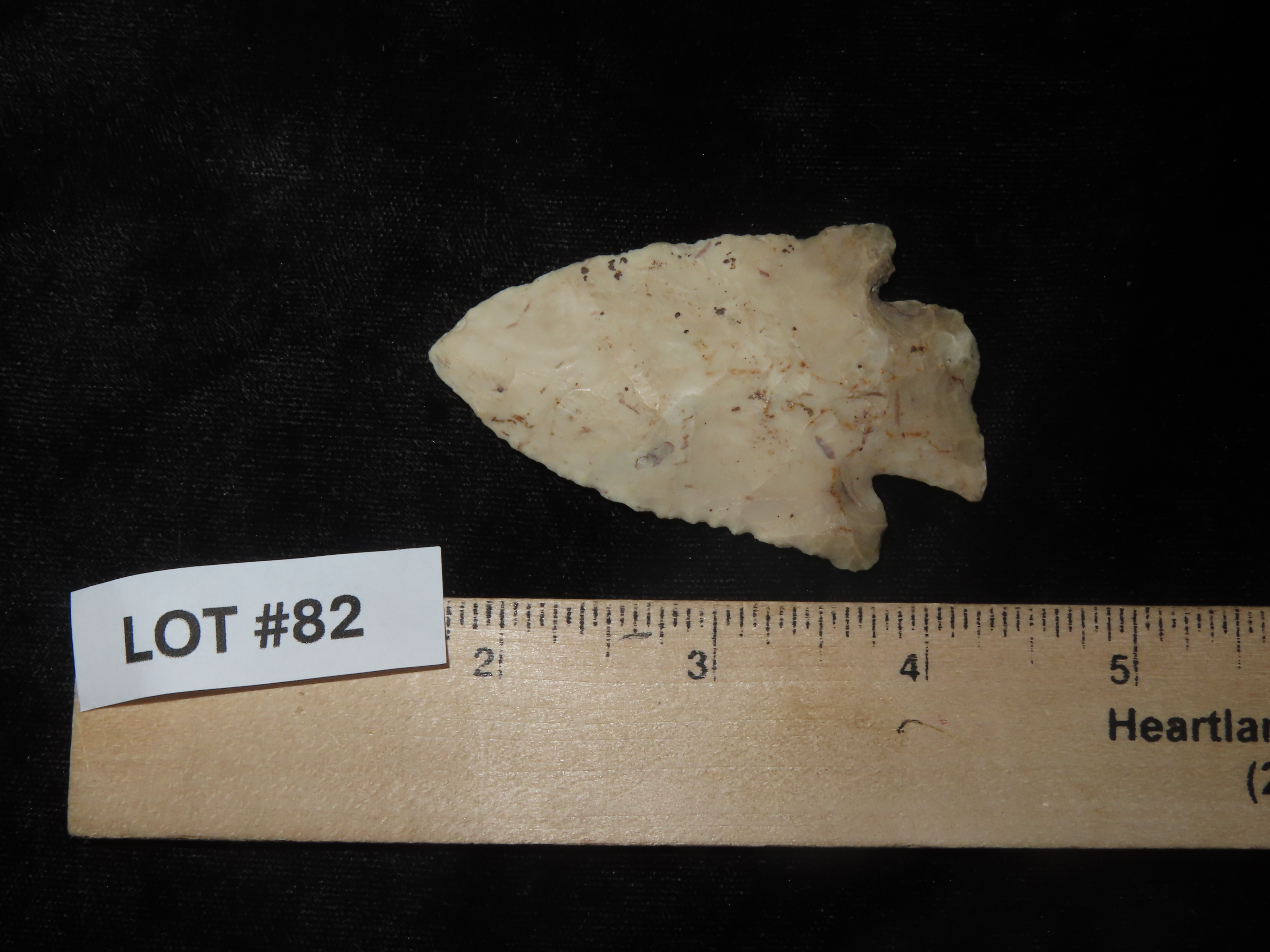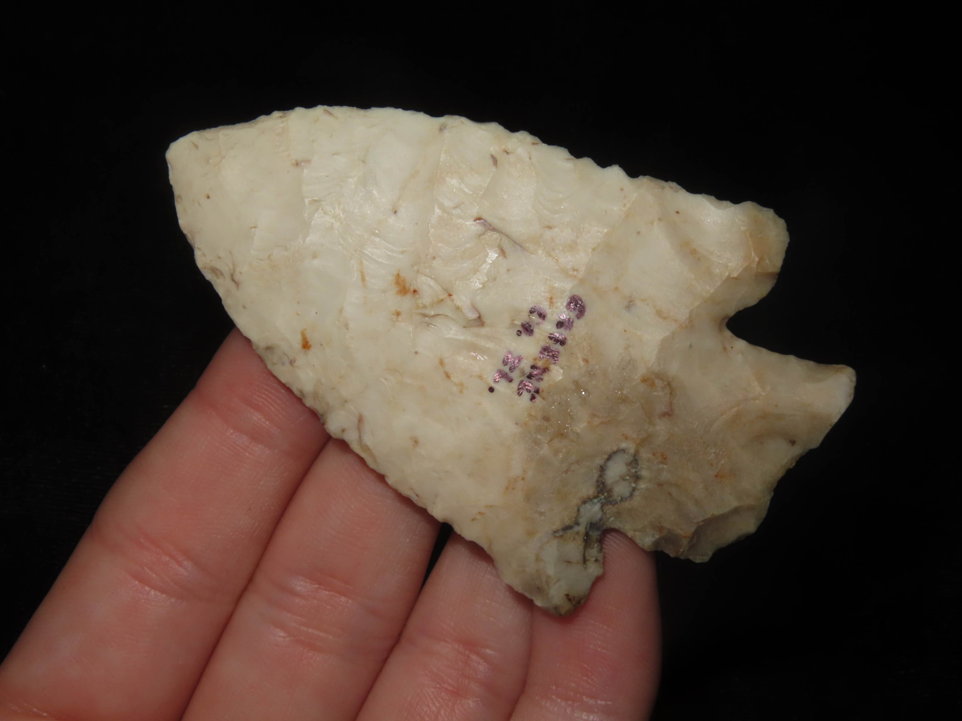 2 3/4″ Hardin Barbed, Greene Co. Illinois. Amazing Classic Example, Super thin & Well Flaked, Semi Translucent. Old Ear Ding keeps it Affordable. But still a Wonderful Example!