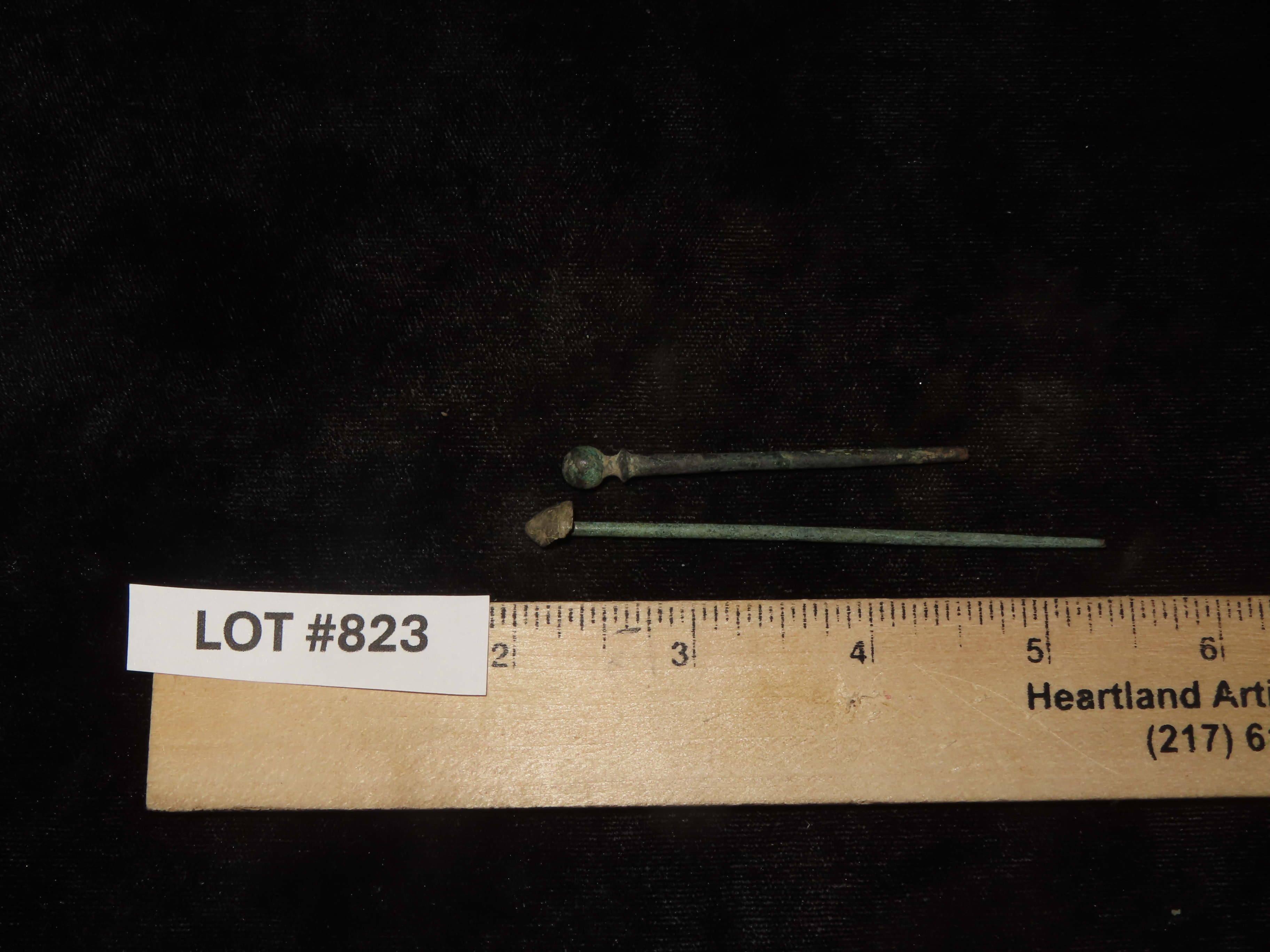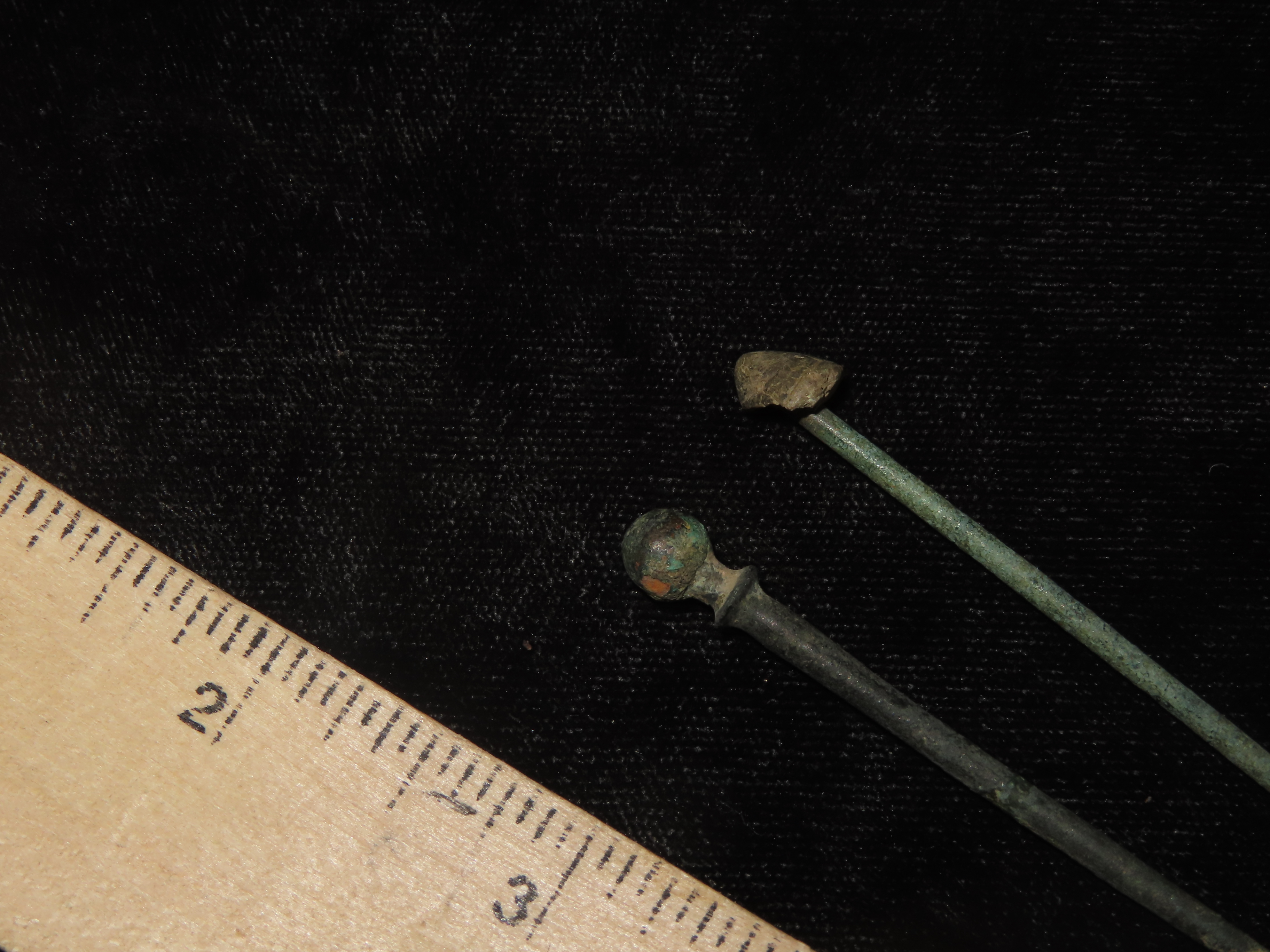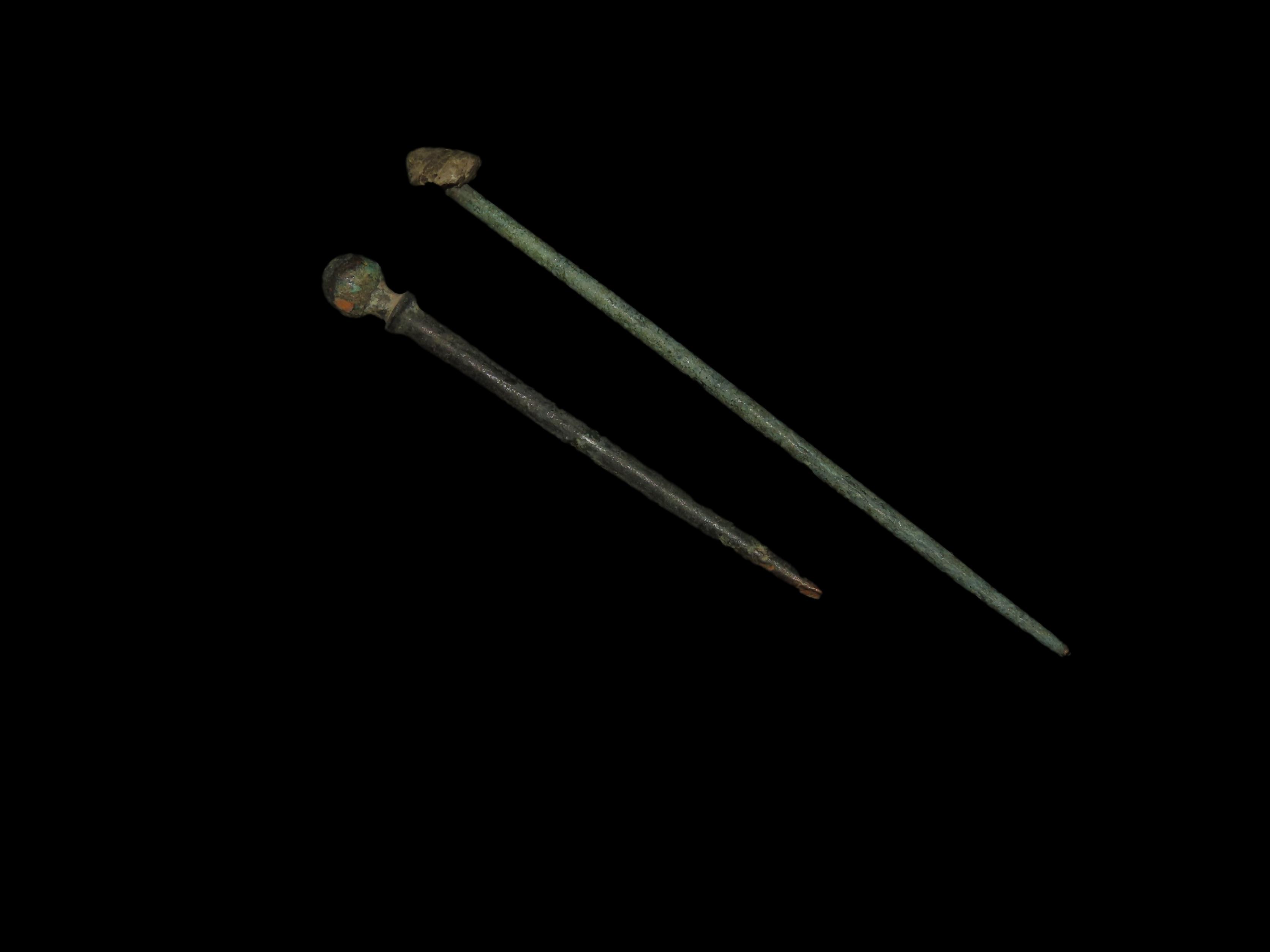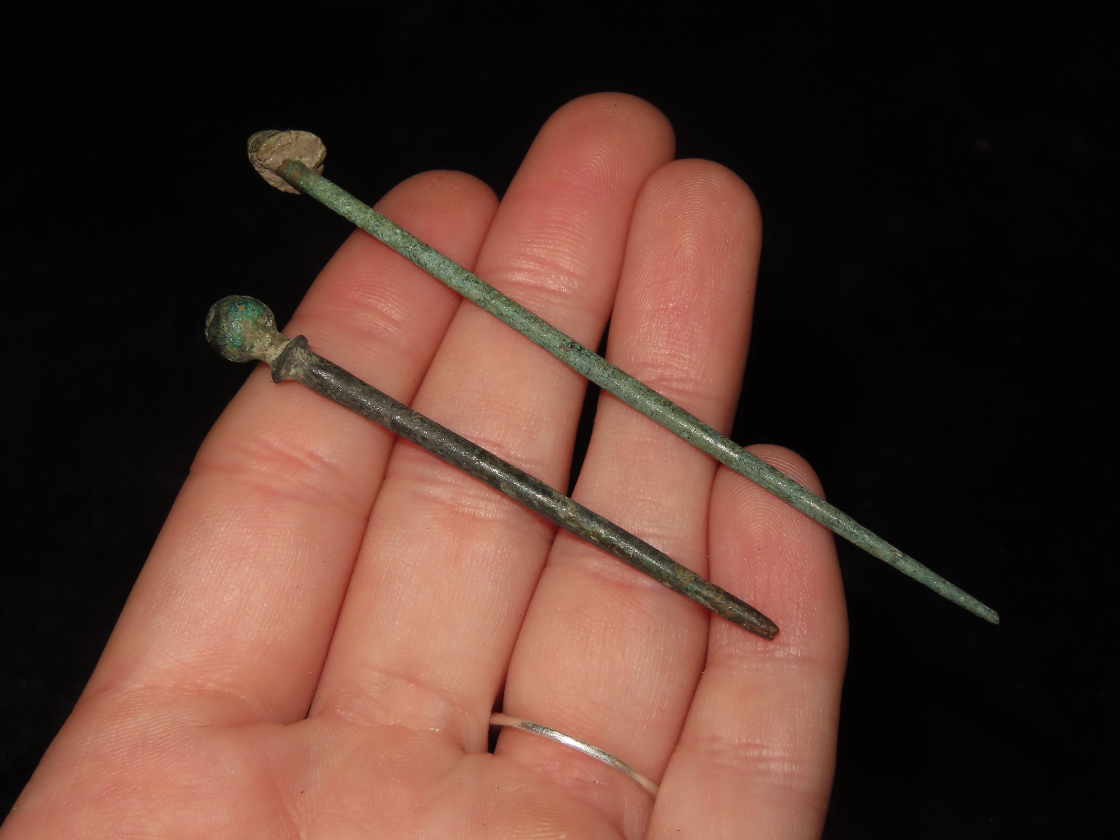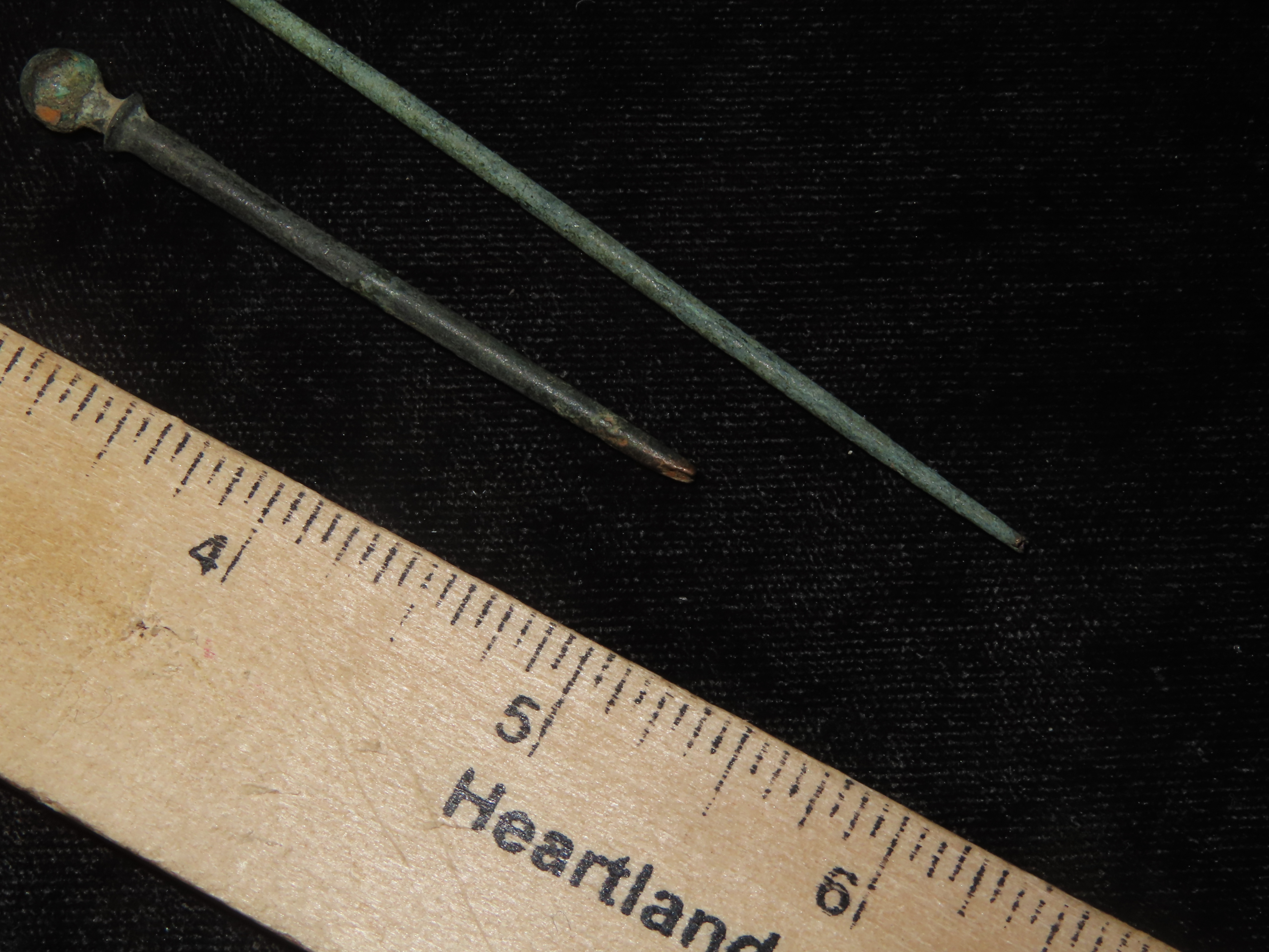 Great Pair of Ancient Roman Bronze Hairpins, Needles, Awls. Very Nicely Decorated Examples.