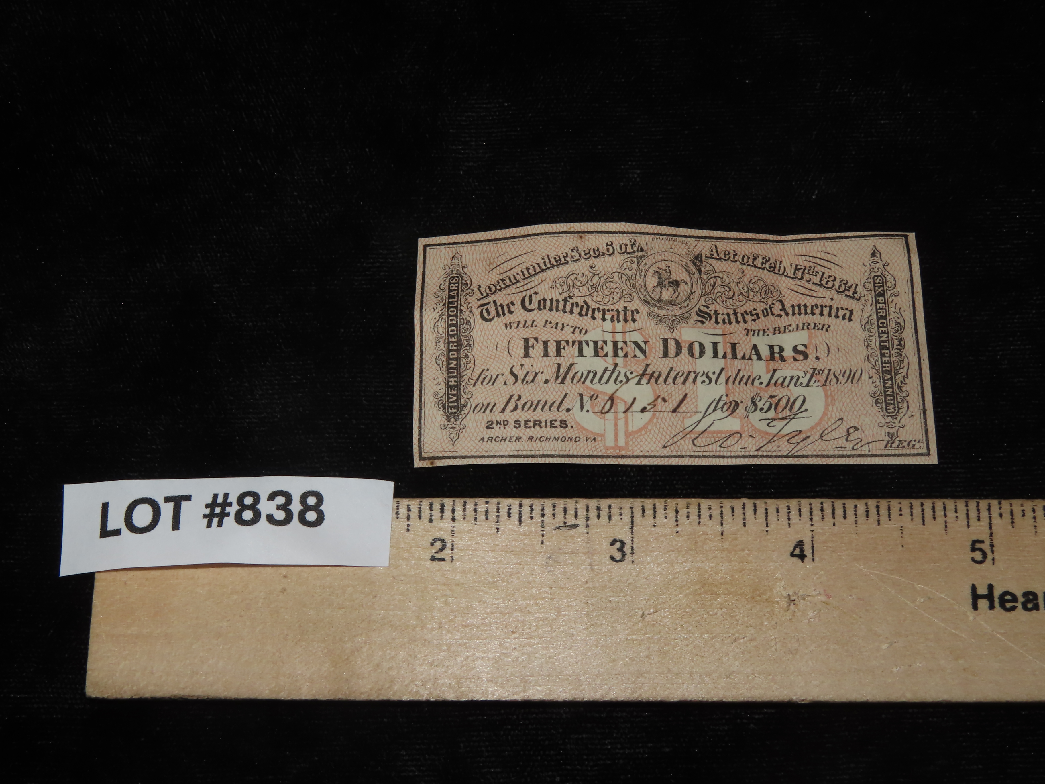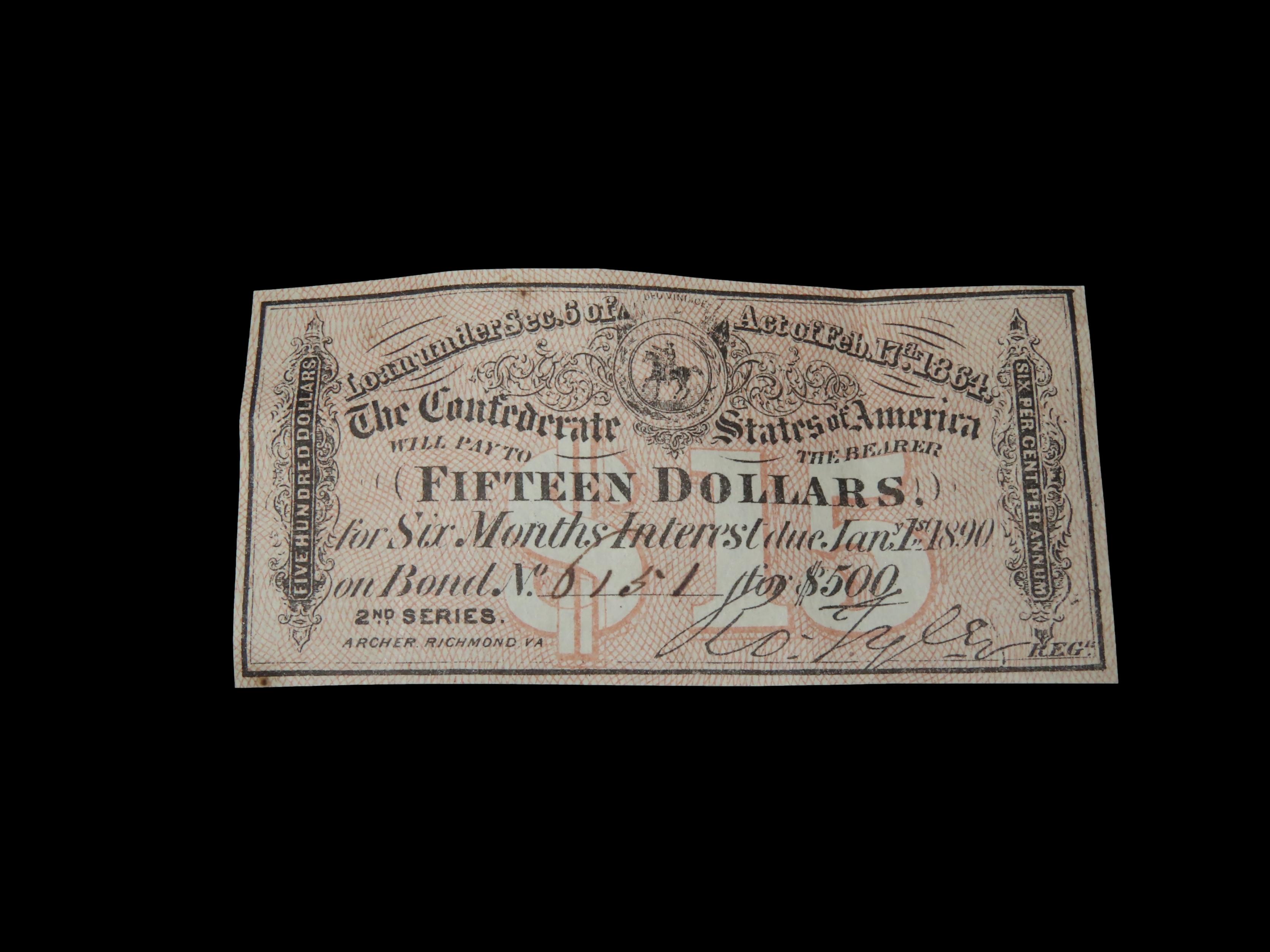 Civil War Confederate States $15 Bond Note, Dated Feb. 17th, 1864. Original Hand Signed Document from the Time Period. Great Piece of American History