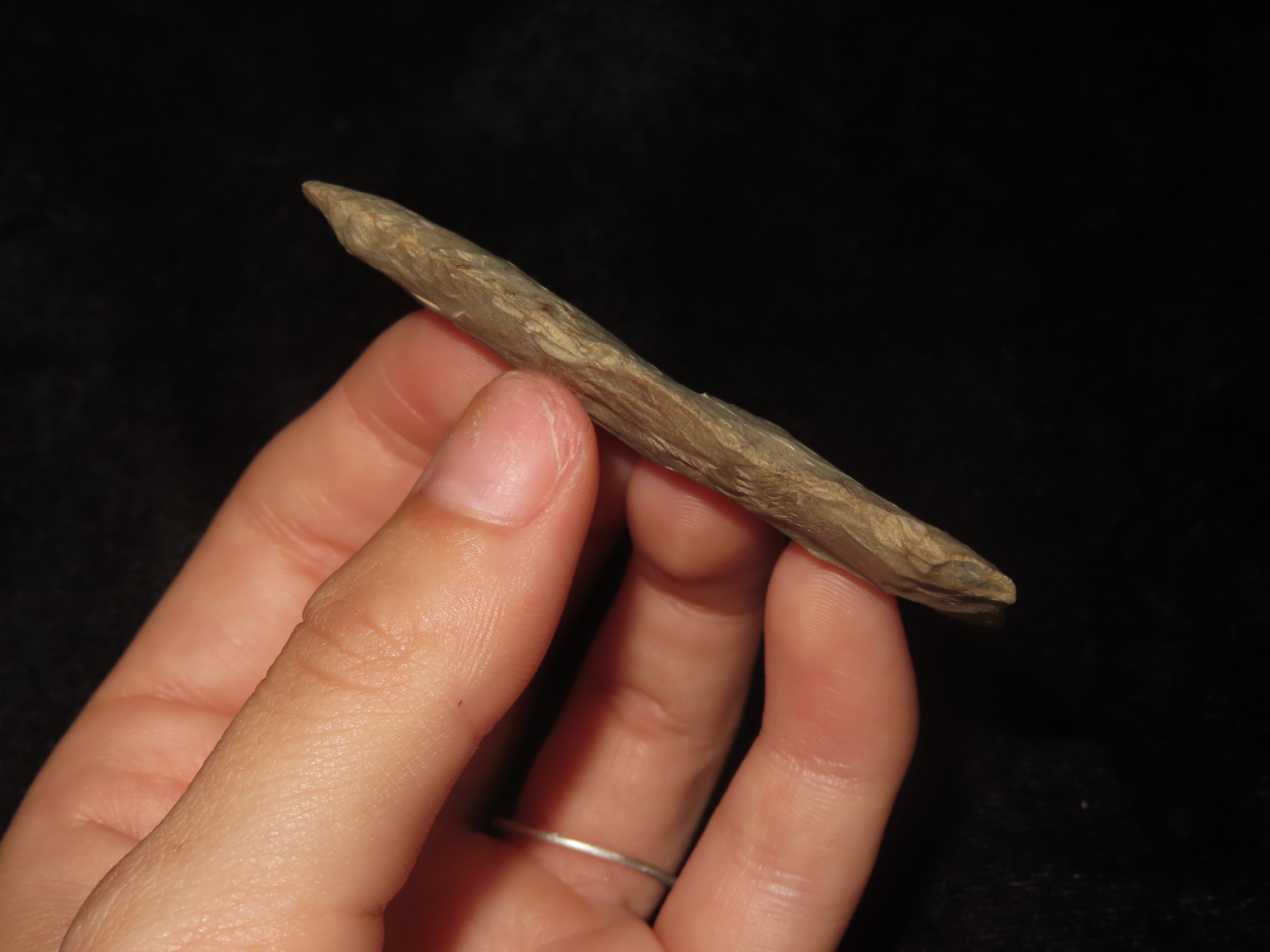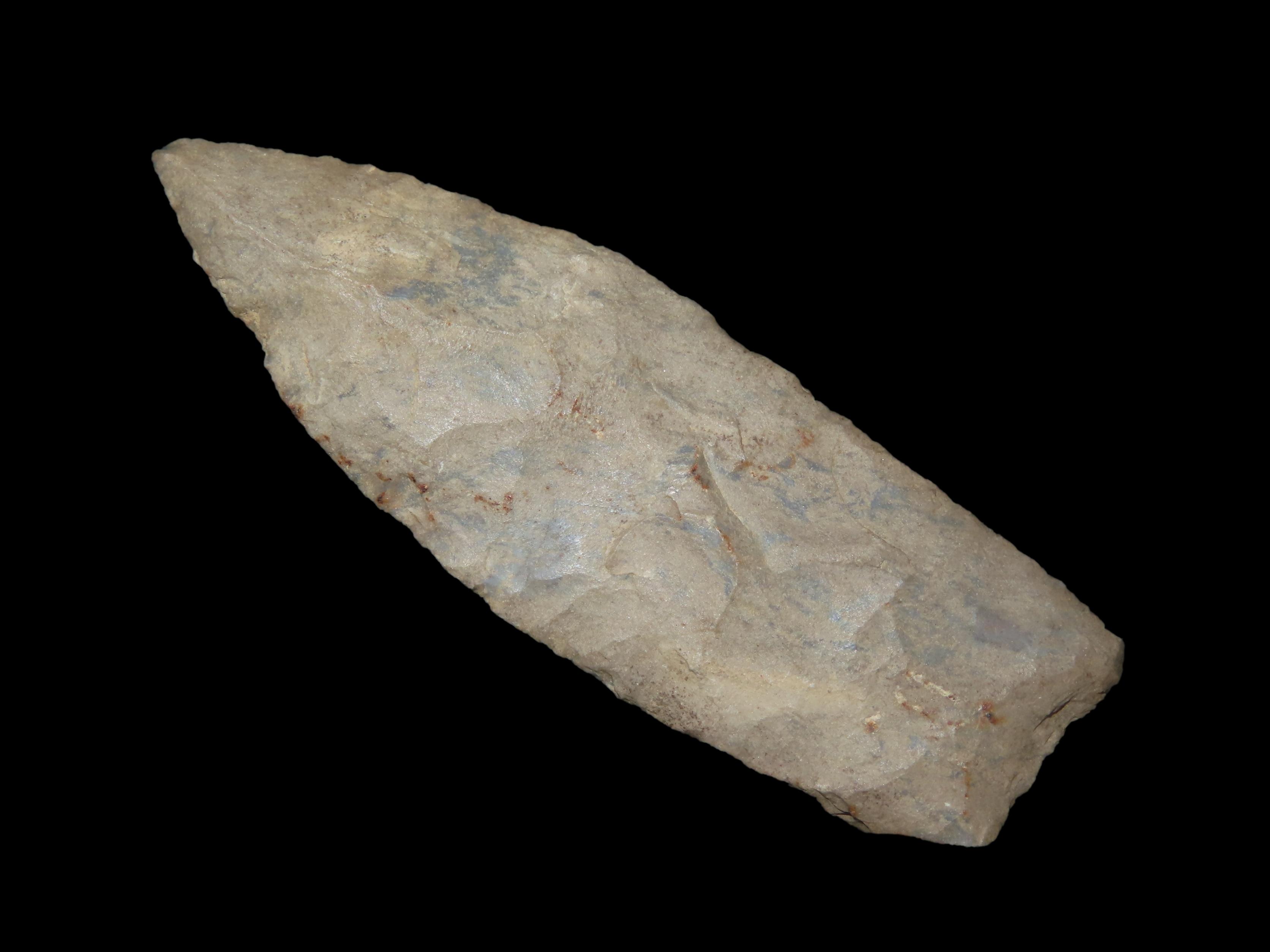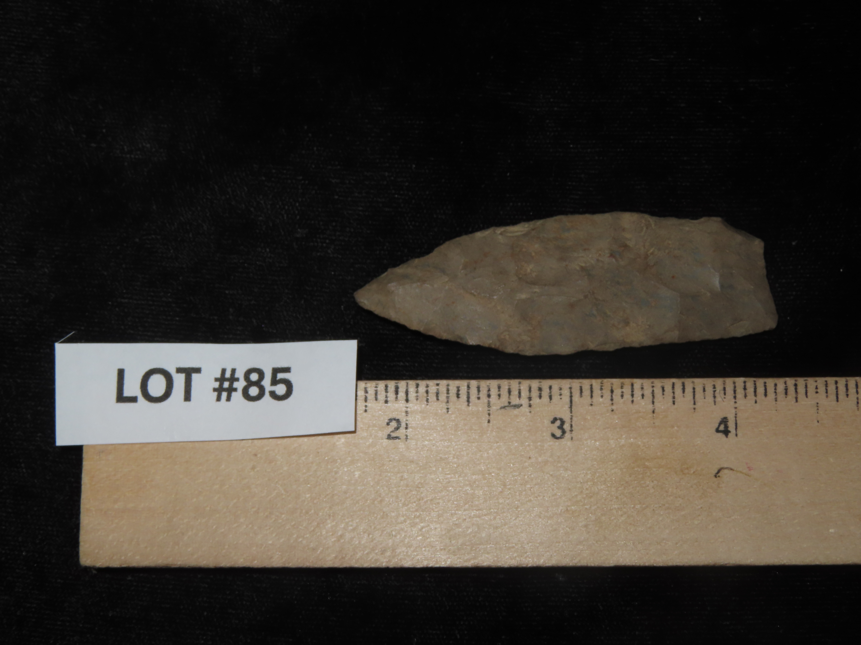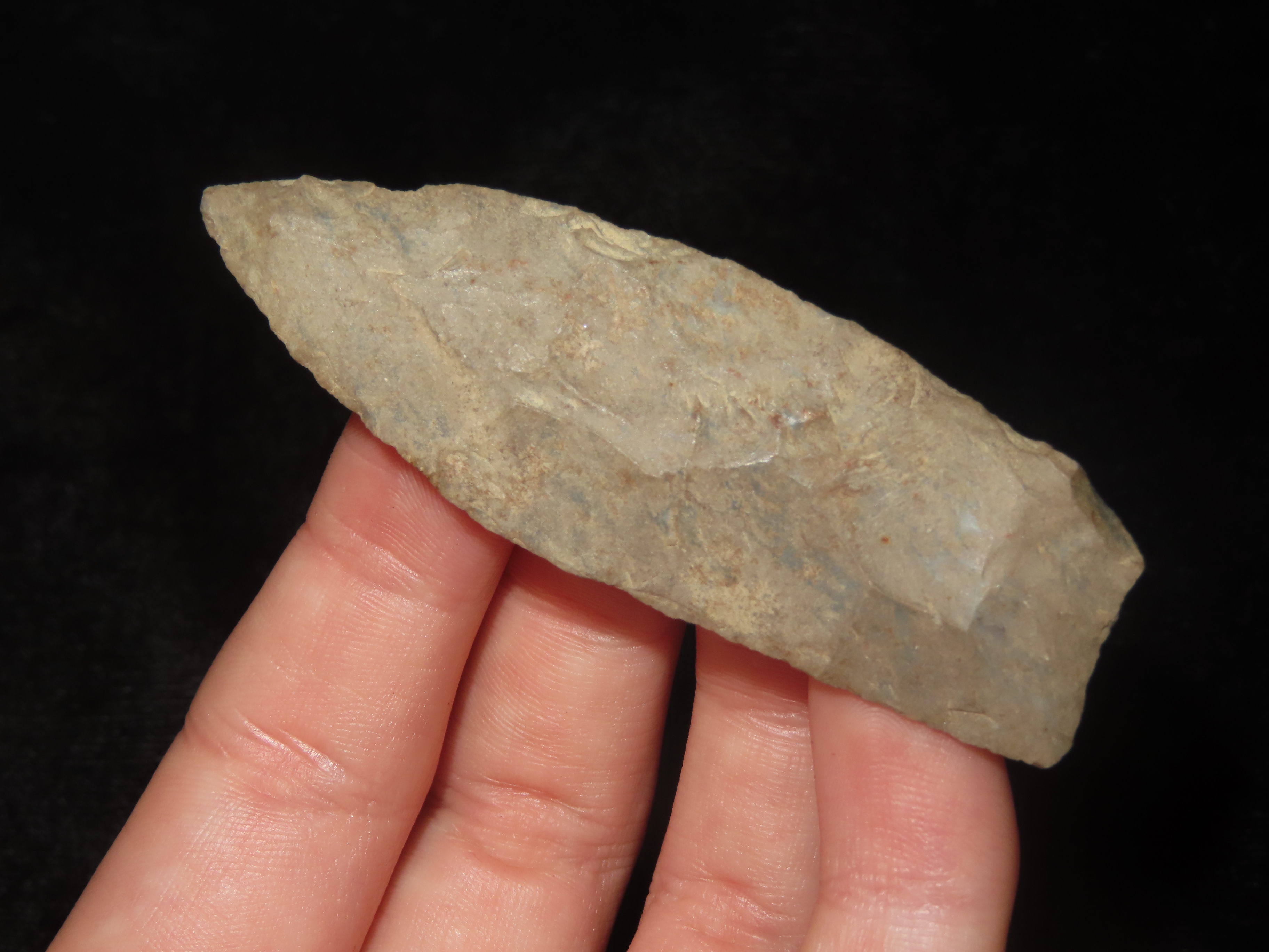 2 5/8″ Plainview Paleo Lance, Western Kentucky. Very thin & well flaked example. Nicely Ground Basal edges. Heavily Patinated Fort Payne Chert