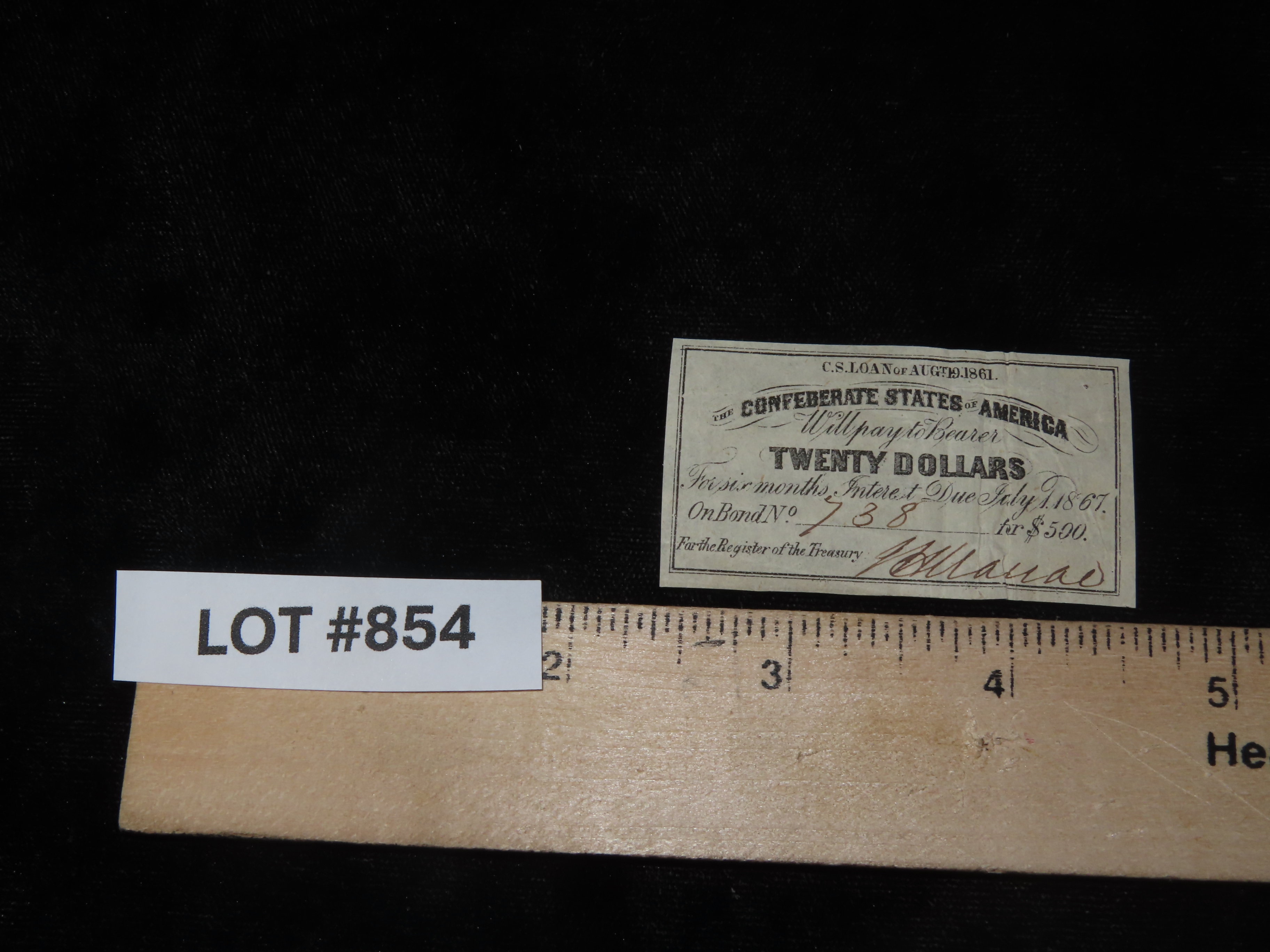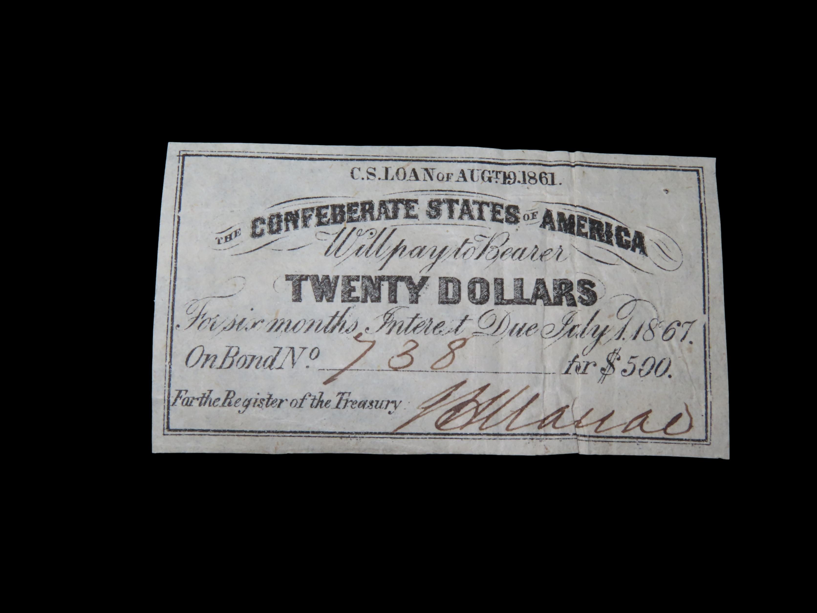 Civil War Confederate States $20 Bond Note, Dated August 19th, 1861. Original Hand Signed Document from the Time Period. Great Piece of American History