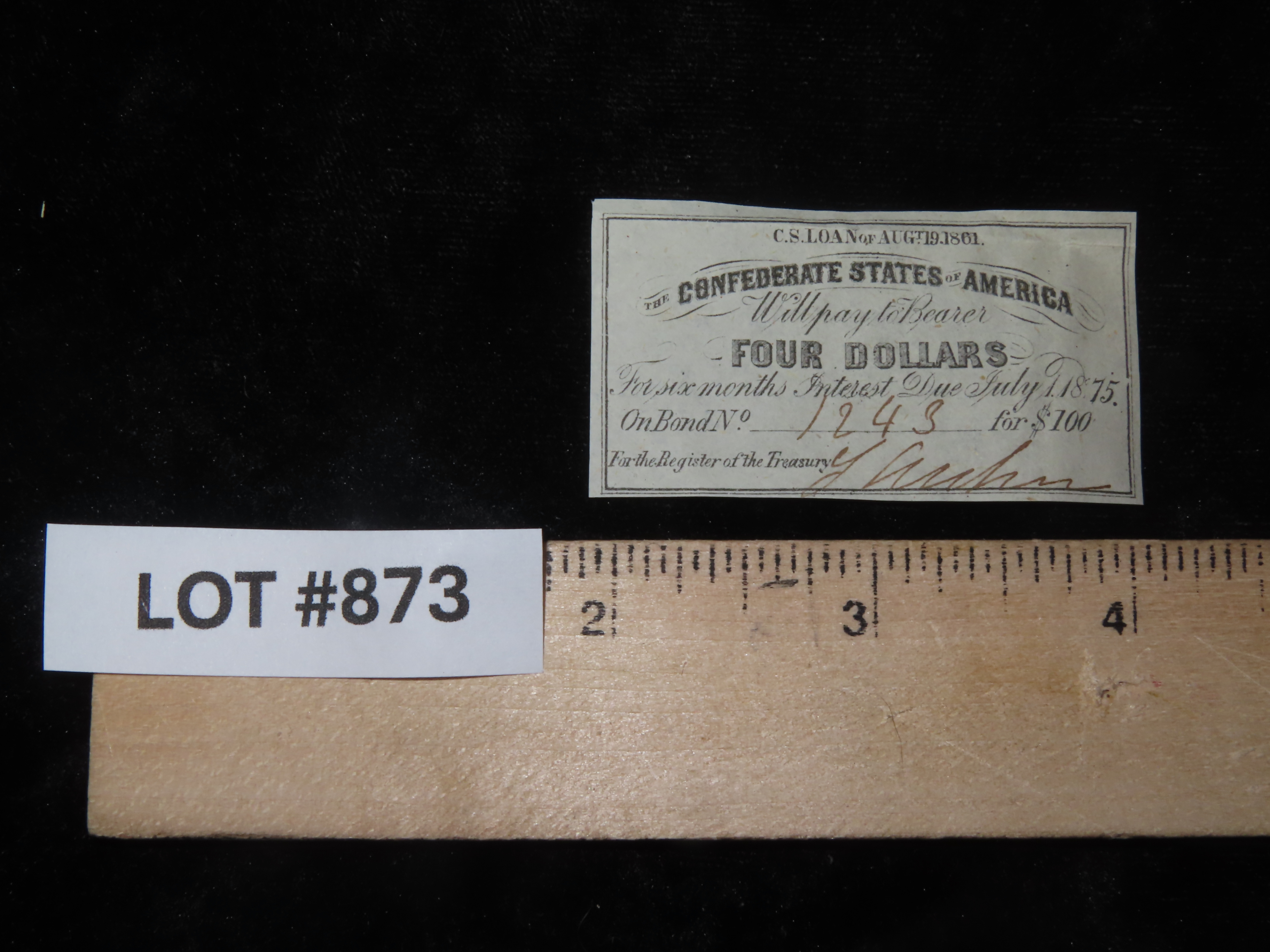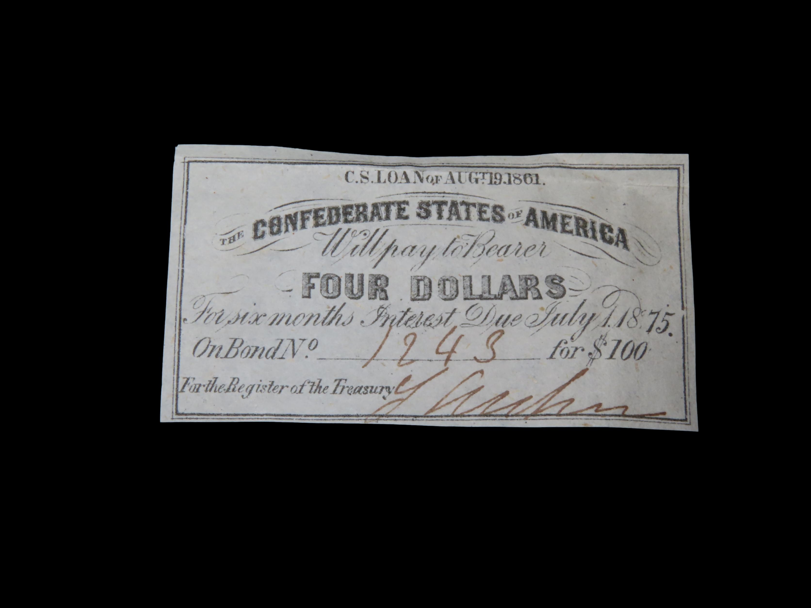 Civil War Confederate States $4 Bond Note, Dated August 19th, 1861. Original Hand Signed Document from the Time Period. Great Piece of American History