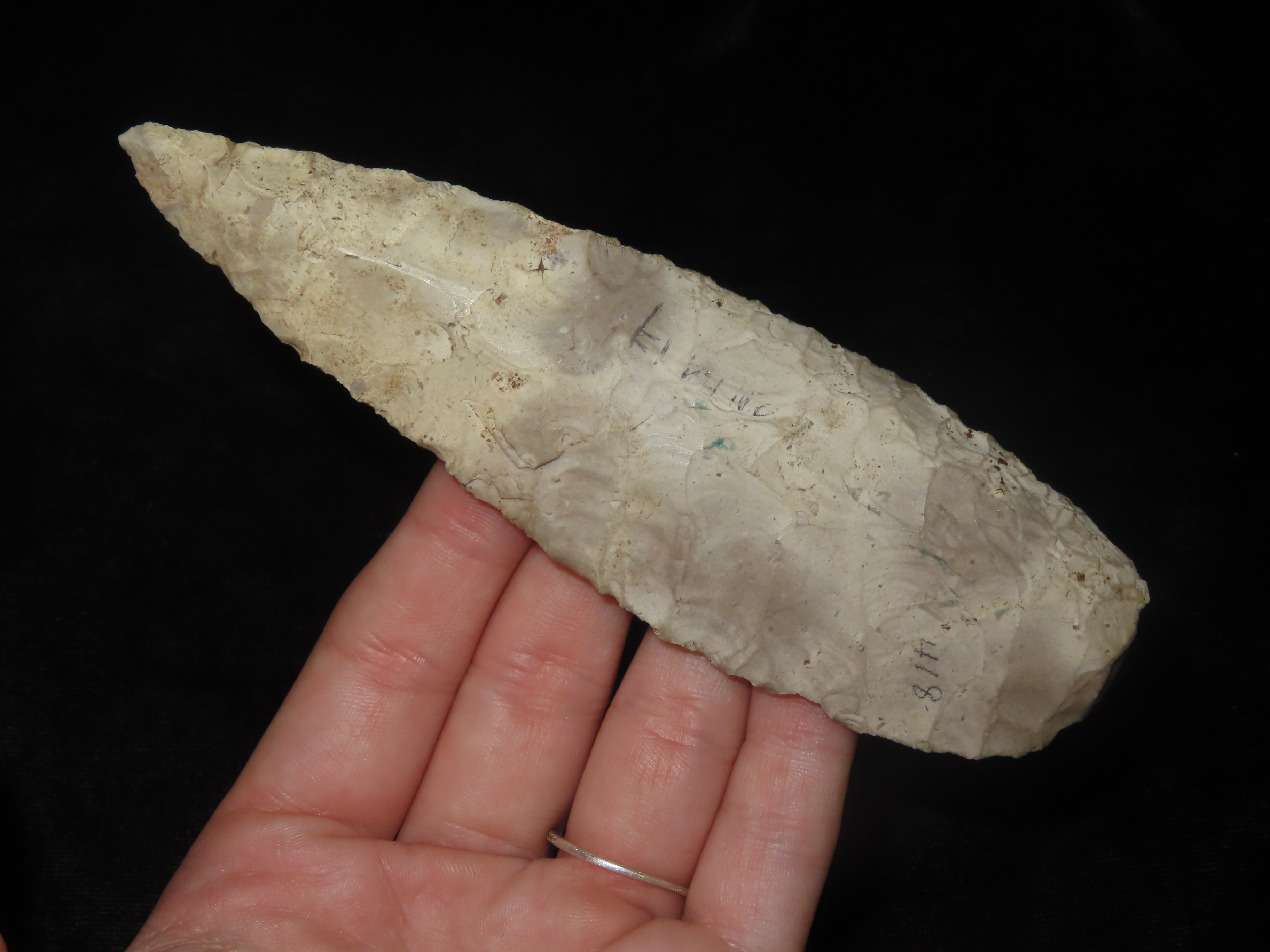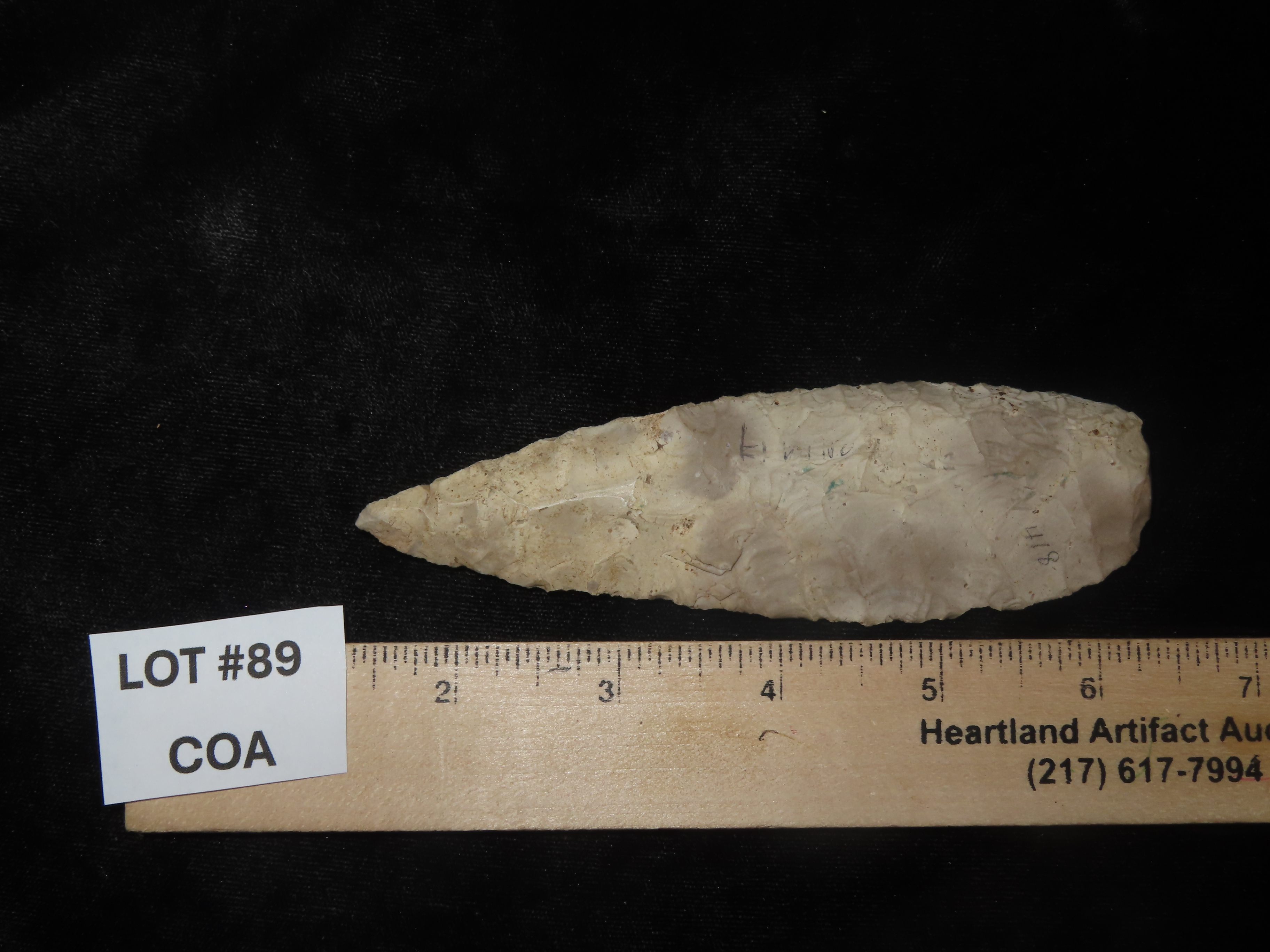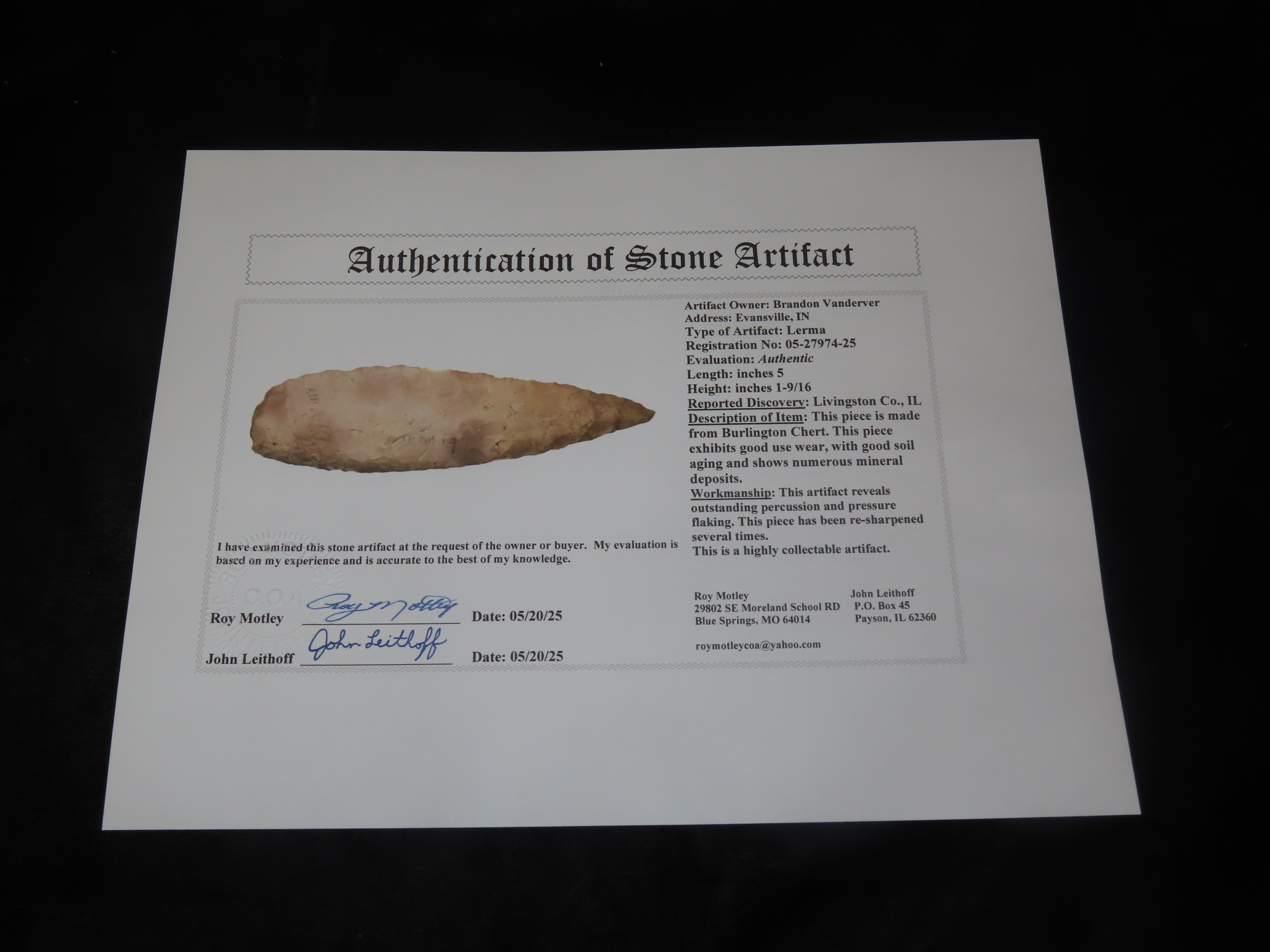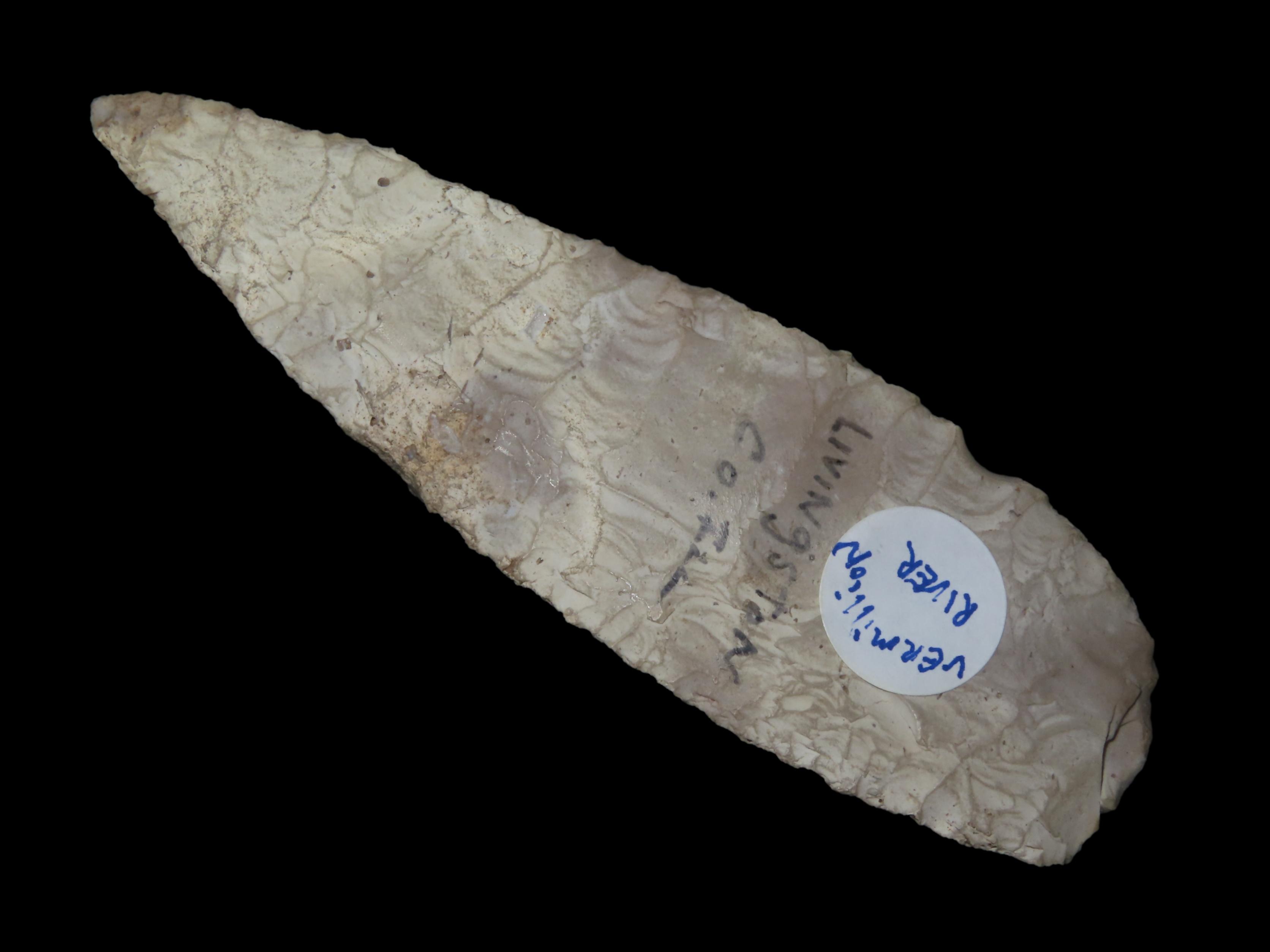 Outstanding 5″ Lerma Blade, Livingston Co Illinois, Motley COA. Found along the Vermillion River, Nice Early Flaking and No Brainer Heavy Patination!