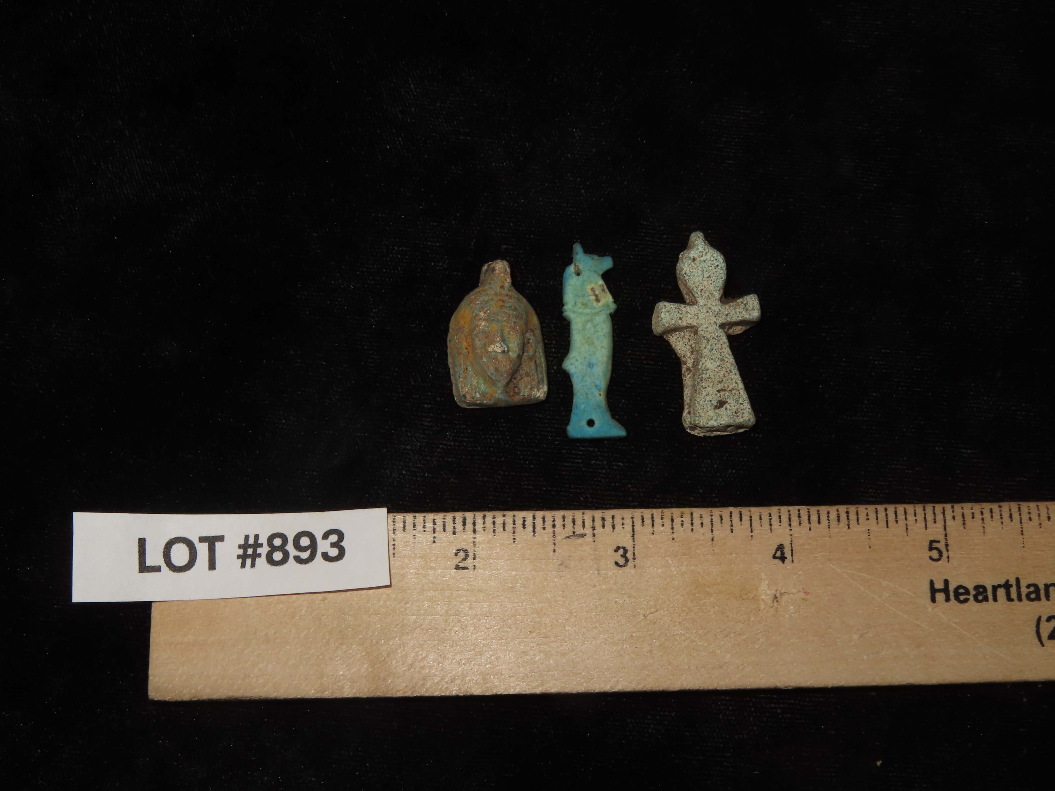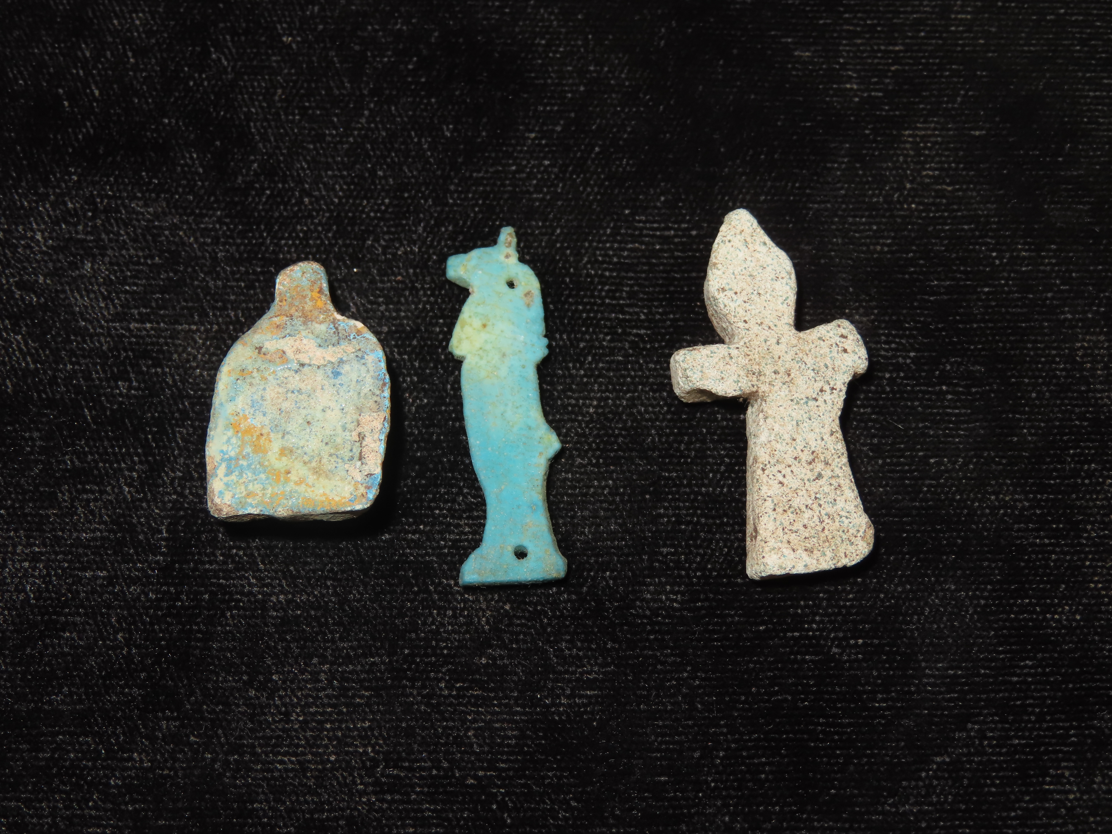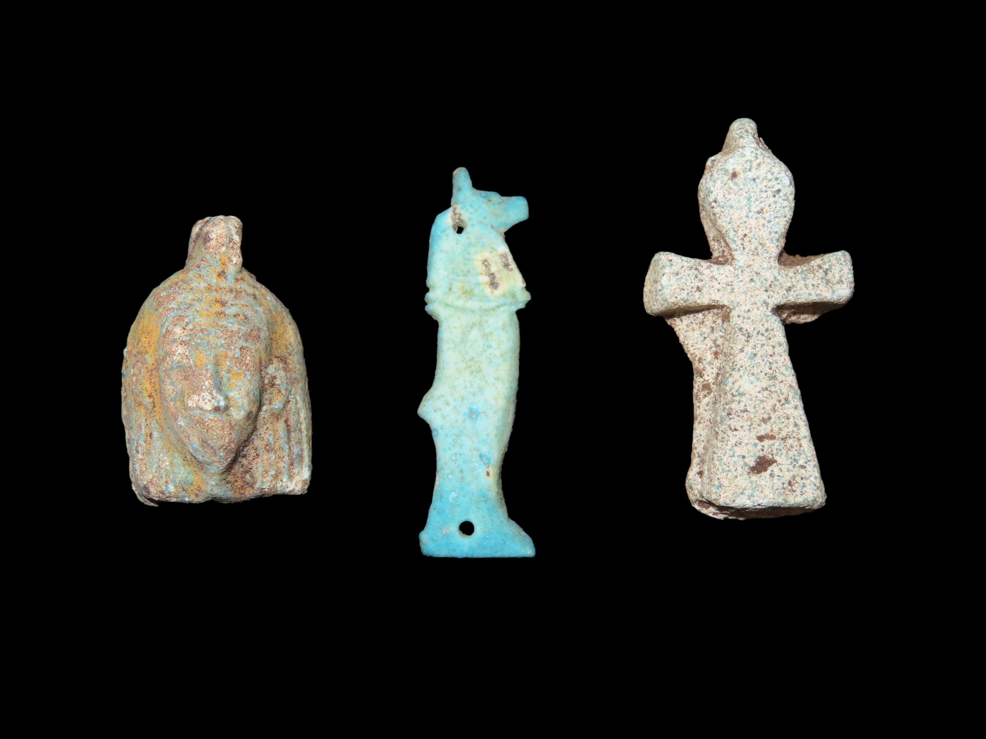 Lot of 3 Egyptian Amulets / Ushabti, 664-332 BC, Faience, Includes Son of Horus, Duamutef, Nice Examples with Great Patina