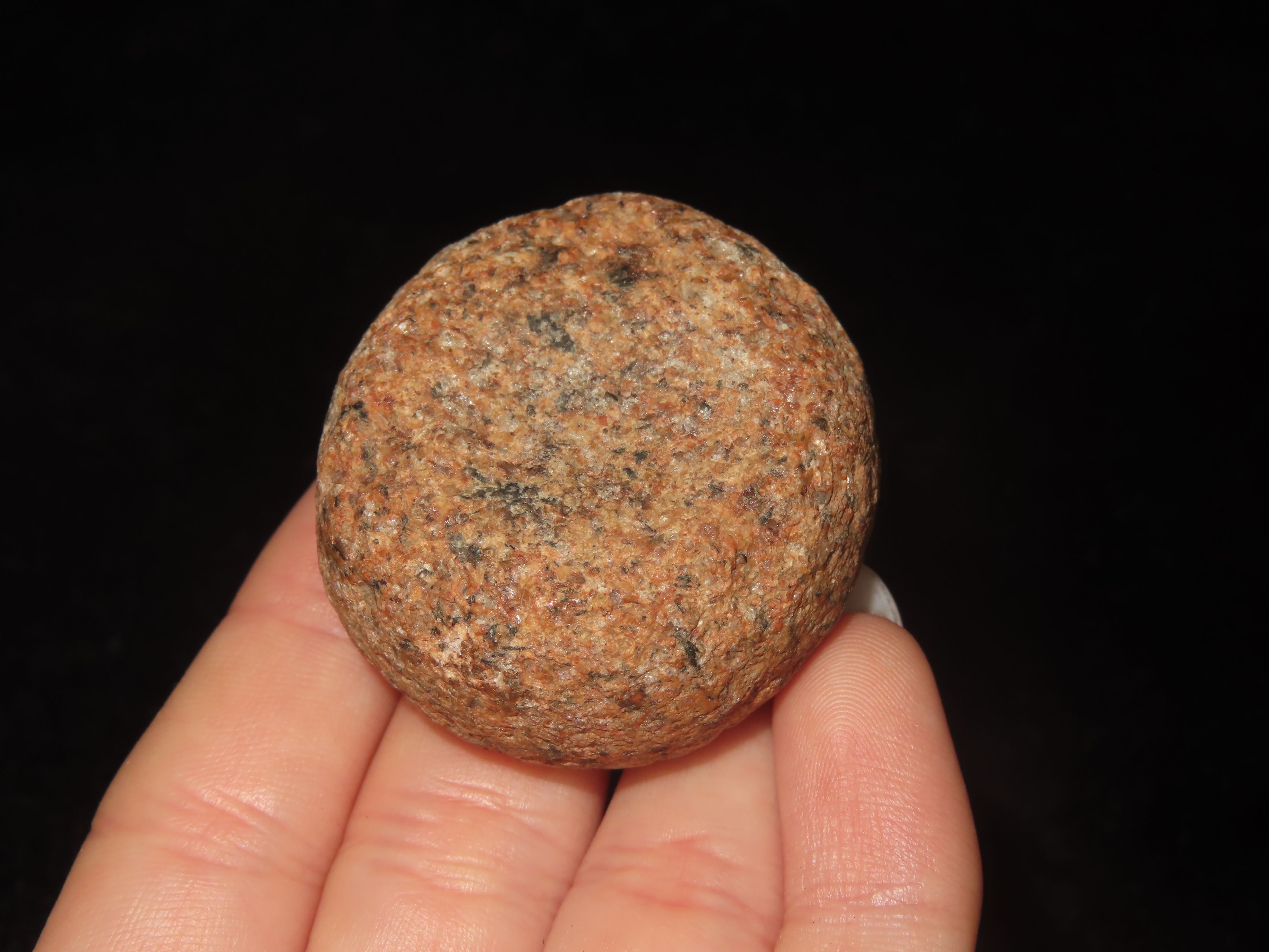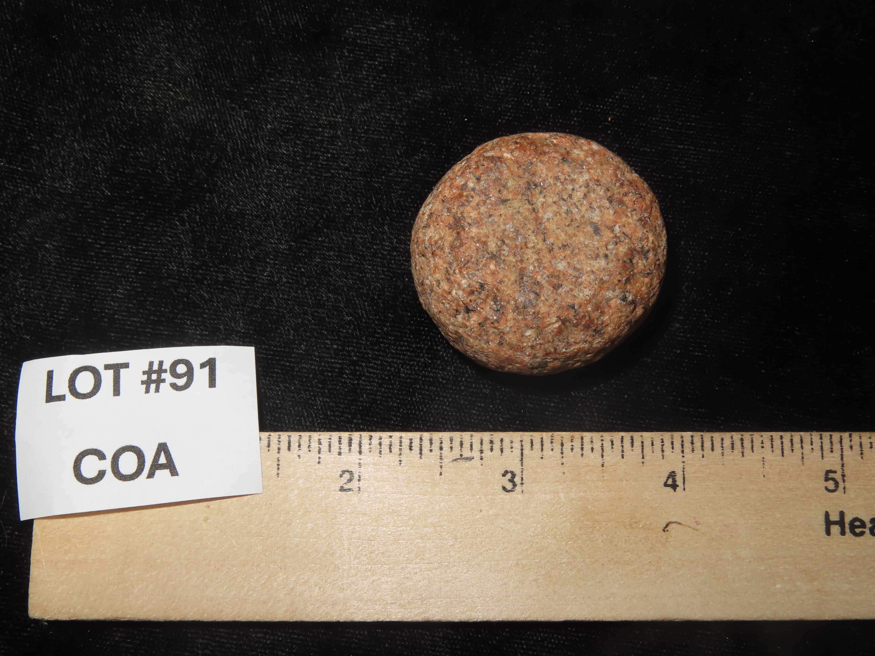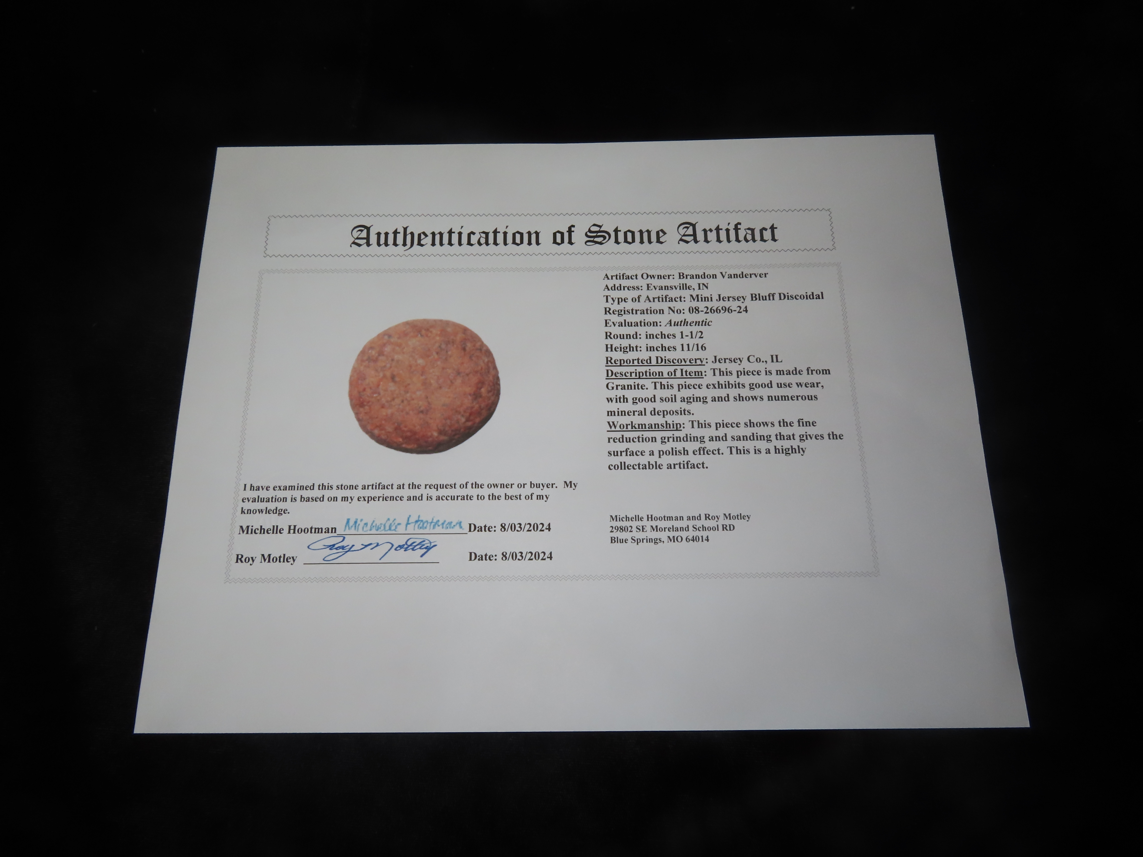 Miniature 1 1/2″ Jersey Bluff Discoidal, Jersey Co. Illinois, Motely COA. Beautiful Pink & Red Granite, Cupped on Both Sides with Nice Polish.
