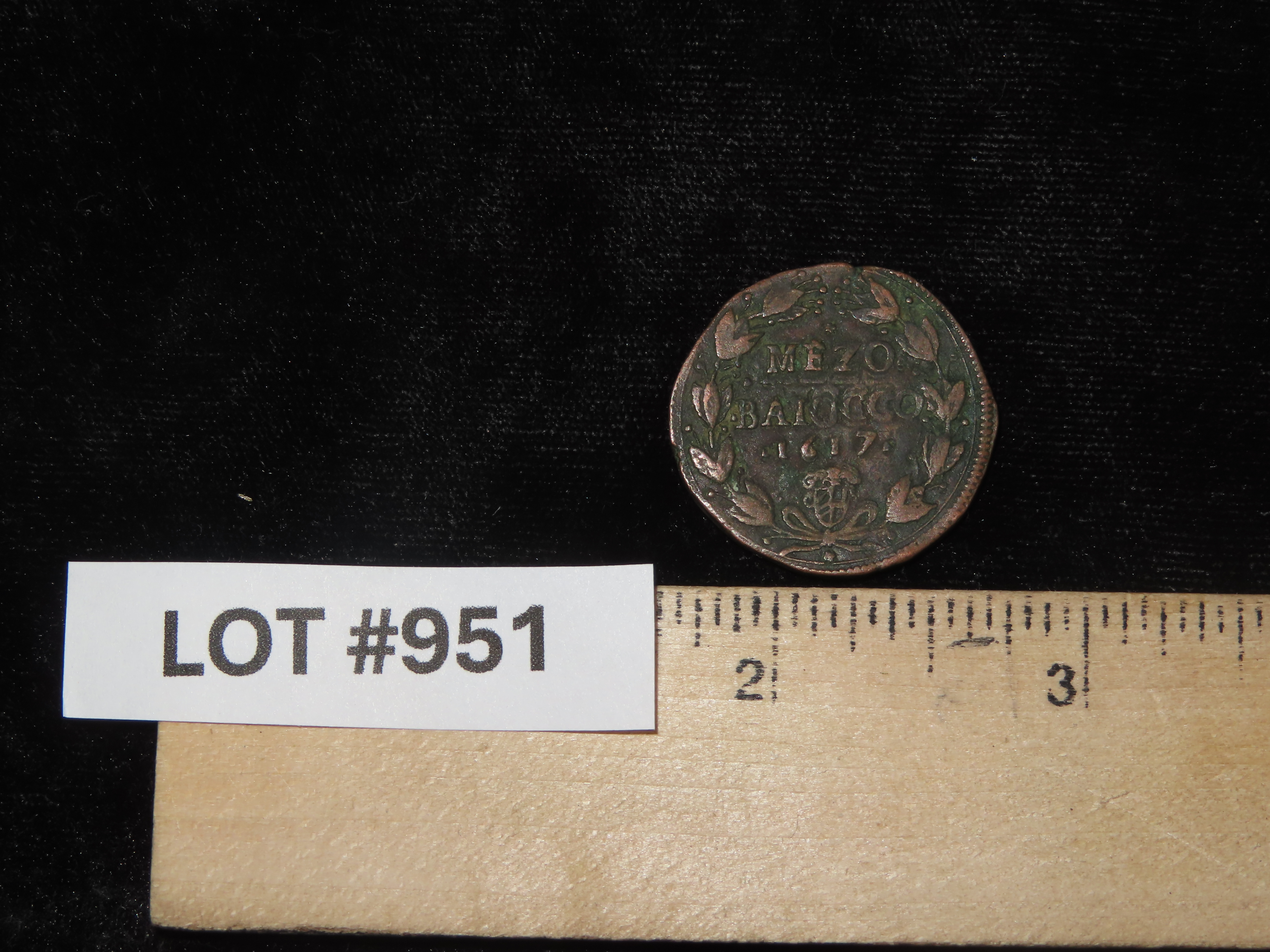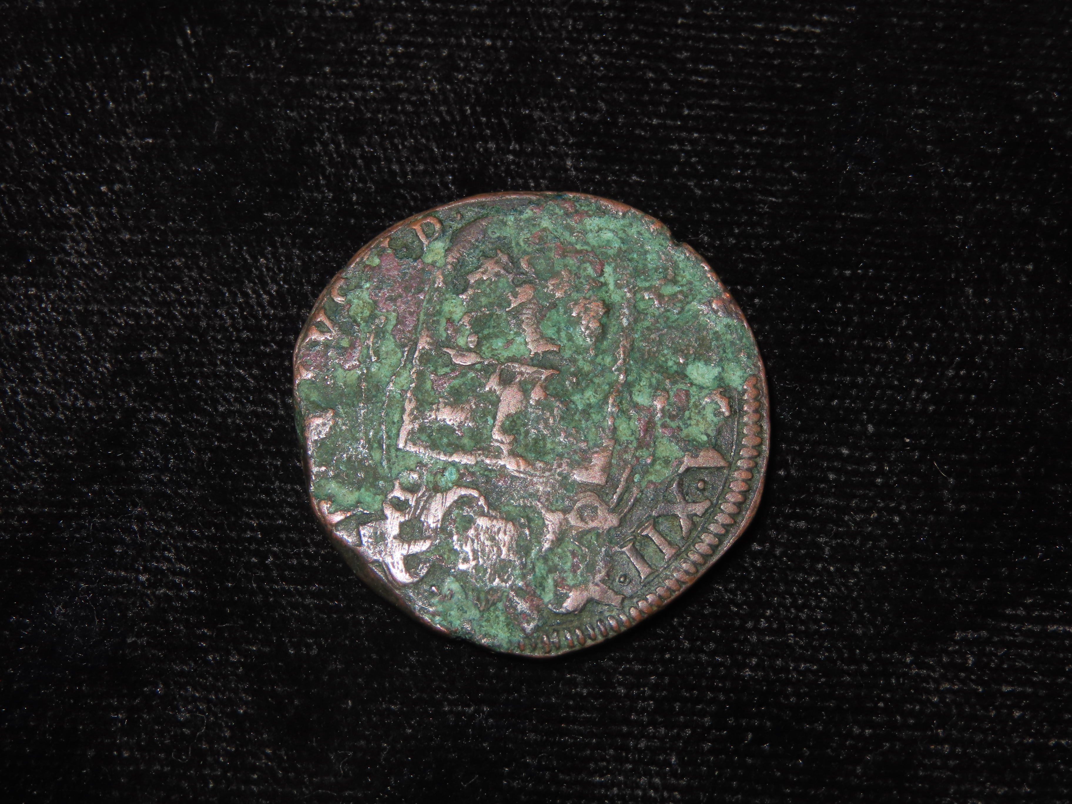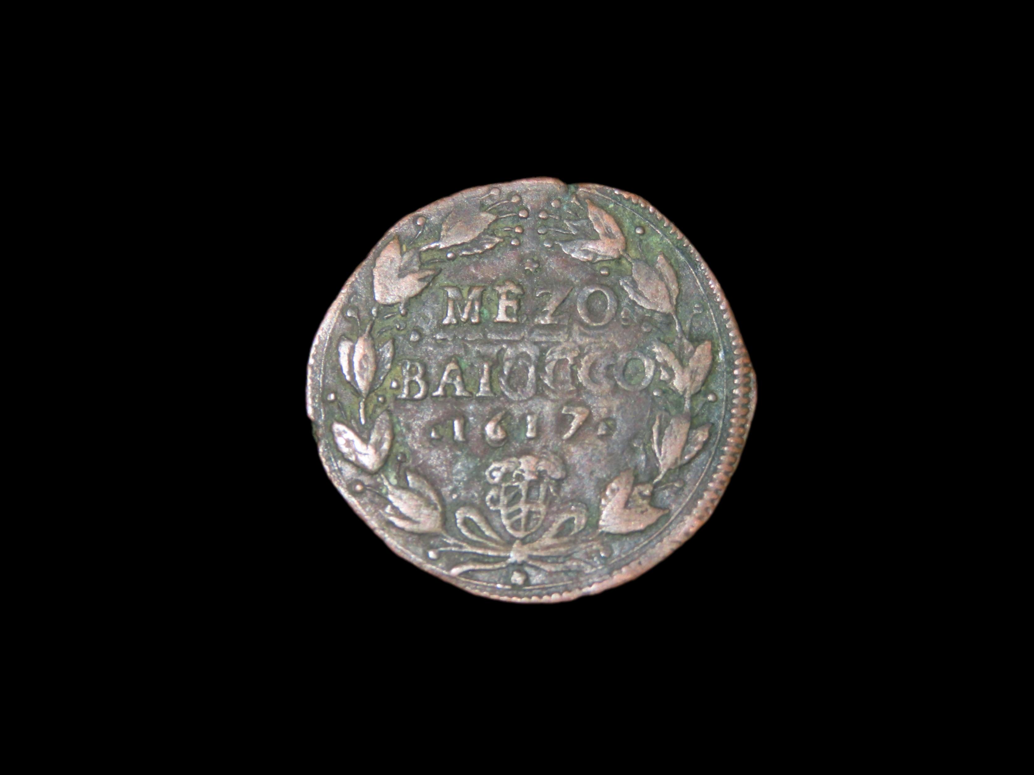 A Mezzo Baiocco coin from 1617- a copper coin issued by the Papal States during the reign of Pope Paul V.