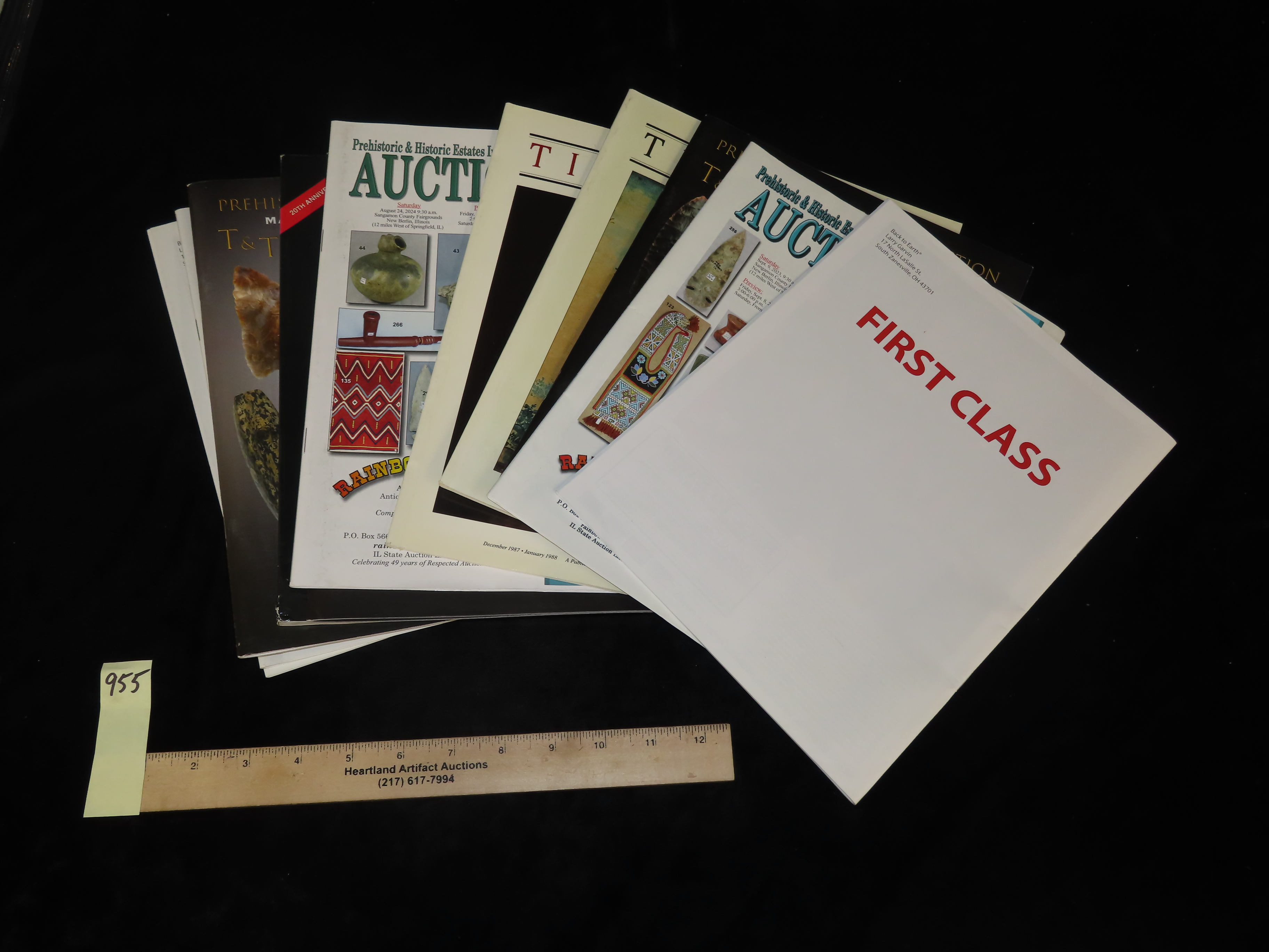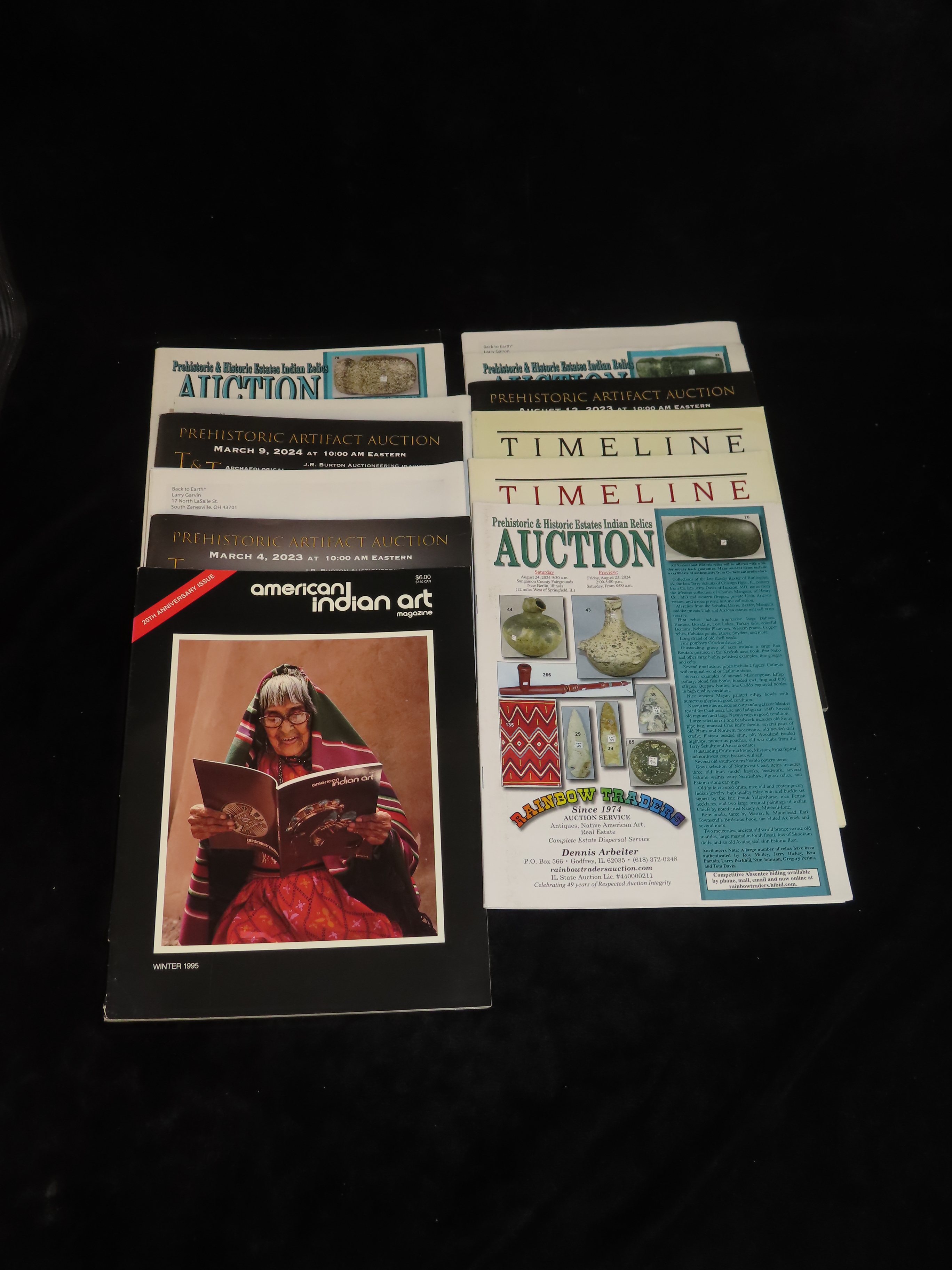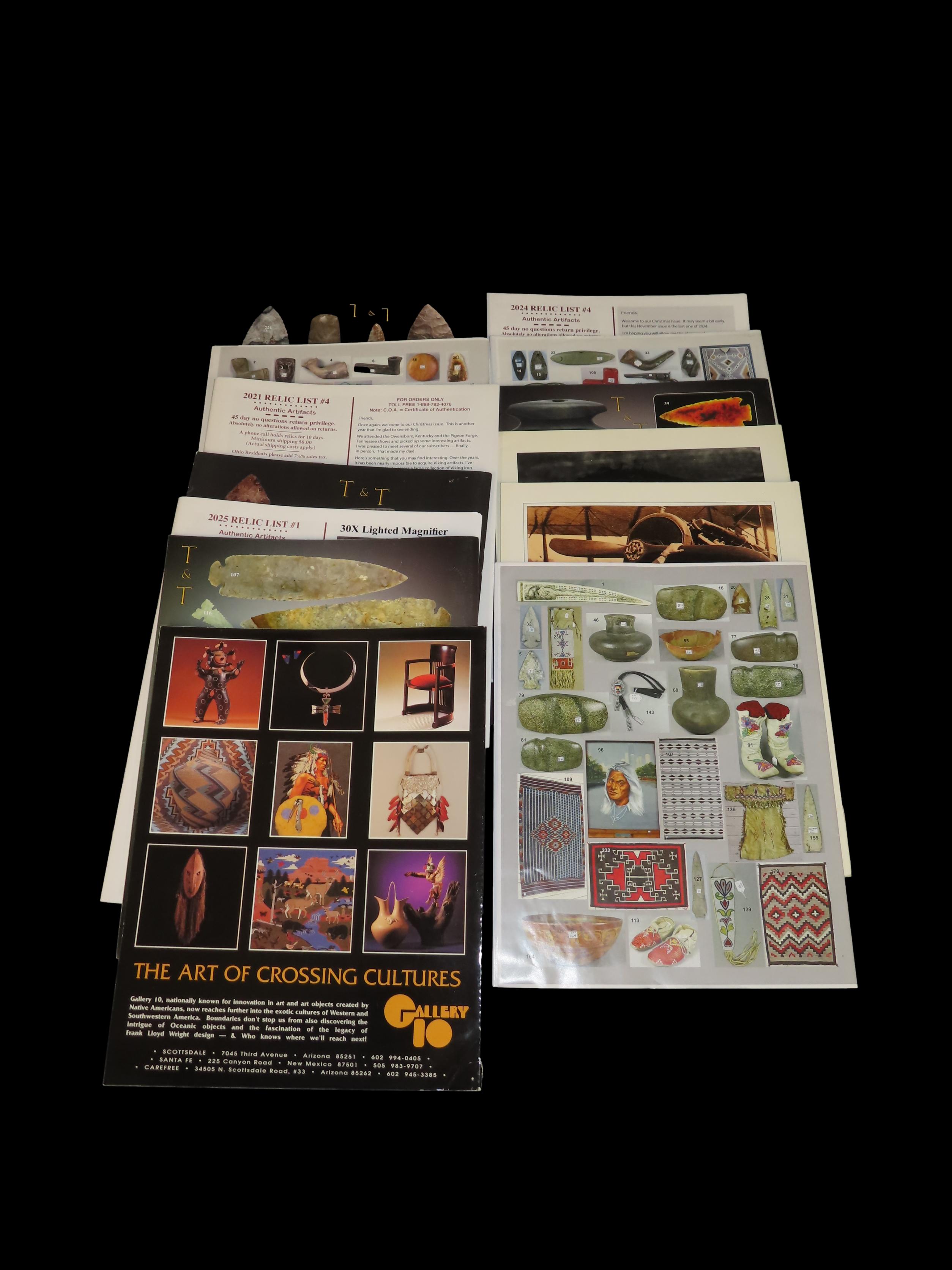 LOT OF 13 OLD AUCTION CATALOGS, BANNERSTONES, BIRDSTONES, CLOVIS, DOVETAIL, FOLSOM, LOST LAKE, AXE, DISCOIDAL, PIPE, POTTERY, THEBES, CUMBERLAND, ETC. TONS OF GREAT RELICS