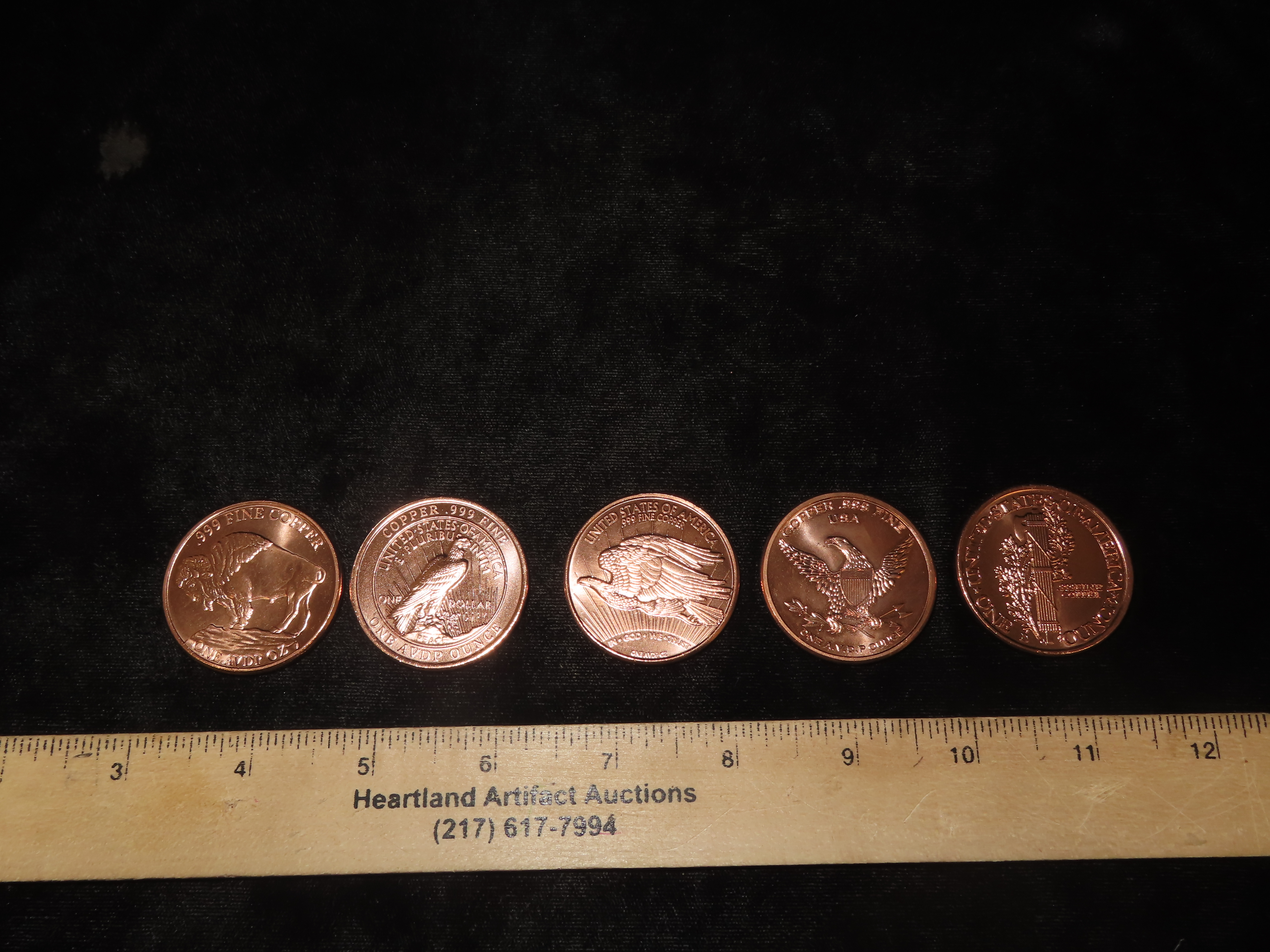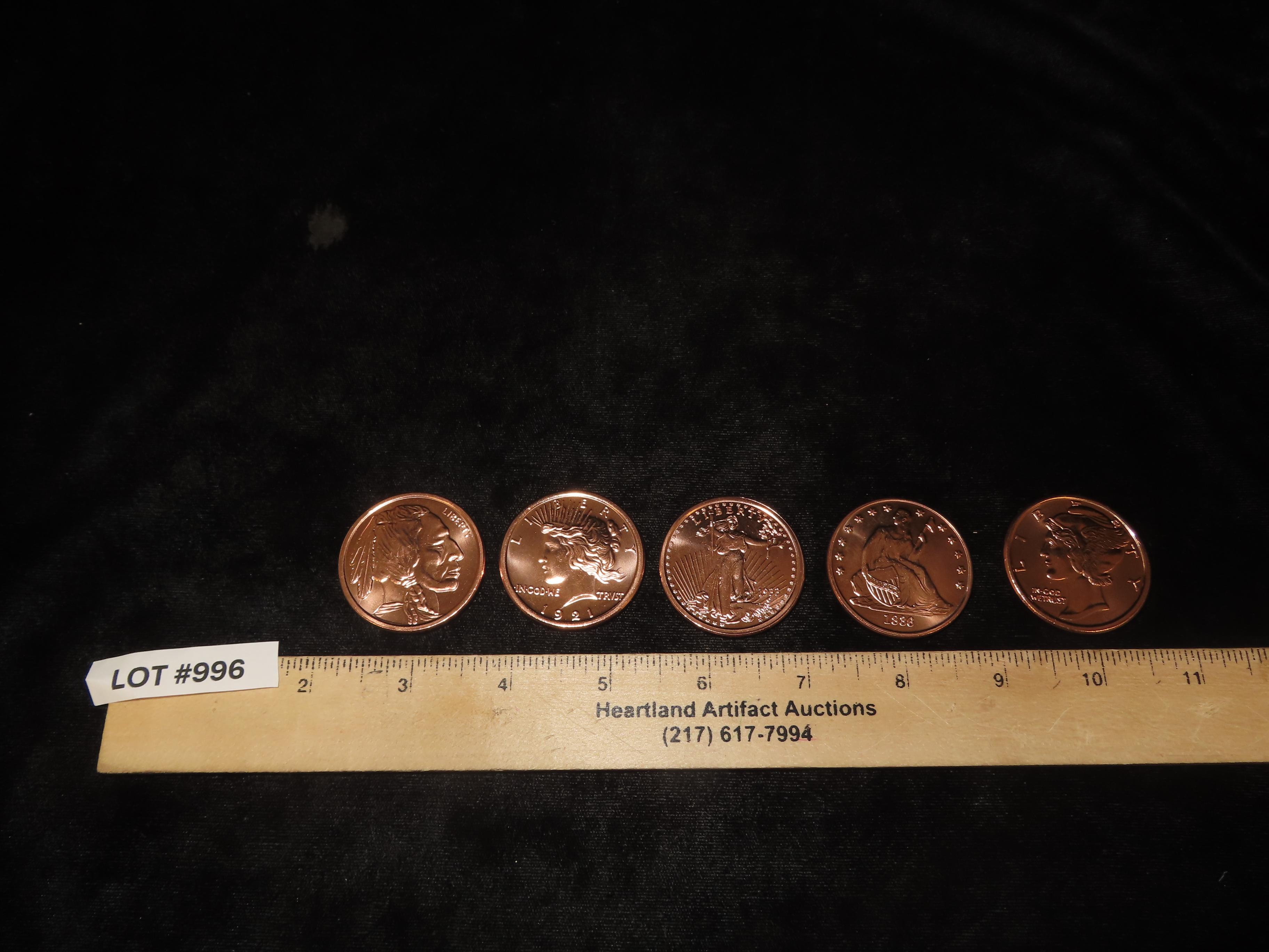 Lot of 5 One Ounce Copper Coins. All Different. Morgan Dollar, Peace Dollar, Mercury Dime, Buffalo Nickel, St Gaudens $20 Gold, Standing Liberty Quarter, Walking Liberty Half Dollar, Seated Liberty Silver Dollar. All Are Solid Copper 1 Ounce Per Coin.