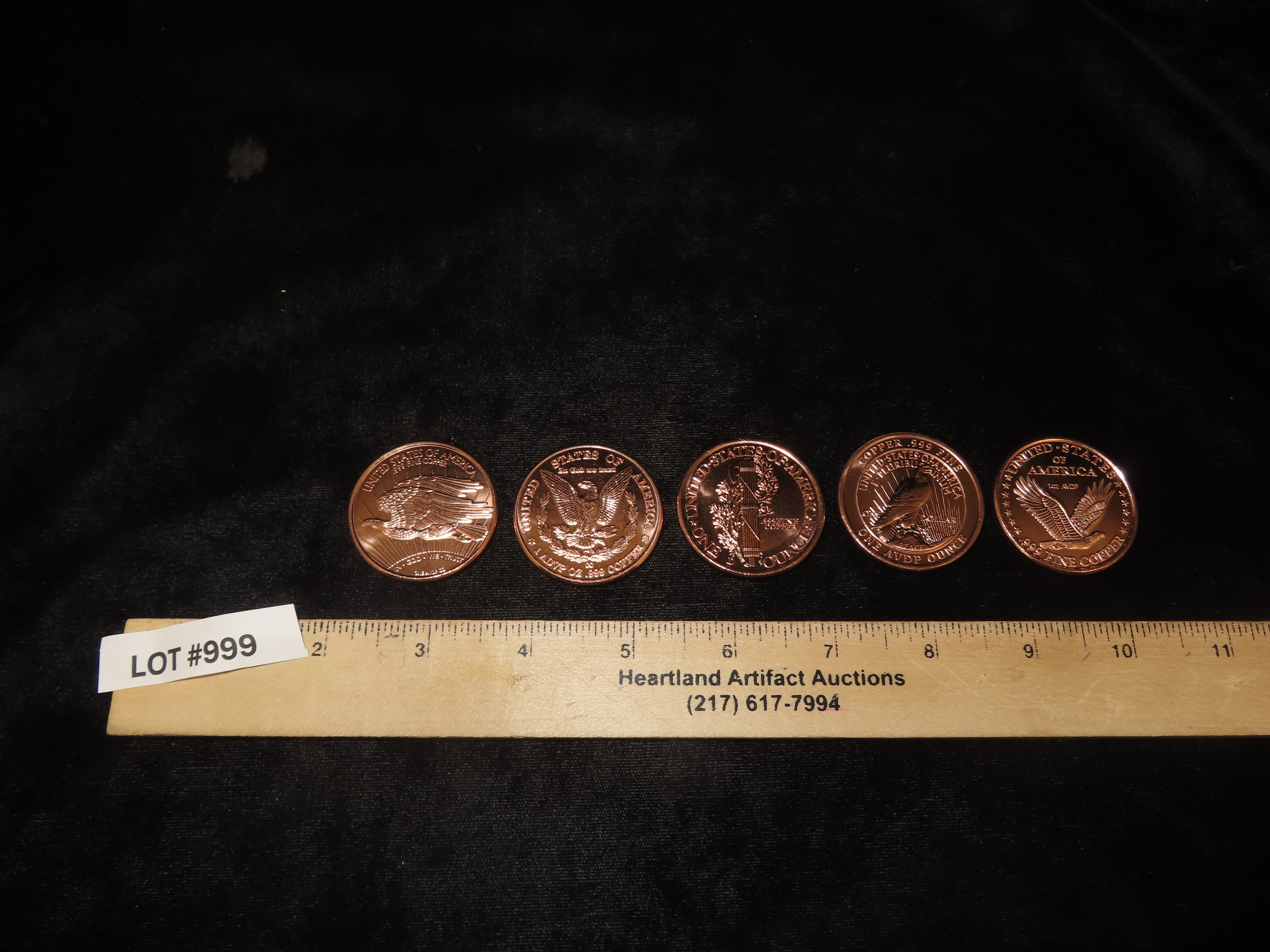 Lot of 5 One Ounce Copper Coins. All Different. Morgan Dollar, Peace Dollar, Mercury Dime, Buffalo Nickel, St Gaudens $20 Gold, Standing Liberty Quarter, Walking Liberty Half Dollar, Seated Liberty Silver Dollar. All Are Solid Copper 1 Ounce Per Coin.