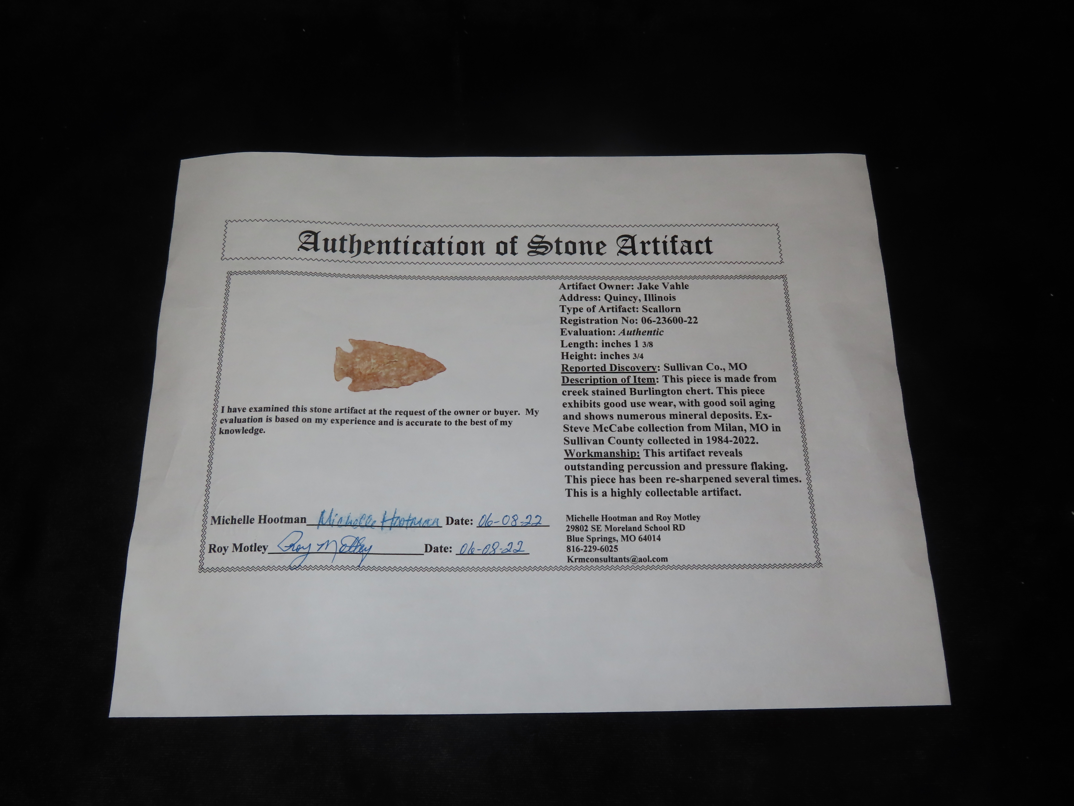 1 3/8” Scallorn,Motley COA,Found In Sullivan Co., Missouri,Ex Steve McCabe Collection