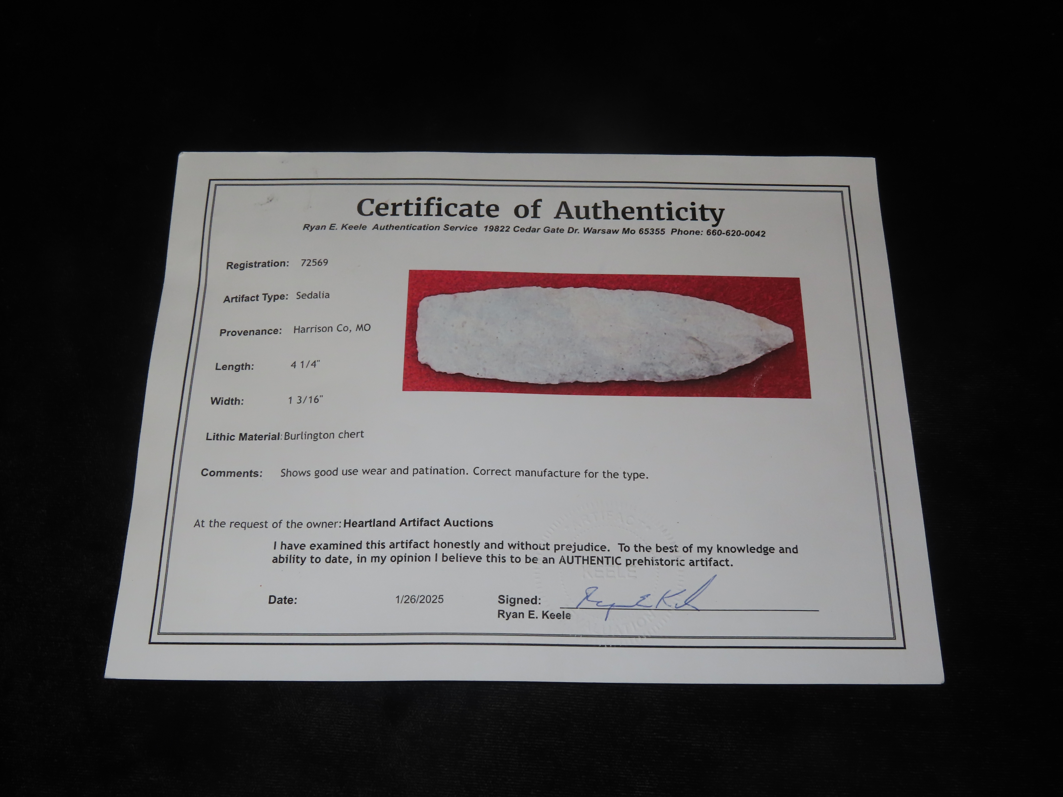 4 1/4” Sedalia,Keele COA,Found In Harrison Co,Missouri