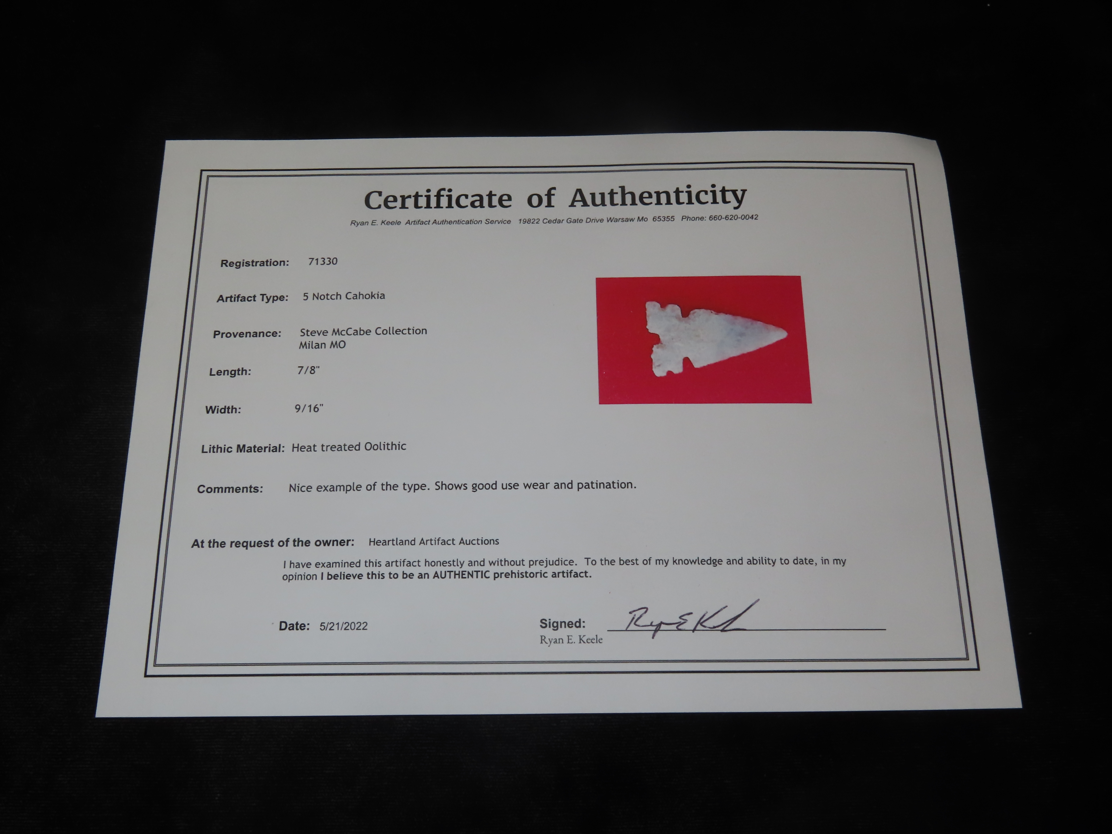 7/8” 5 Notch Cahokia, Ryan E.Keele COA,Found In Sullivan Co., Missouri, Ex Steve McCabe Collection