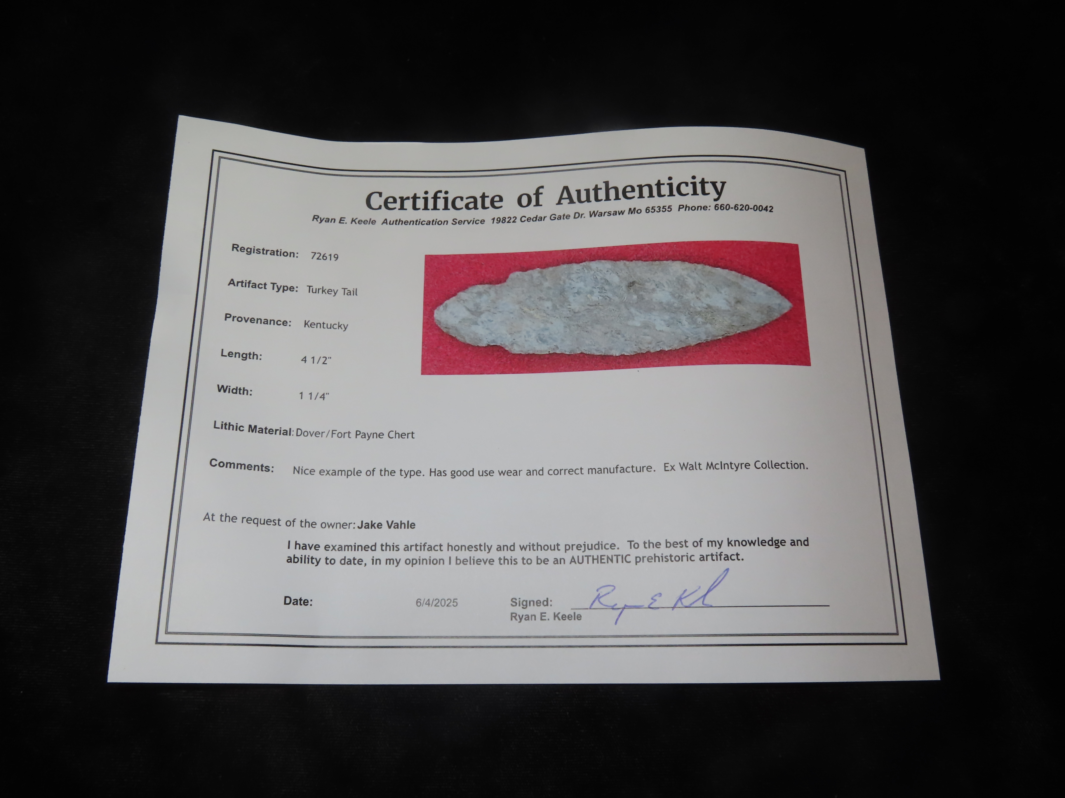 4 1/2” Turkey Tail, Keele COA,Found In Kentucky,Ex Walt Mclntire