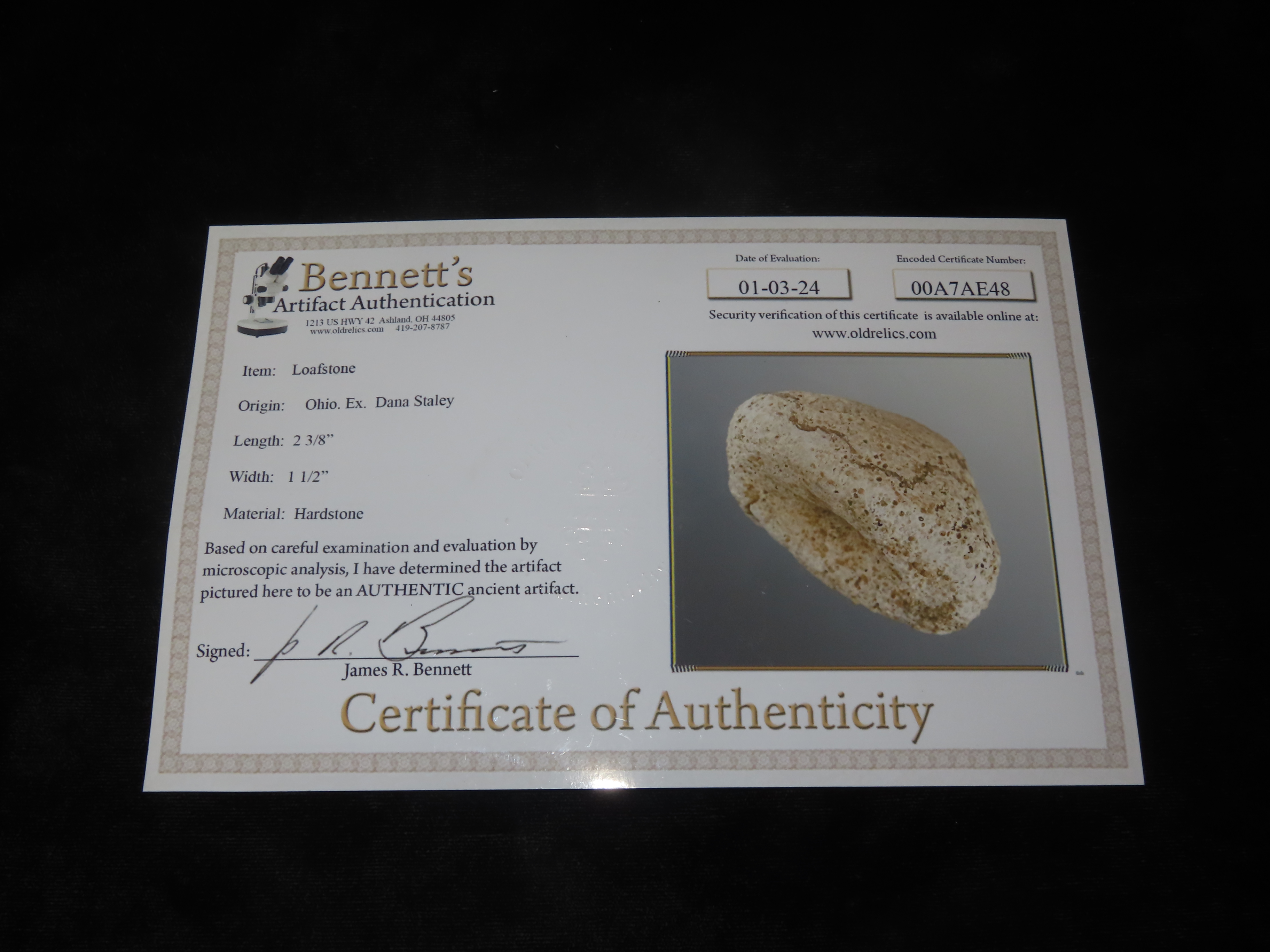 2 3/8” Loafstone, Bennetts COA,Found In Ohio,Ex Dana Staley