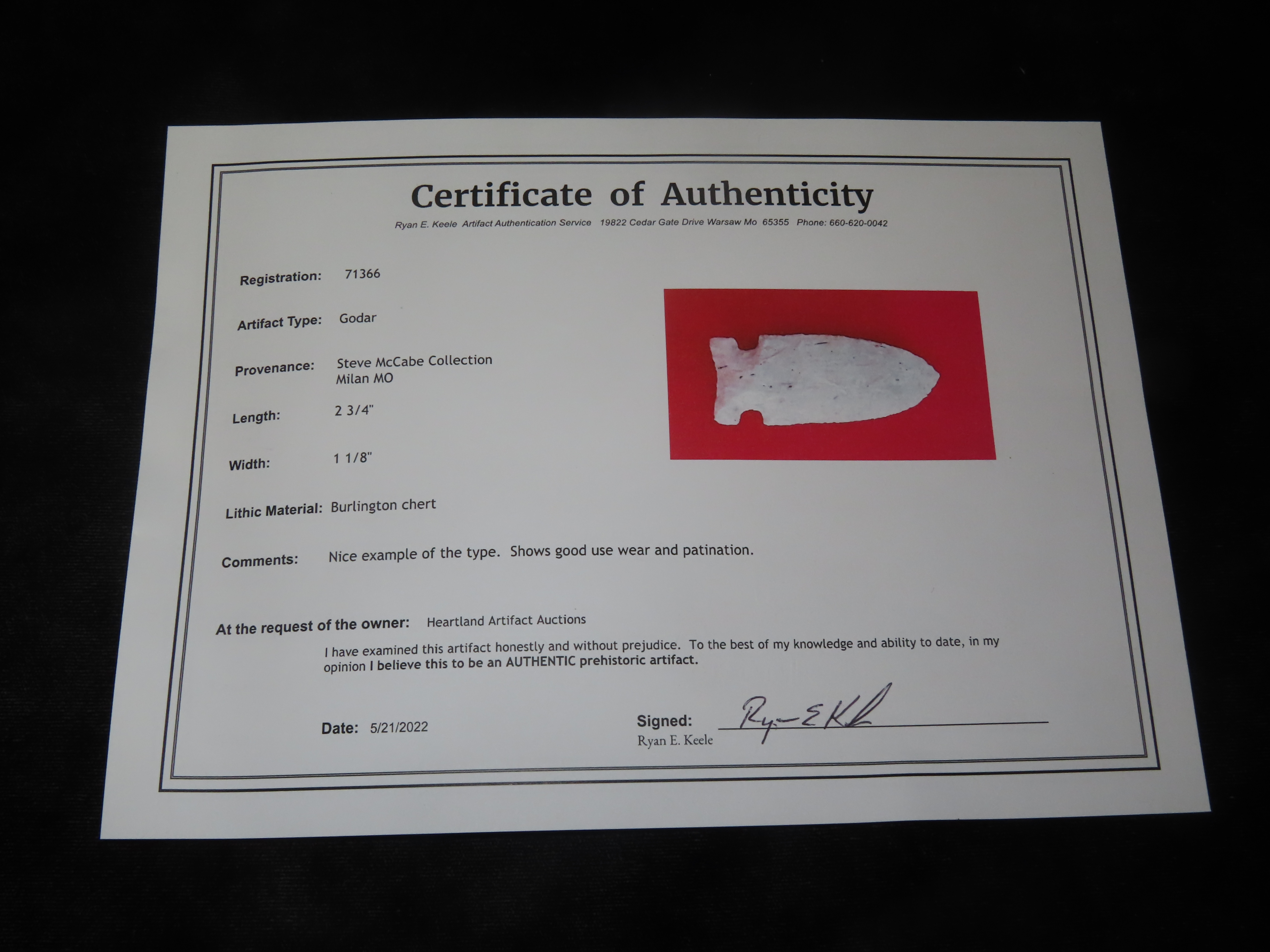 2 3/4” Godar, Keele COA ,Found In Sullivan Co., Missouri,Ex Steve McCabe Collection