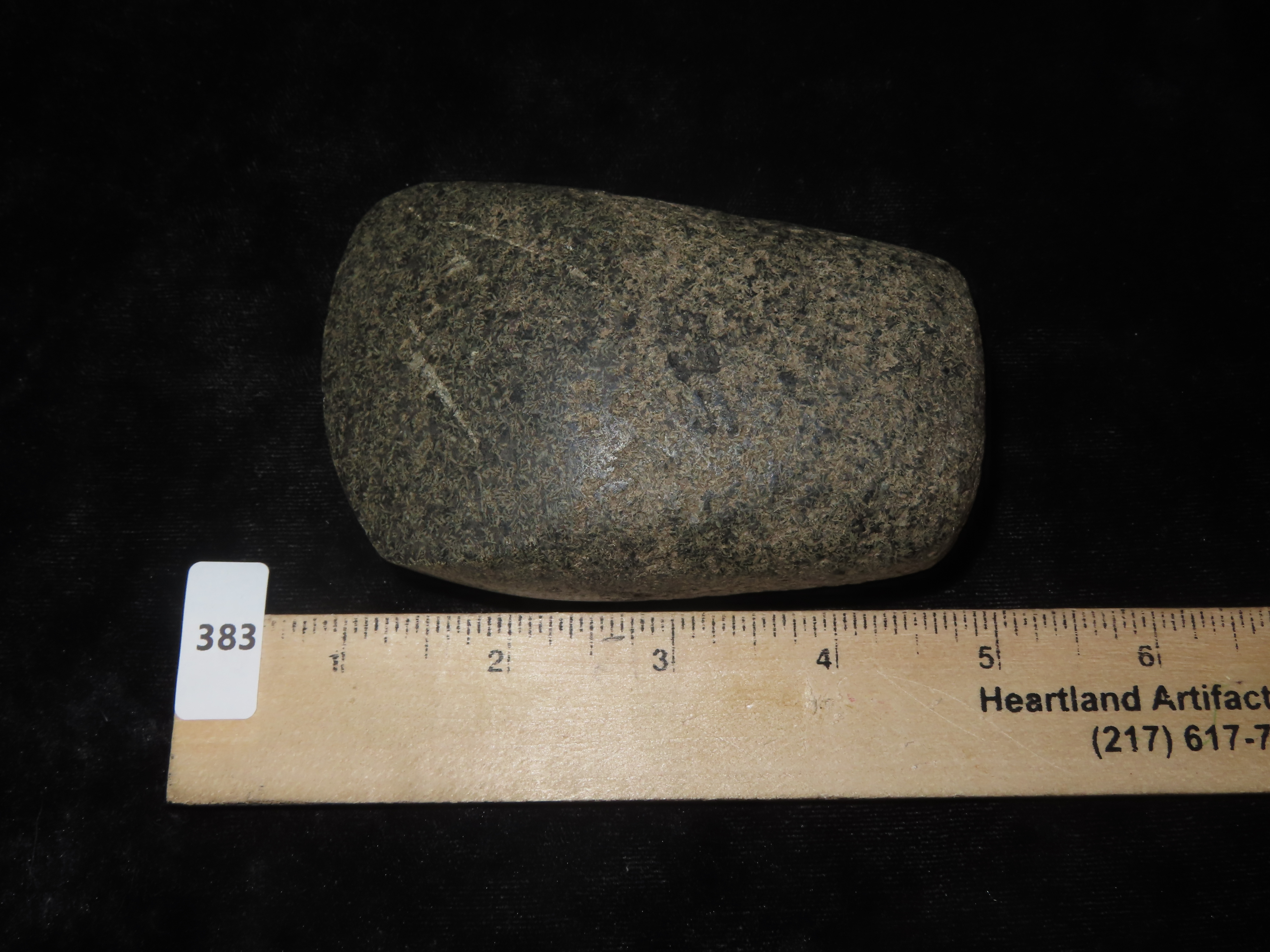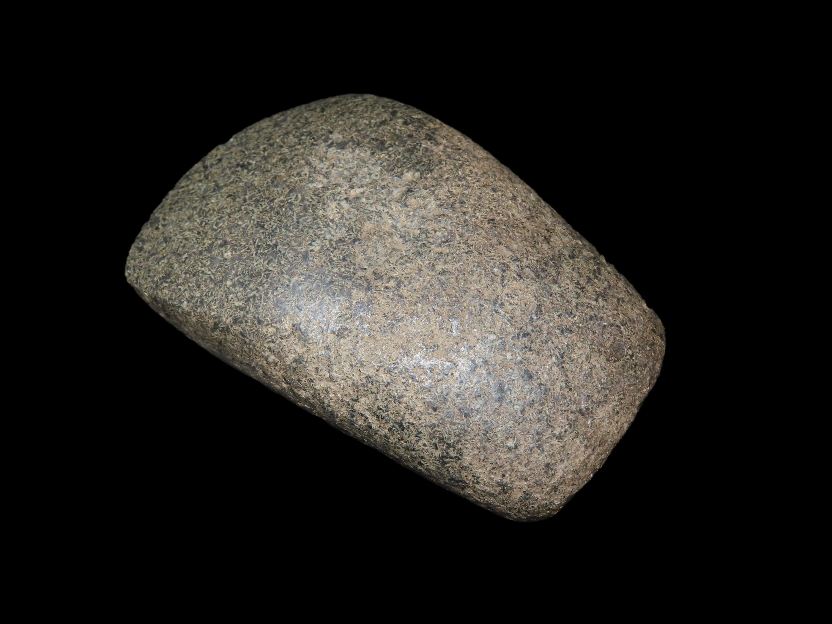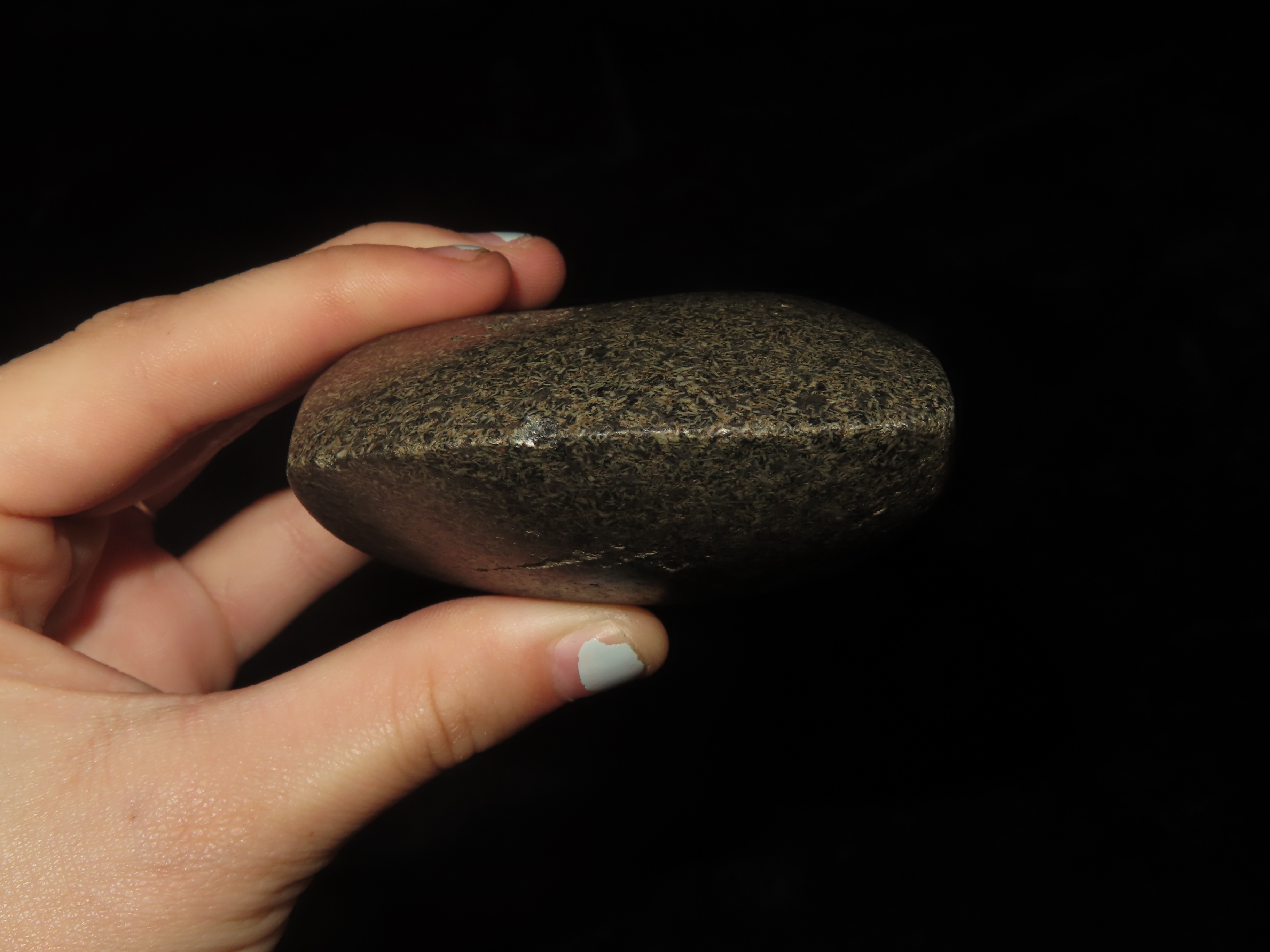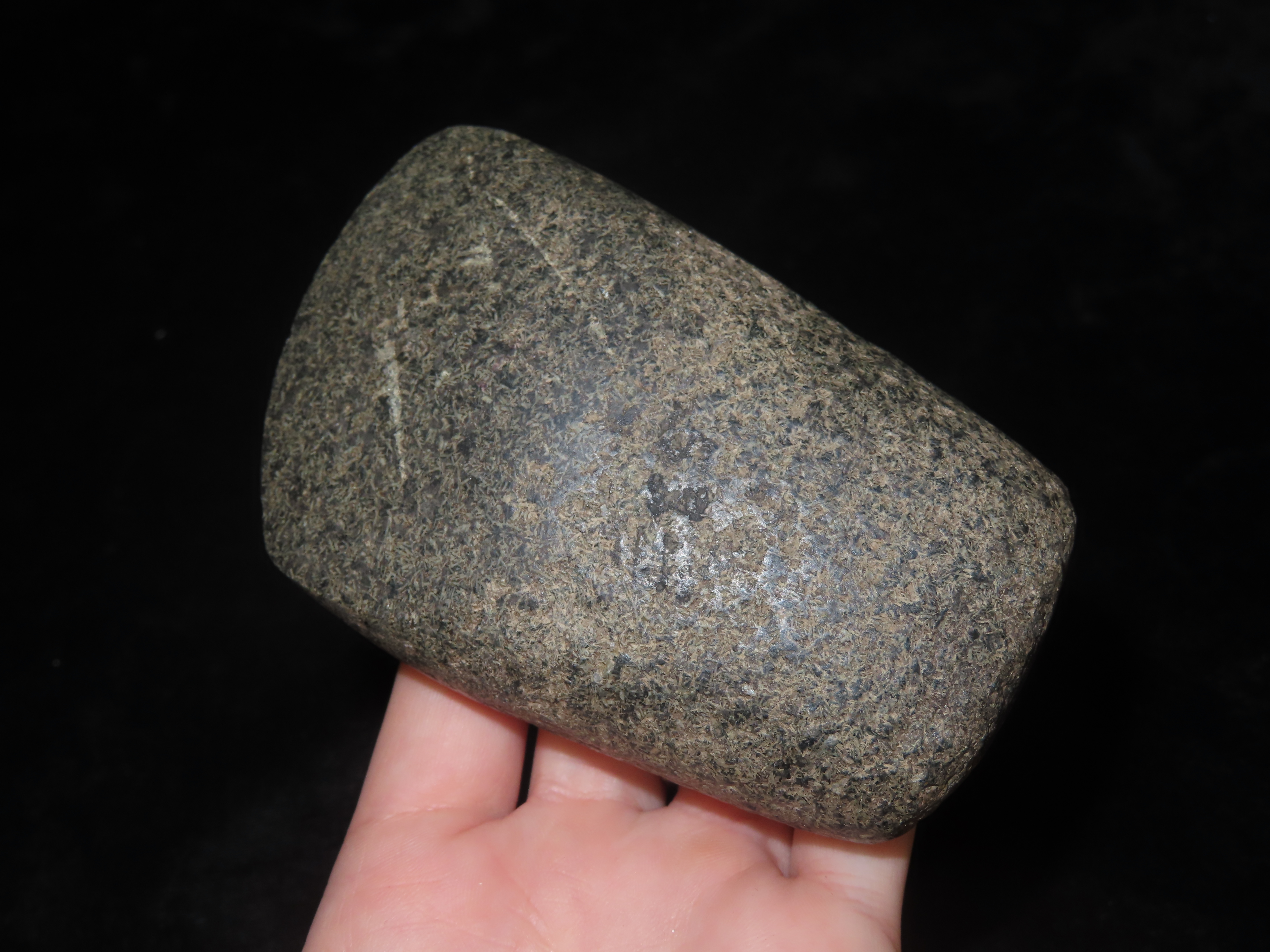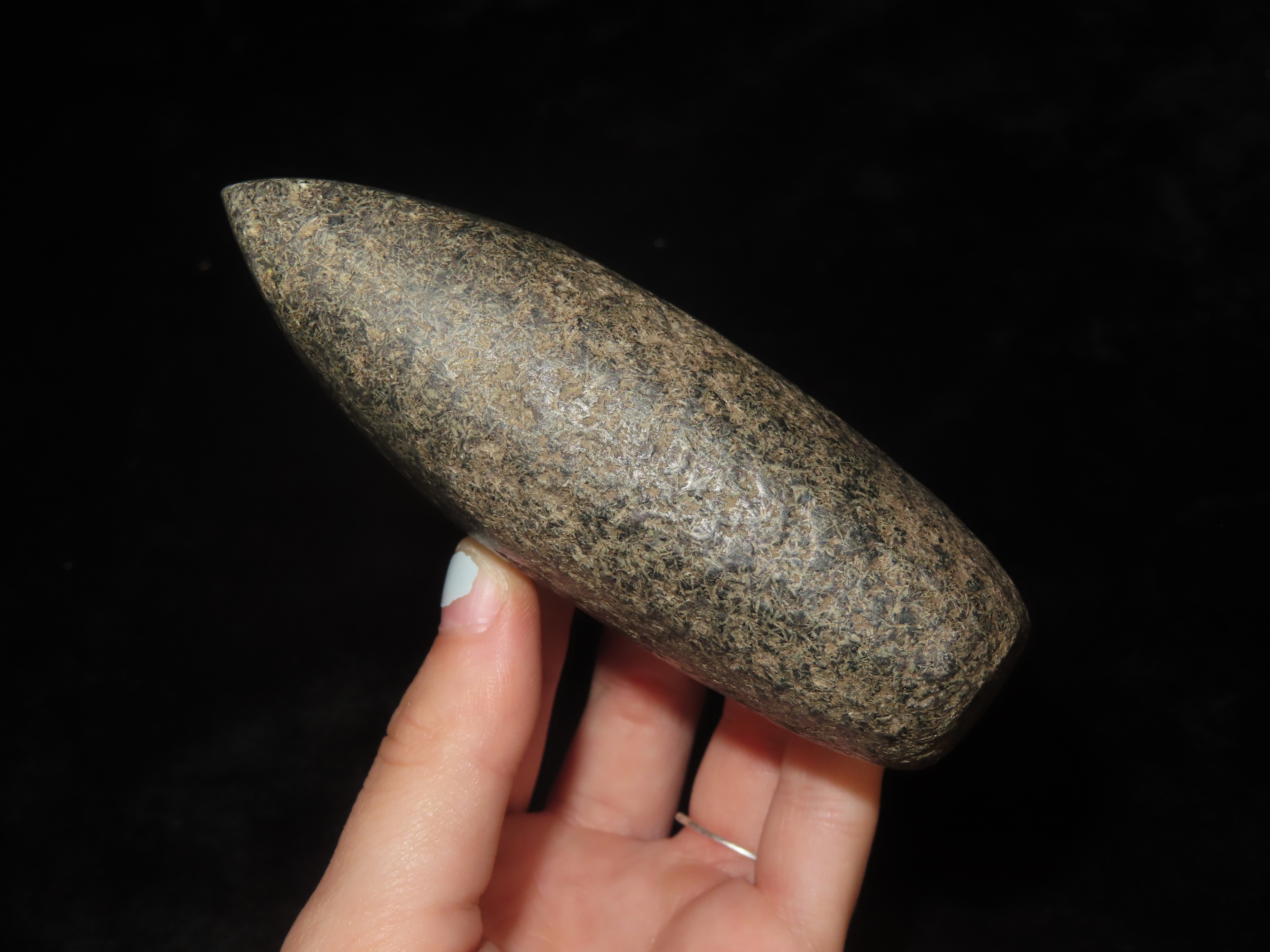 4″ Creased Pole Celt, made from Wiry Granite, Nice hafting and use area, found in Adams Co., Illinois