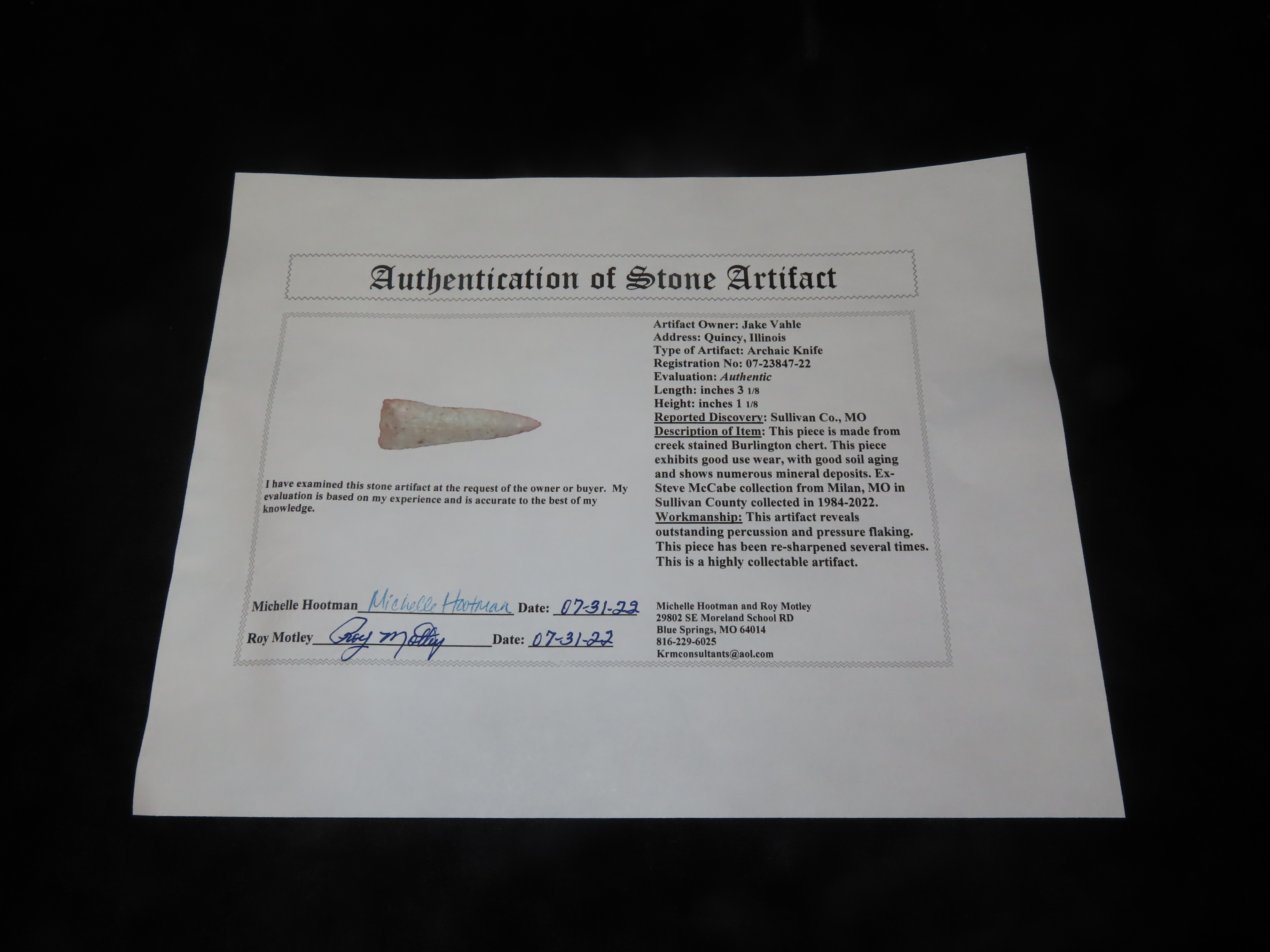 3 1/8'' Archaic Knife,Motley COA,Found In Sullivan Co,Missouri,Ex Steve McCabe Collection