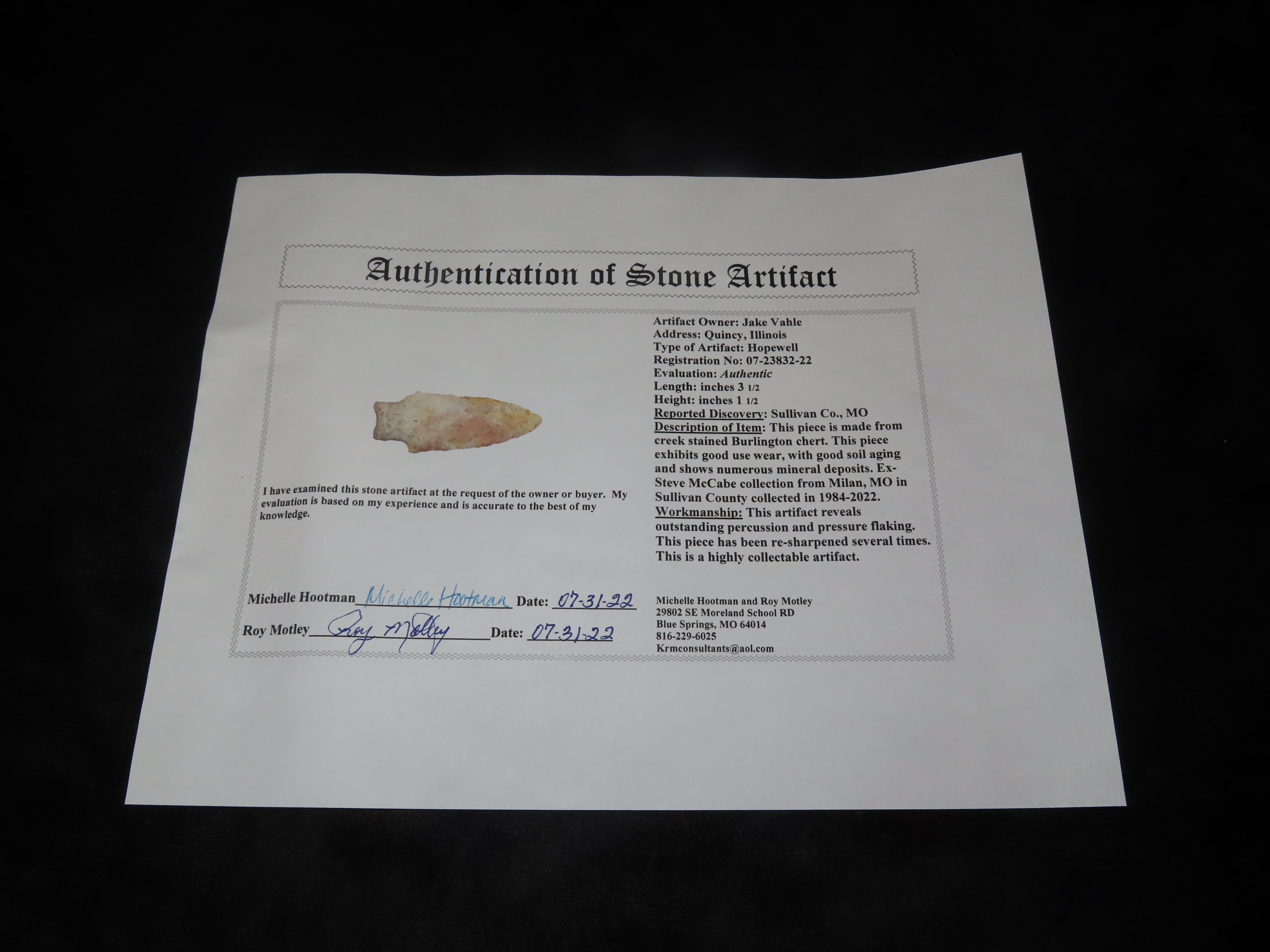 3 1/2” Hopewell,Motley COA,Found In Sullivan Co,Missouri, Ex Steve McCabe Collection