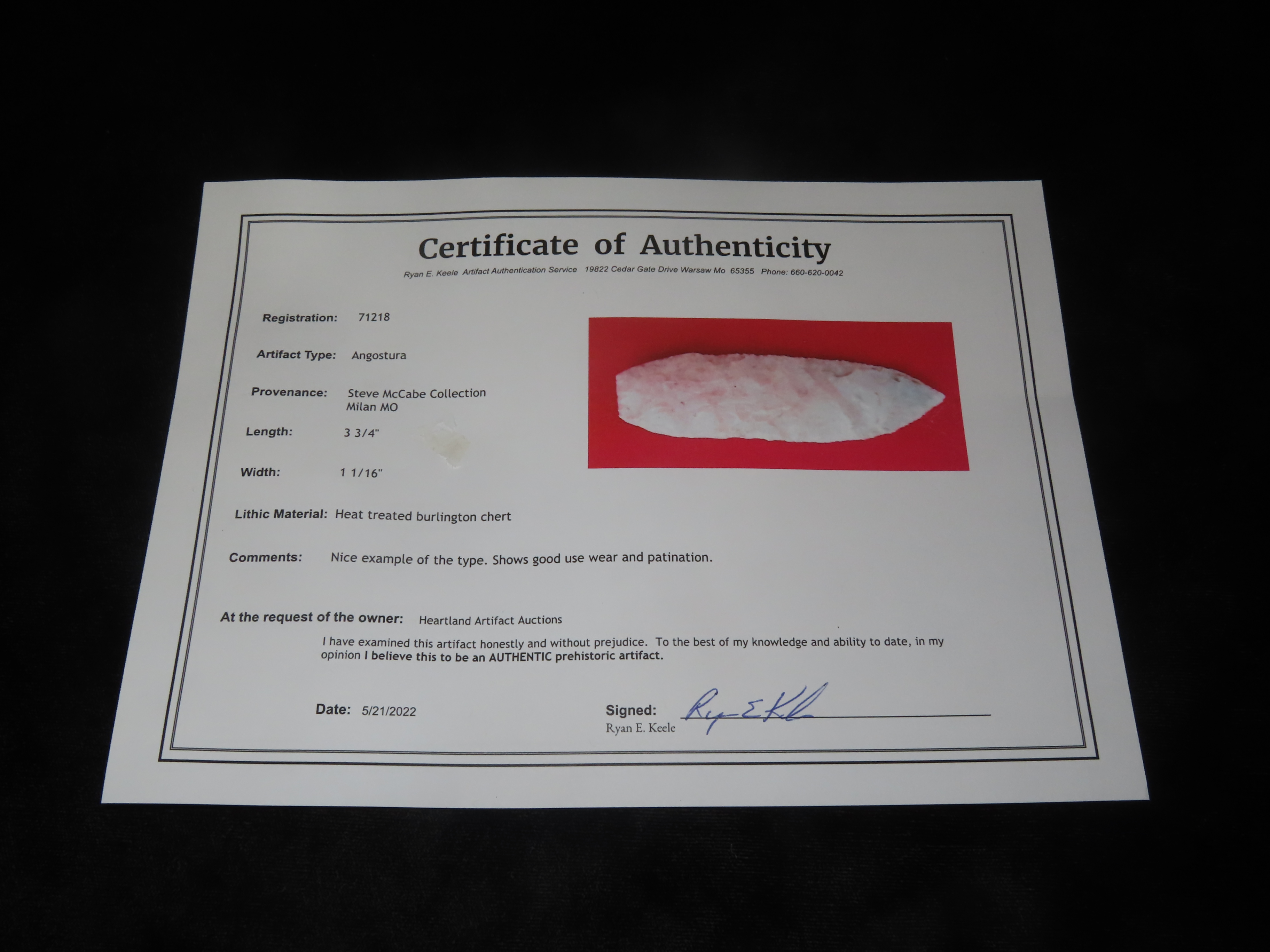 3 3/4” Angostura, Keele COA, Found In Sullivan Co., Missouri, Ex Steve McCabe Collection