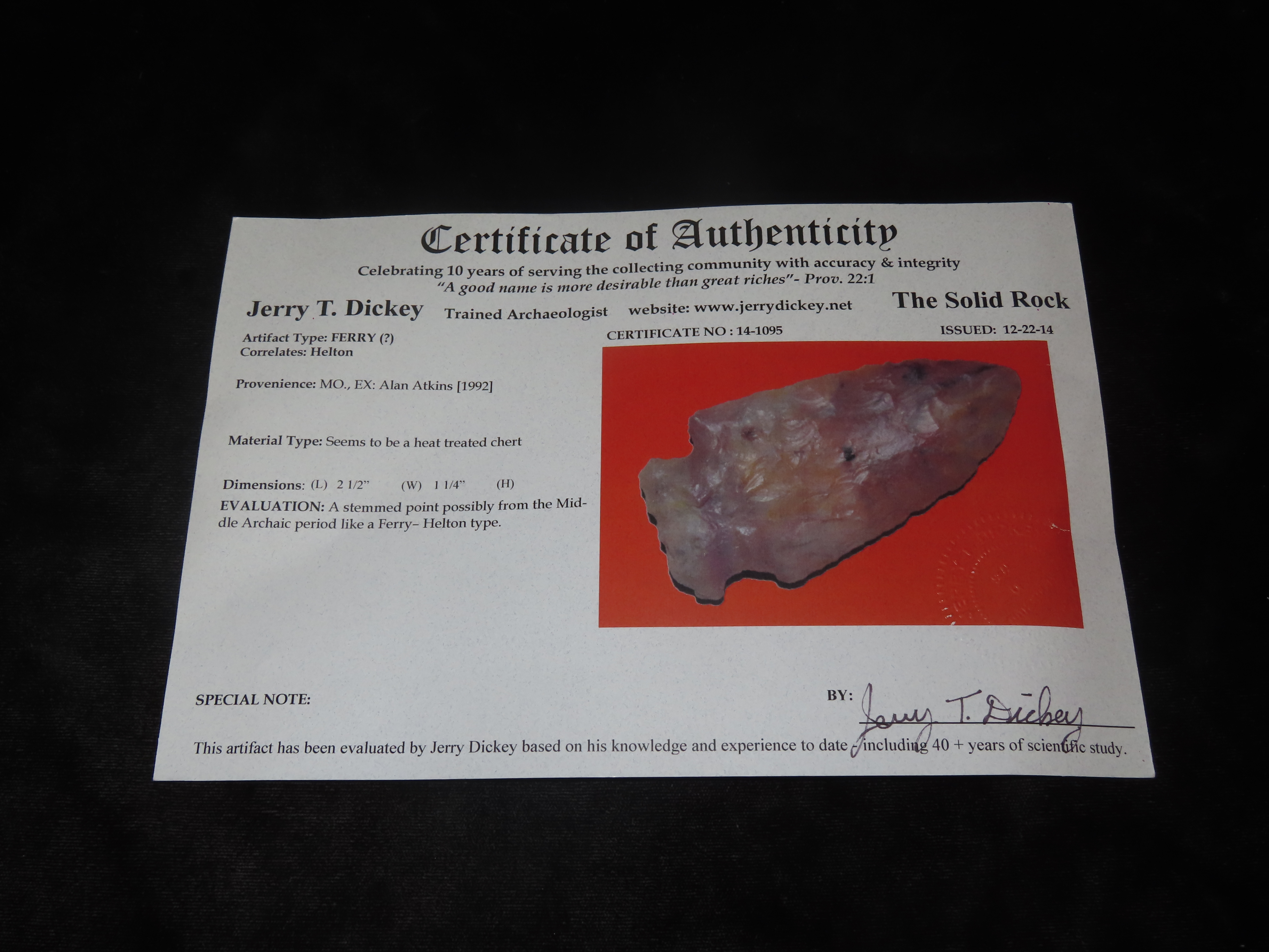 2 1/2” Ferry-Helton,Dickey COA,Found In Missouri,Ex Alan Atkins