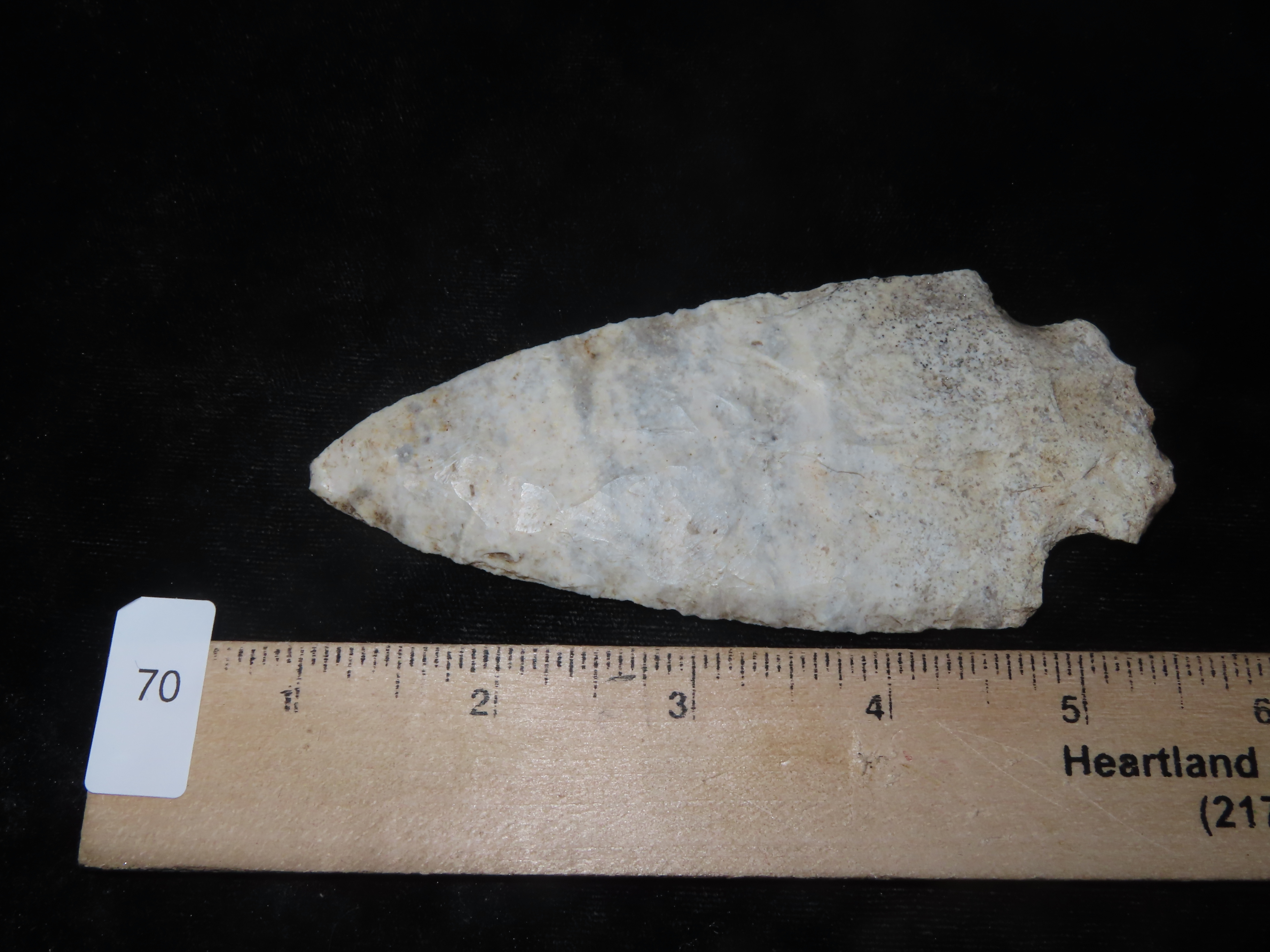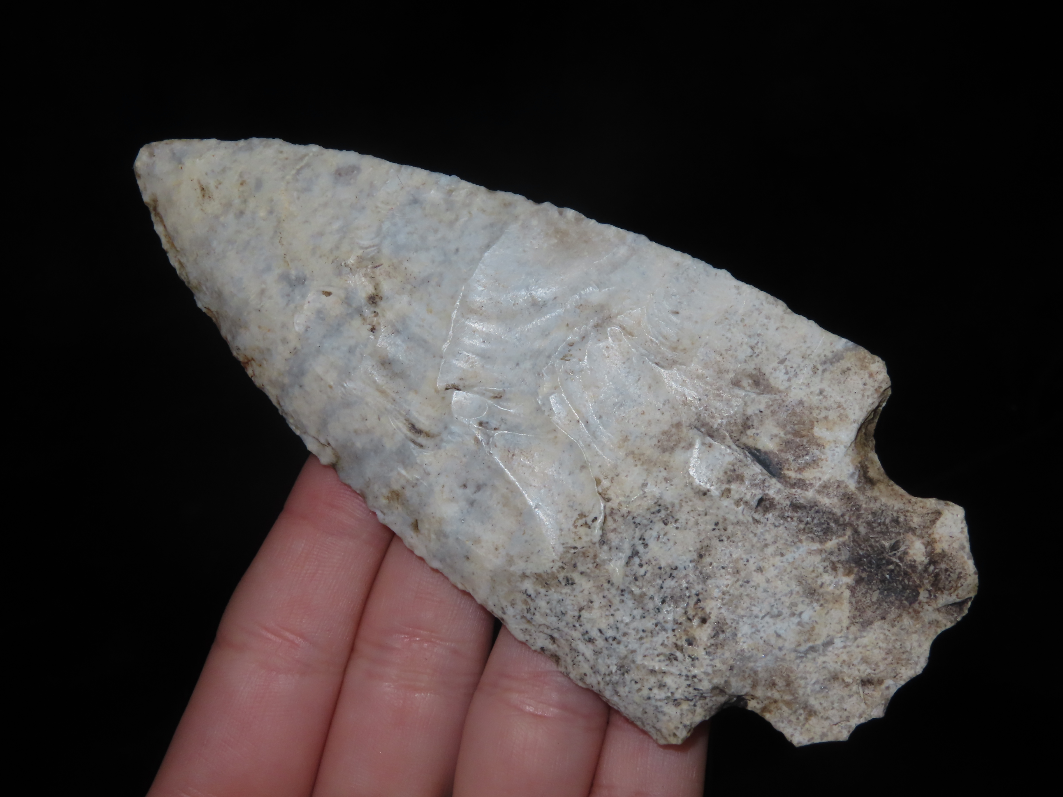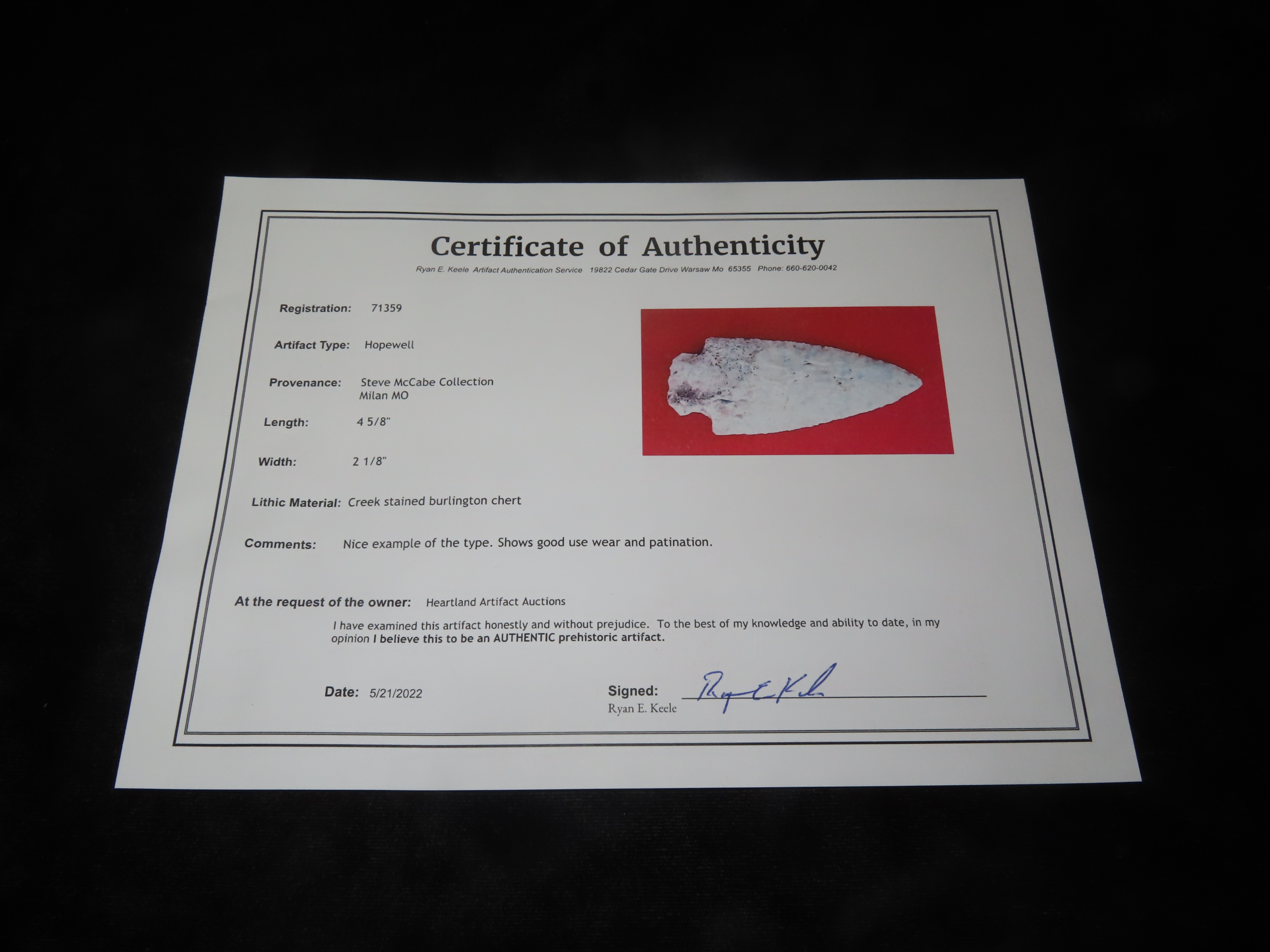 4 5/8″ Hopewell, Keele COA,Creek stained burlington chert, Steve McCabe Collection Sullivan Co., Missouri.