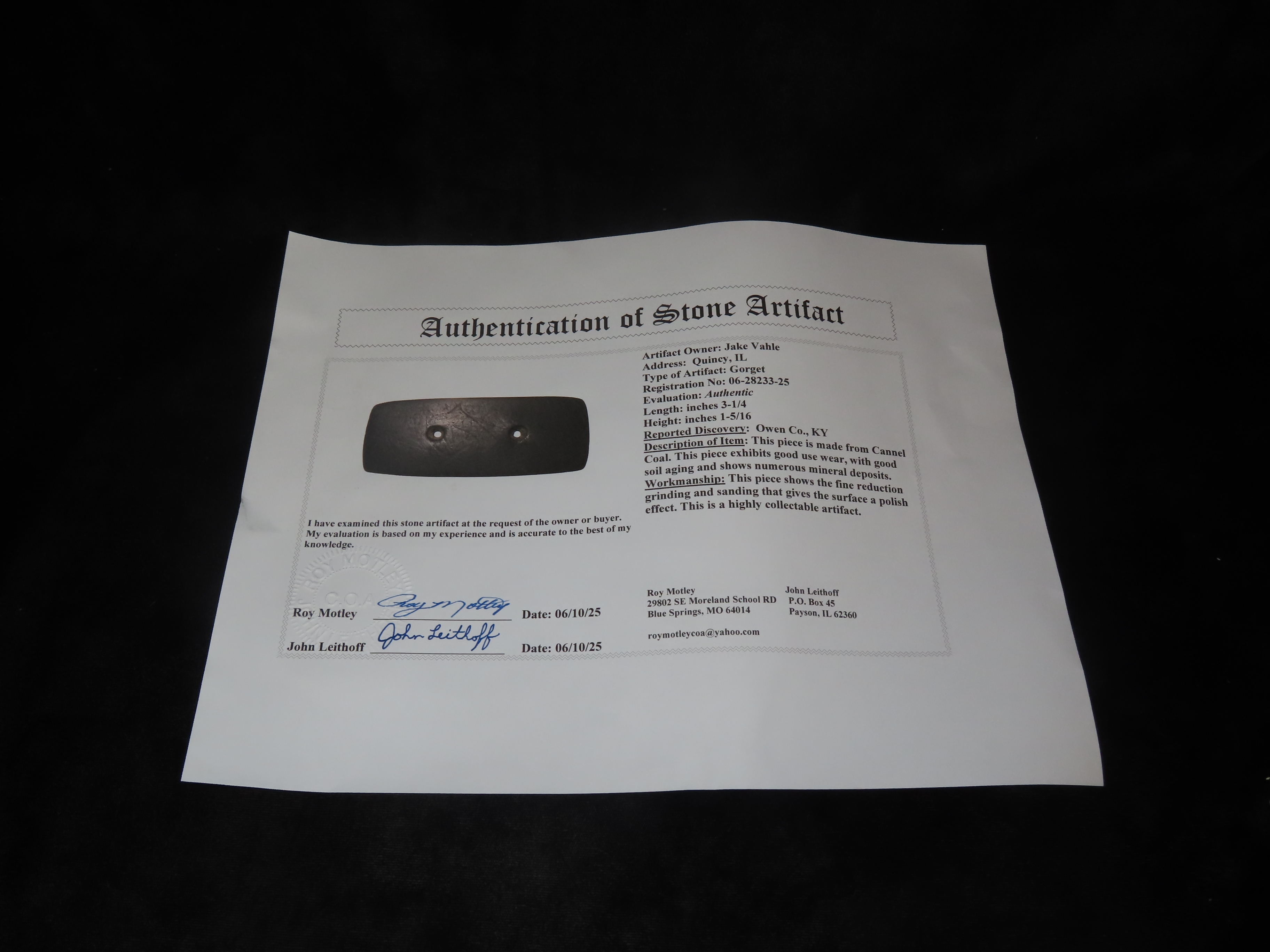 3 1/4” Gorget,Motley COA,Found In Owen Co., Kentucky