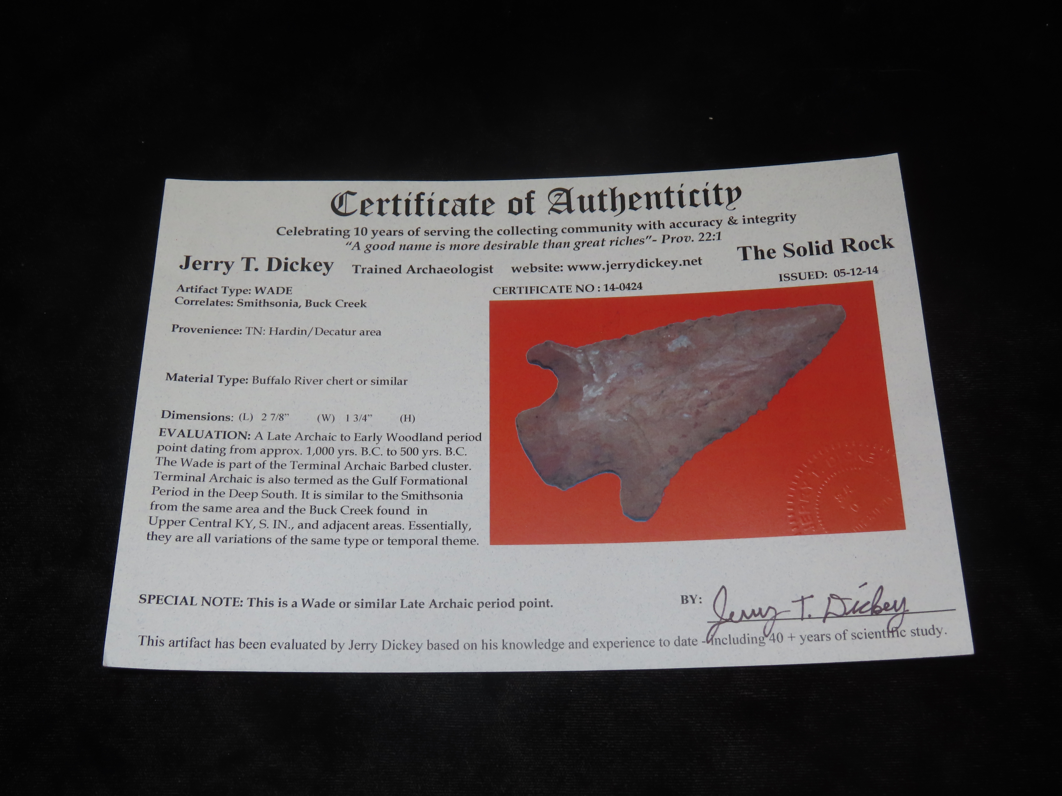 2 7/8″ Buck Creek, Tennessee Harden Decatur area, Buffalo River Chert or Similar,Dickey COA.
