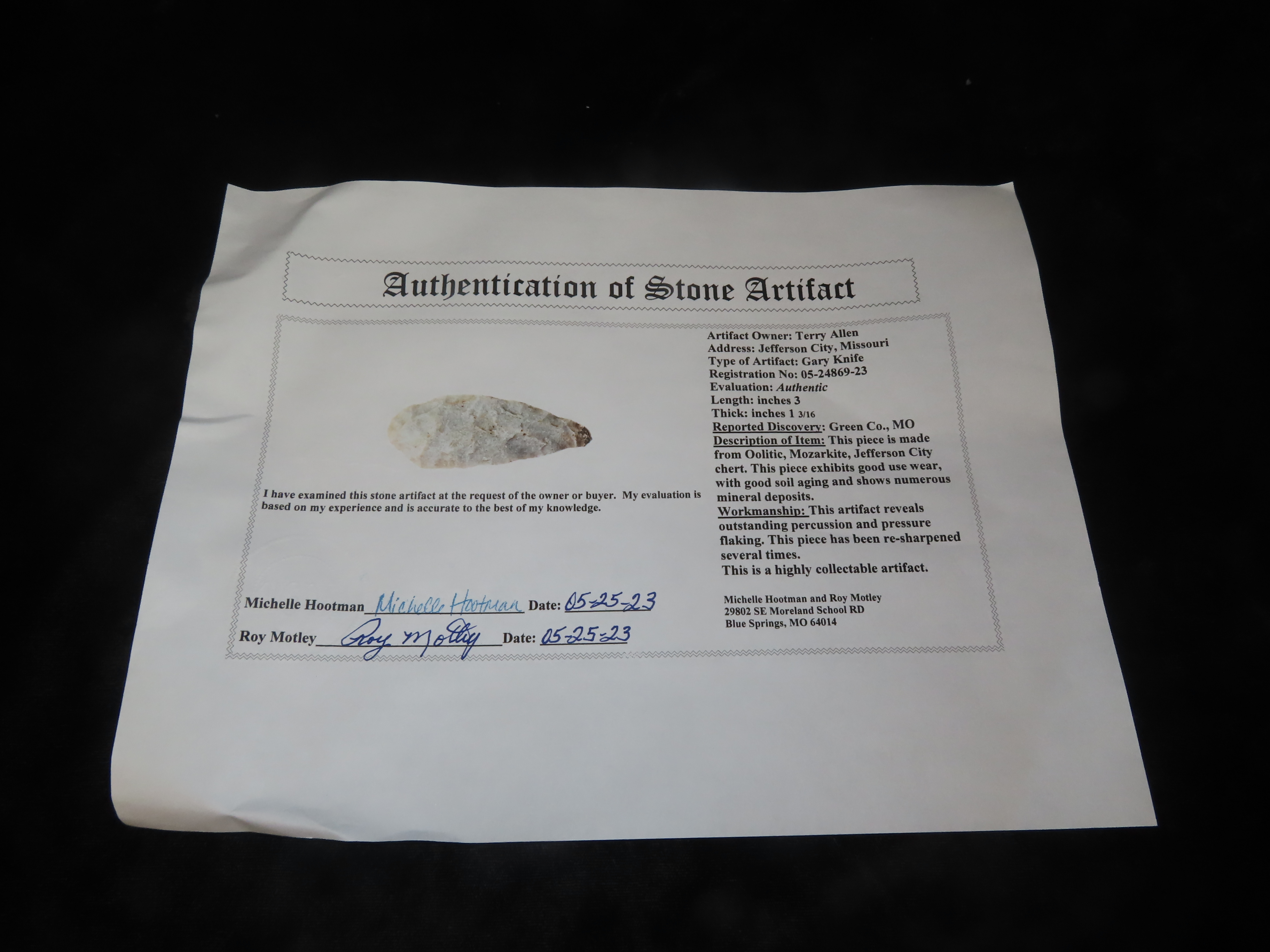 3″ Gary Knife, Motley COA, Green Co, Missouri, Ex Terry Allen Collection