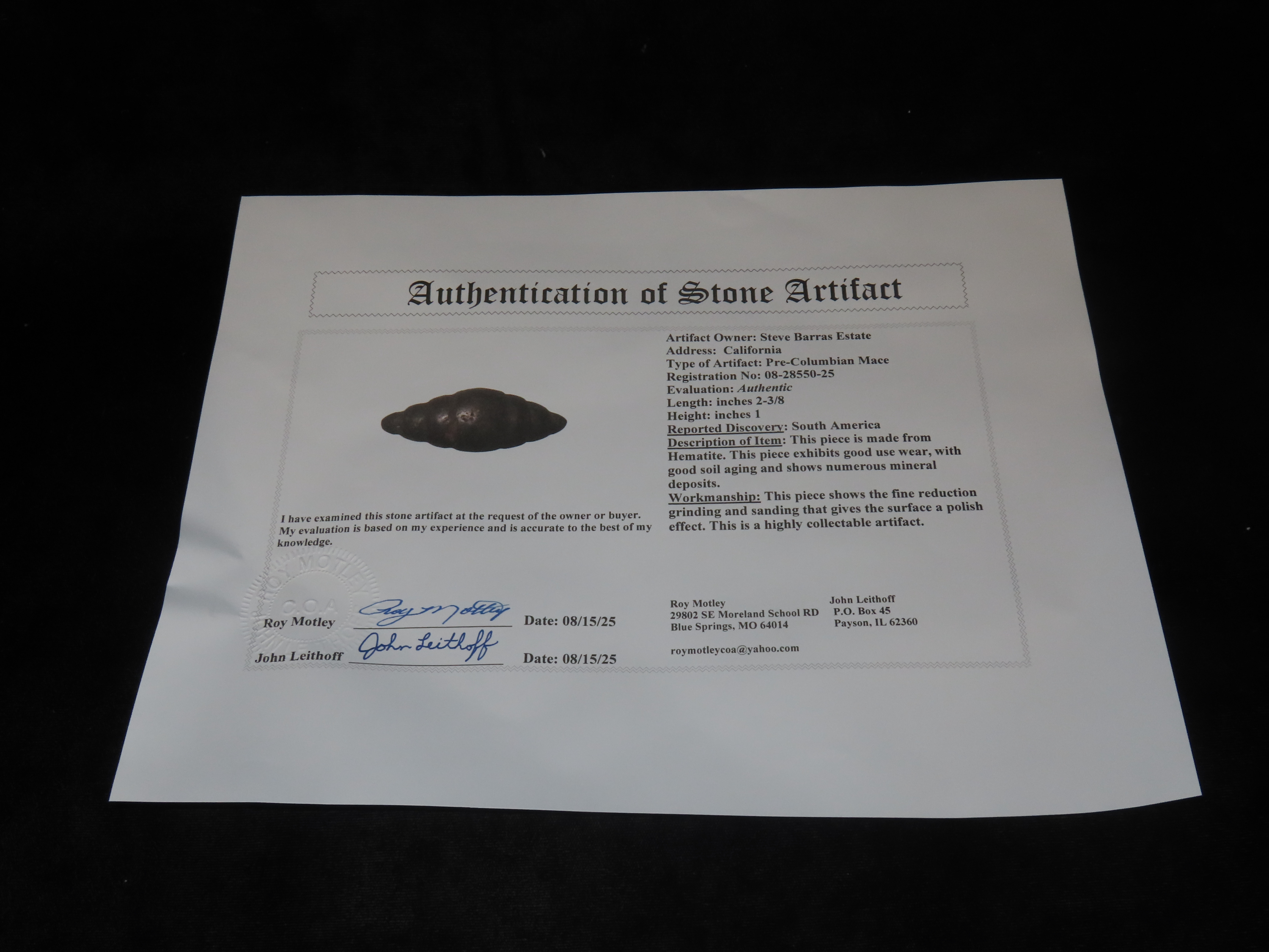 2 3/8″ Pre-Columbian Hematite Mace, Motley COA, found in South America, Ex Steve Barras Estate
