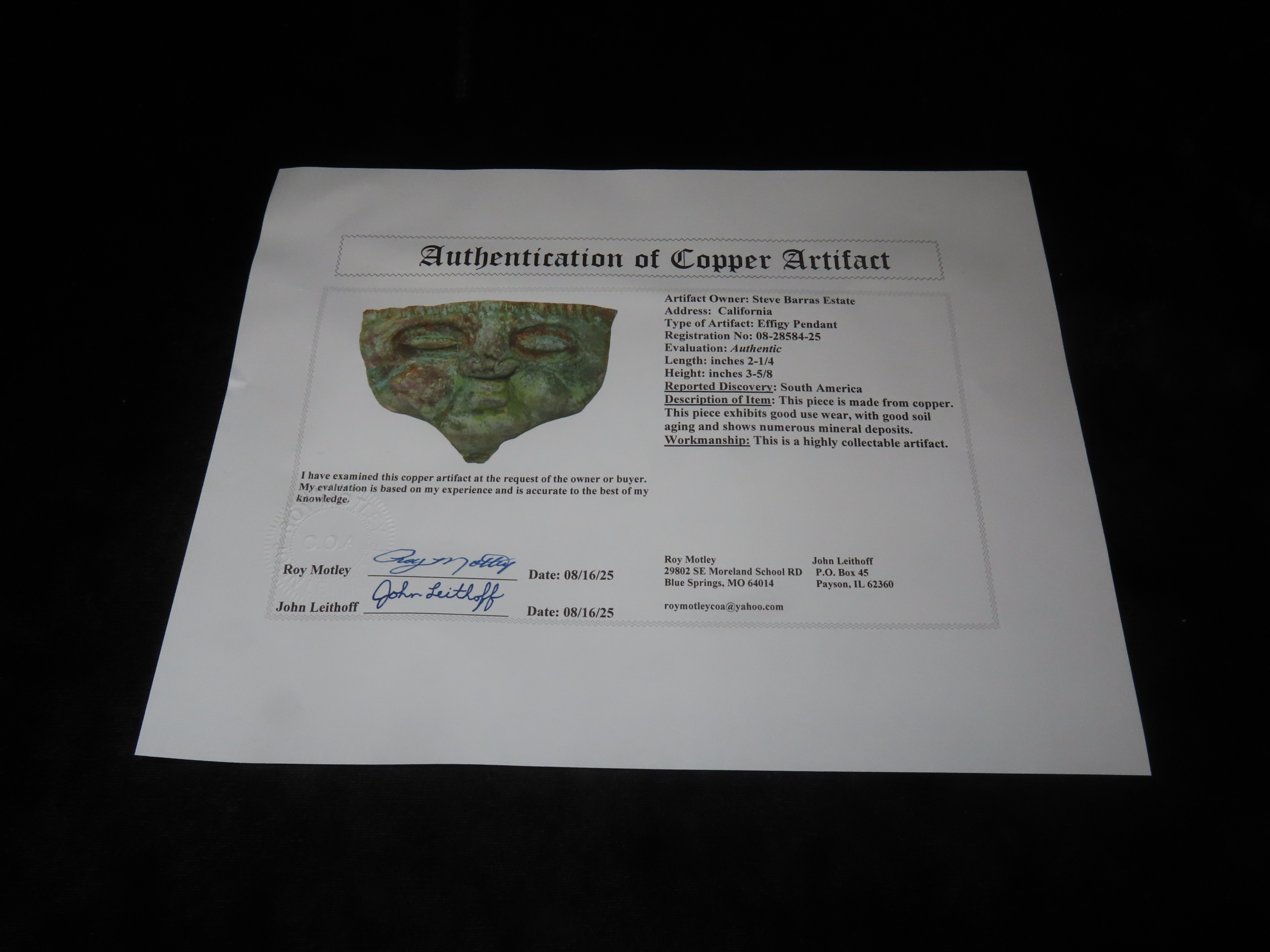 2 1/4" Pre- Columbian Copper Effigy Pendant, Motley COA, found in South America, Ex Steve Barras Estate