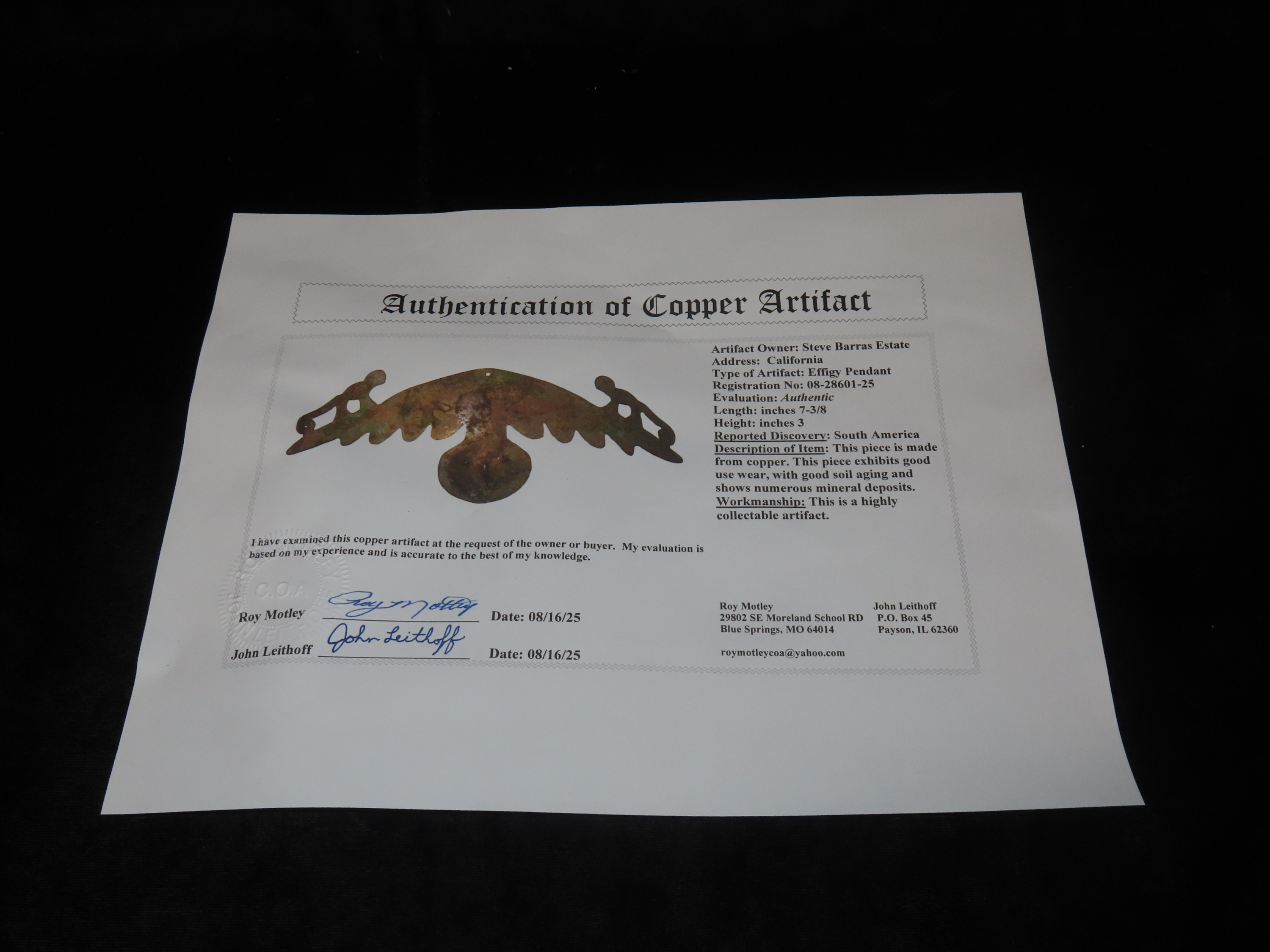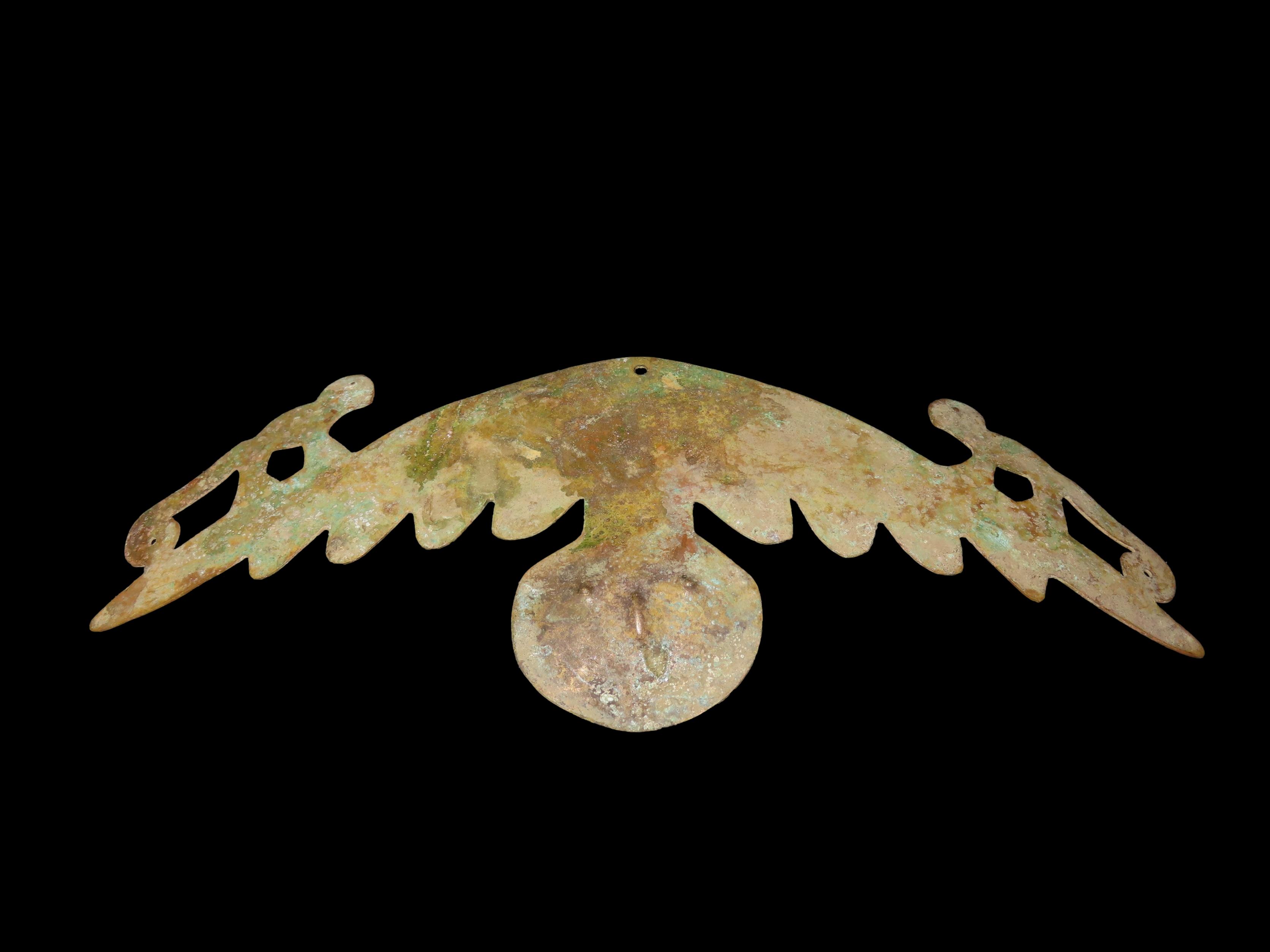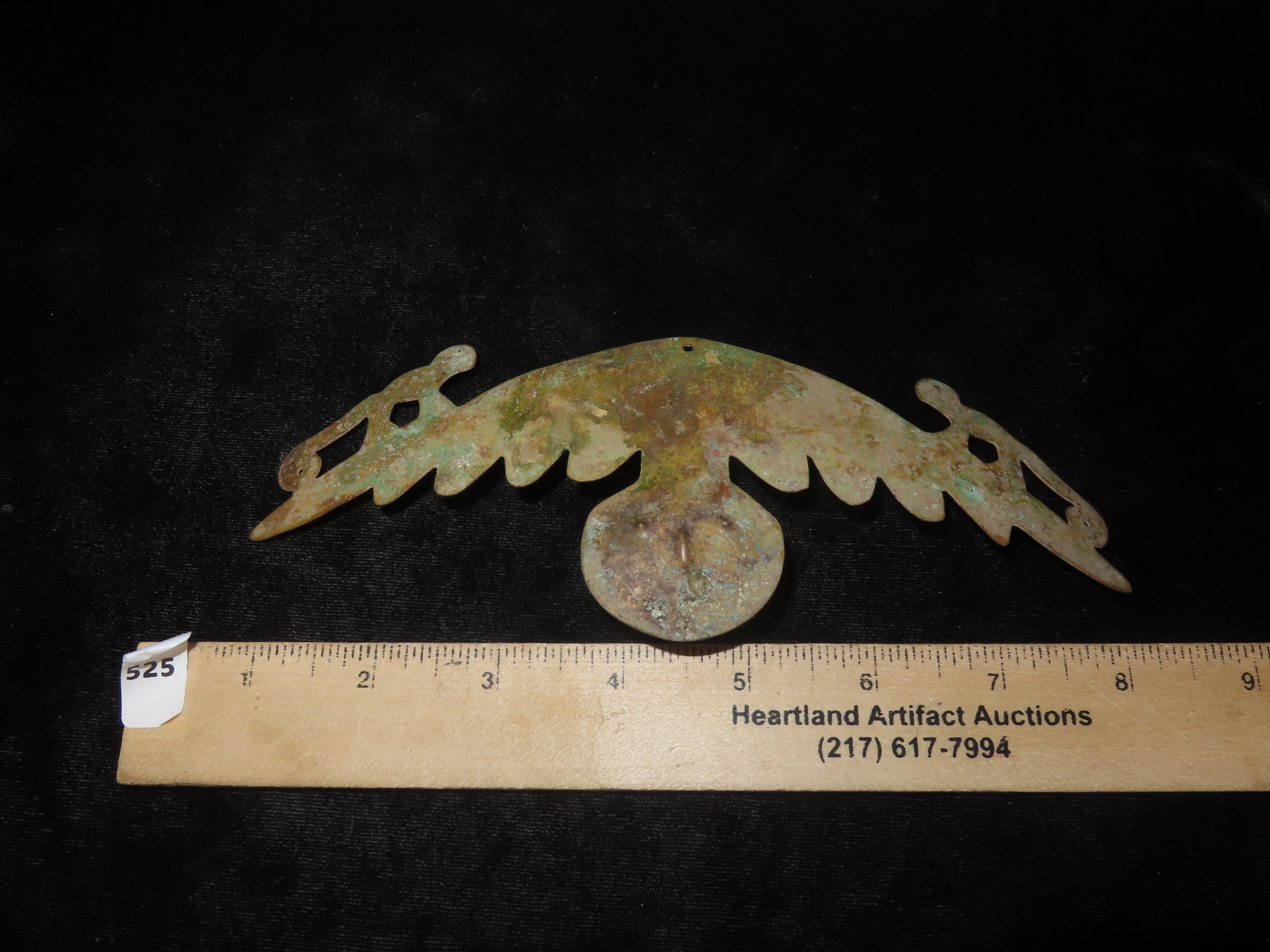 7 3/8″ Pre-Columbian Copper Effigy Pendant/Breast Plate Ornament, Motley COA, found in South America, Ex Steve Barras Estate